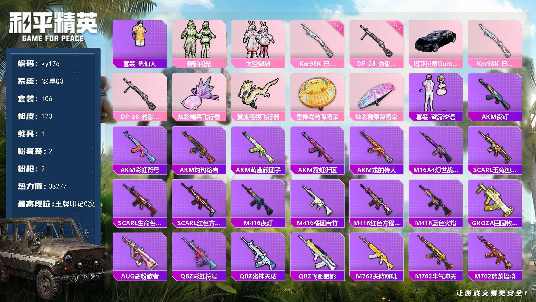 [16873868]安卓 手Q-2粉装-2特效枪-1载具-2粉色飞行器-38277热力值-1王牌印记-106套装-123枪皮