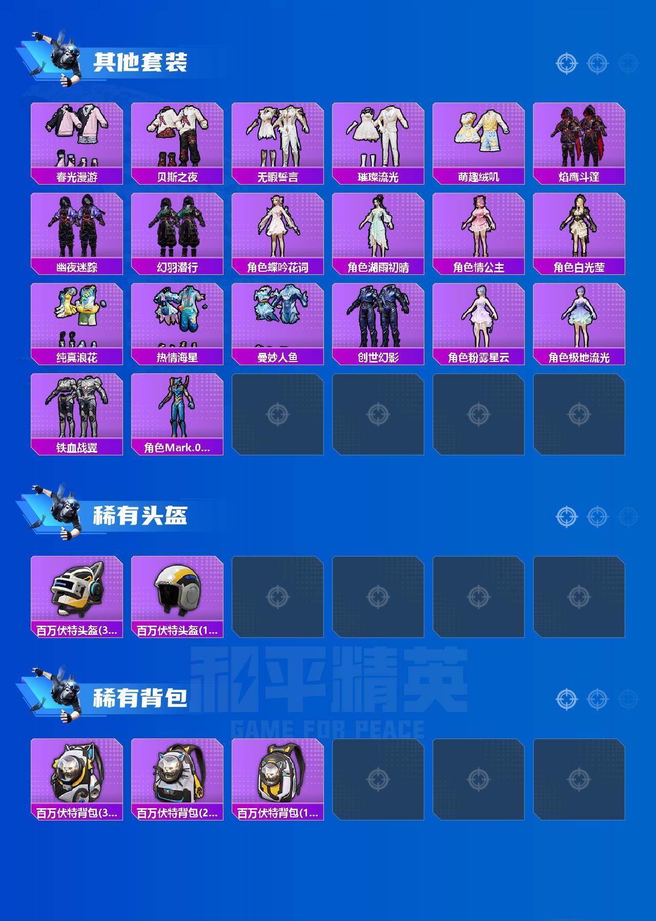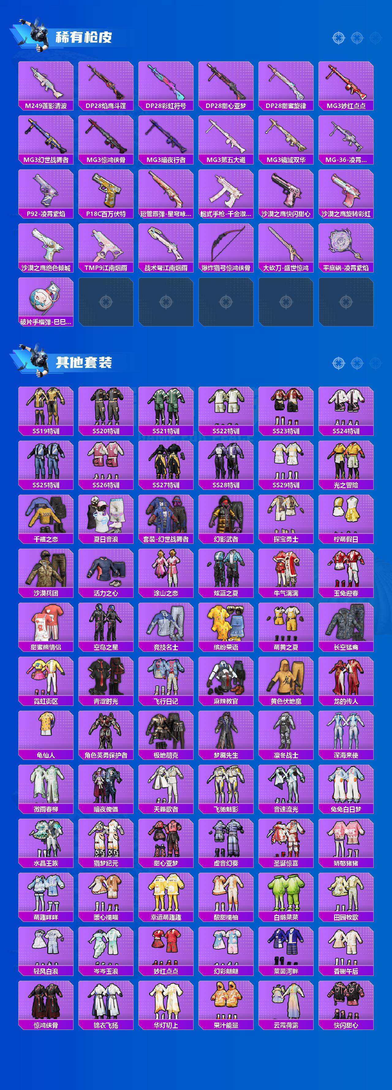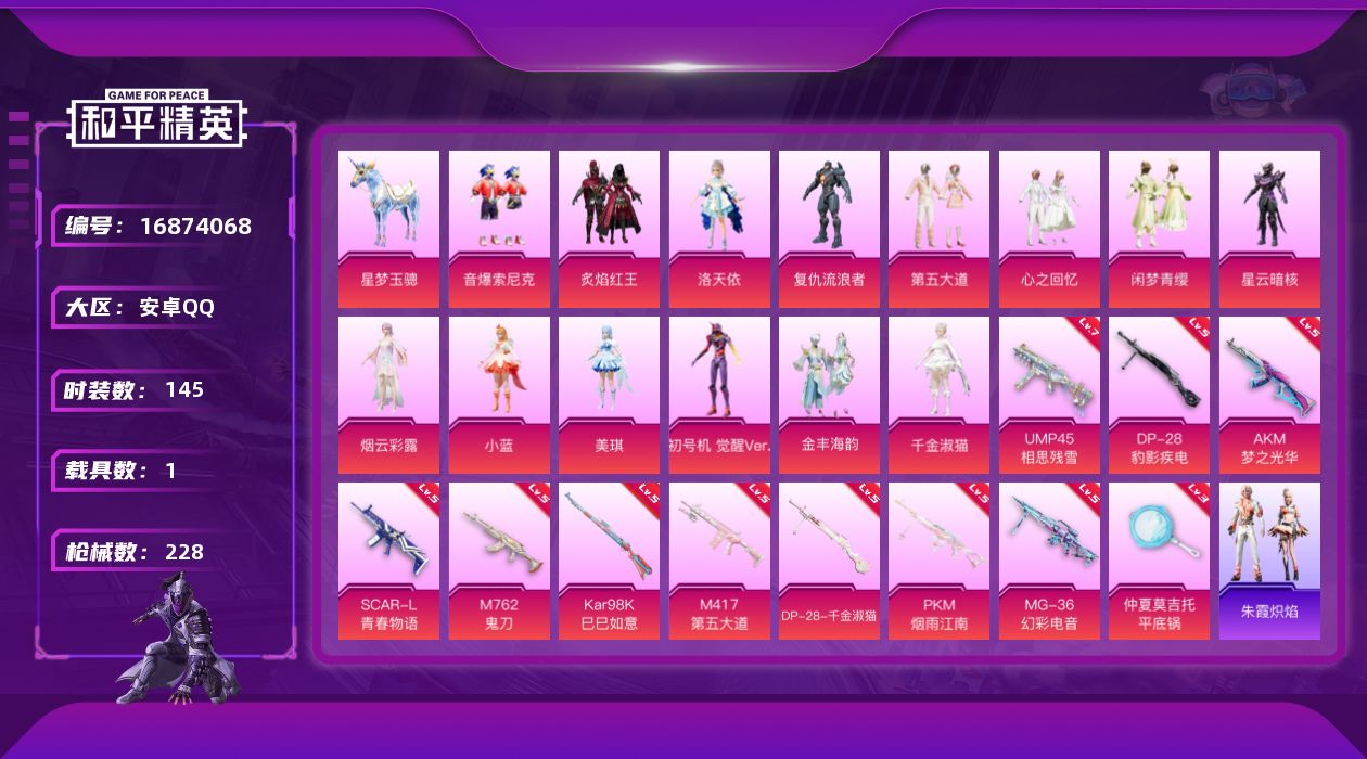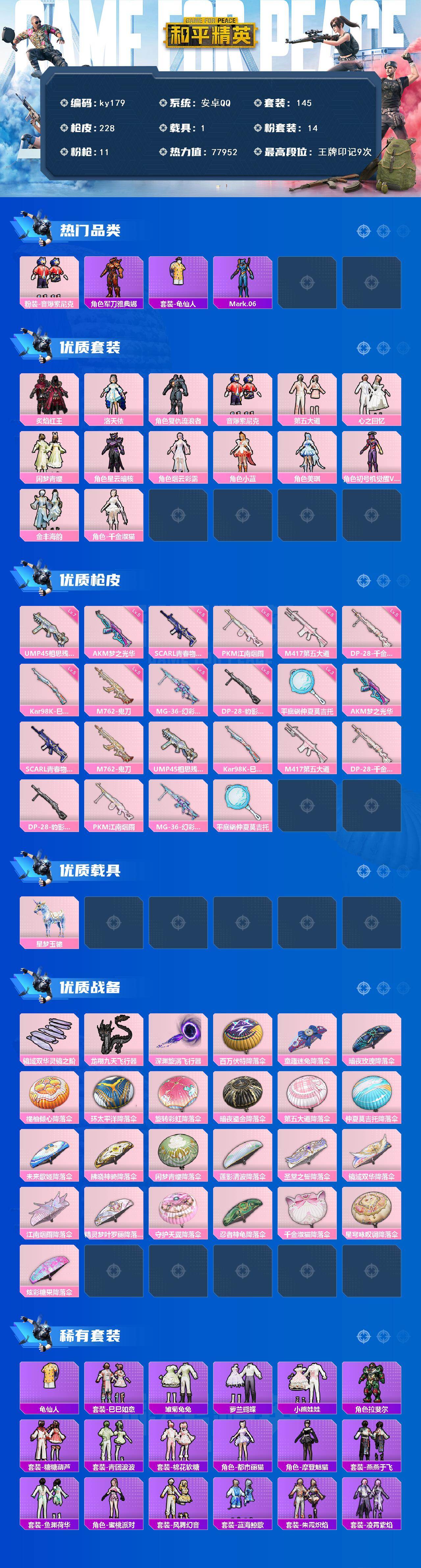 [16874068]安卓 手Q-14粉装-11特效枪-1载具-4粉色飞行器-77952热力值-9王牌印记-145套装-228枪皮 【热门品类】:粉装-音爆索尼克,角色-军刀雅典娜,套装-龟仙人,角色-Mark.06 【粉色套装】:粉装-炙焰红王,角色-洛天依,角色-复仇流浪者,粉装-音爆索尼克,粉装-第五大道,粉装-心之回忆,粉装-闲梦青缨,角色-星云暗核,角色-烟云彩露,角色-小蓝,角色-美琪,角色-初号机 觉醒Ver.,粉装-金丰海韵,角色-千金淑猫 【粉色枪皮等级】:AKM-梦之光华(五级),SCAR-L-青春物语(五级),M762-鬼刀(五级),UMP45-相思残雪(七级),Kar98K-巳巳如意(五级),M417-第五大道(五级),DP-28-千金淑猫(五级),DP-28-豹影疾电(五级),PKM-江南烟雨(五级),MG-36-幻彩电音(五级),平底锅-仲夏莫吉托(三级) 【粉色载具】:星梦玉骢 【粉色枪皮】:AKM-梦之光华,SCAR-L-青春物语,M762-鬼刀,UMP45-相思残雪,Kar98K-巳巳如意,M417-第五大道,DP-28-千金淑猫,DP-28-豹影疾电,PKM-江南烟雨,MG-36-幻彩电音,平底锅-仲夏莫吉托 【粉色飞行器】:镜域双华-灵镜之阶,龙翔九天飞行器,深渊漩涡飞行器 【粉色降落伞】:百万伏特降落伞,童趣迷兔降落伞,暗夜玫瑰降落伞,橘柚倾心降落伞,环太平洋降落伞,旋转彩虹降落伞,暗夜鎏金降落伞,第五大道降落伞,仲夏莫吉托降落伞,未来歌姬降落伞,拂晓神骑降落伞,闲梦青缨降落伞,莲影清波降落伞,圣堂之誓降落伞,镜域双华降落伞,江南烟雨降落伞,精灵梦叶罗丽降落伞,守护天翼降落伞,忍者神龟降落伞,千金淑猫降落伞,星穹咏叹调降落伞,炫彩糖果降落伞 【稀有套装】:套装-龟仙人,套装-巳巳如意,套装-雏菊兔兔,套装-萝兰蝴蝶,套装-小熊娃娃,角色-拉斐尔,套装-糖糖葫芦,套装-青团波波,套装-棉花软糖,角色-都市丽猫,角色-摩登魅猫,套装-燕燕于飞,套装-鱼渊荷华,角色-蜜桃派对,套装-风舞幻音,套装-蓝海鲸歌,套装-朱霞炽焰,套装-凌霄紫焰 【稀有枪皮】:AKM-墨染幽兰,AKM-彩虹符号,AKM-江南烟雨,AKM-灼热熔岩,AKM-环太平洋,AKM-筑梦精灵,AKM-胡桃卫兵,AKM-龙的传人,M16A4-幻世战舞者,M16A4-甜心亚梦,M16A4-
