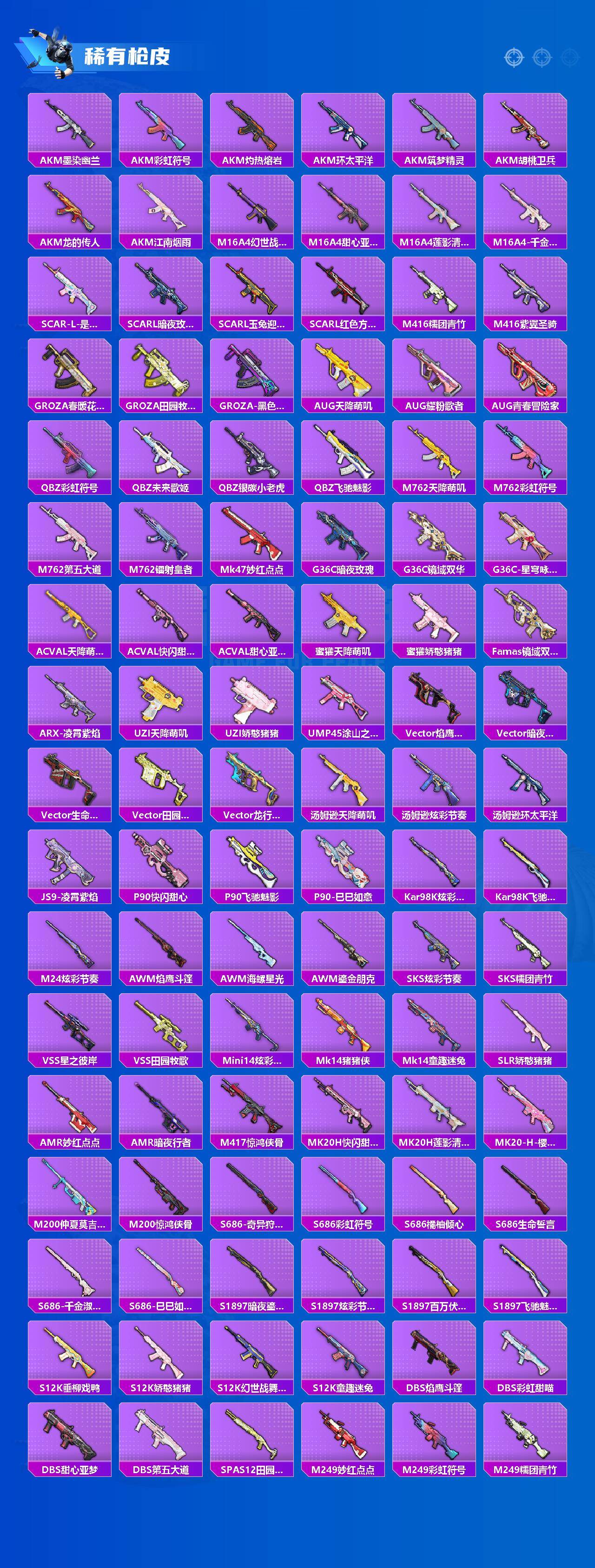 【稀有枪皮】:AKM-墨染幽兰,AKM-彩虹符号,AKM-江南烟雨,AKM-灼热熔岩,AKM-环太平洋,AKM-筑梦精灵,AKM-胡桃卫兵,AKM-龙的传人,M16A4-幻世战舞者,M16A4-甜心亚梦,M16A4-