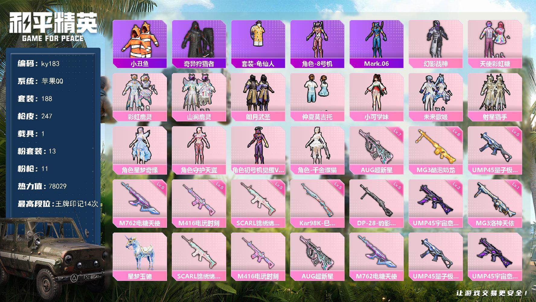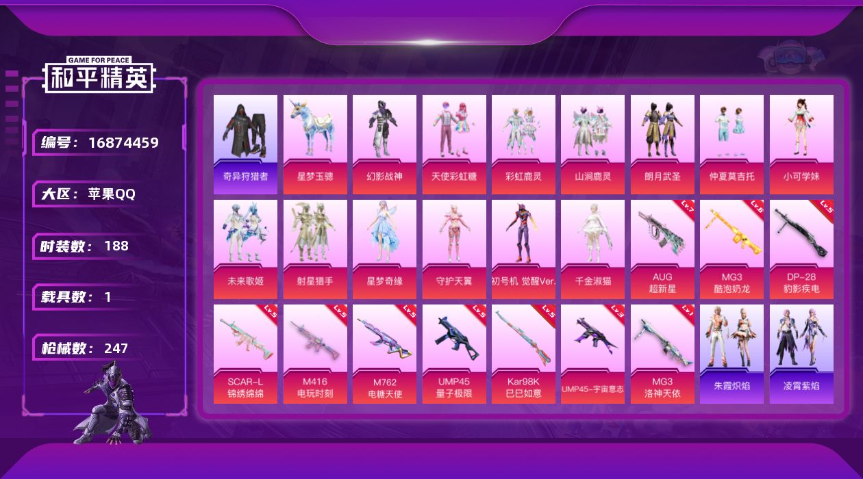 [16874459]苹果 手Q-13粉装-11特效枪-1载具-4粉色飞行器-78029热力值-14王牌印记-188套装-247枪皮