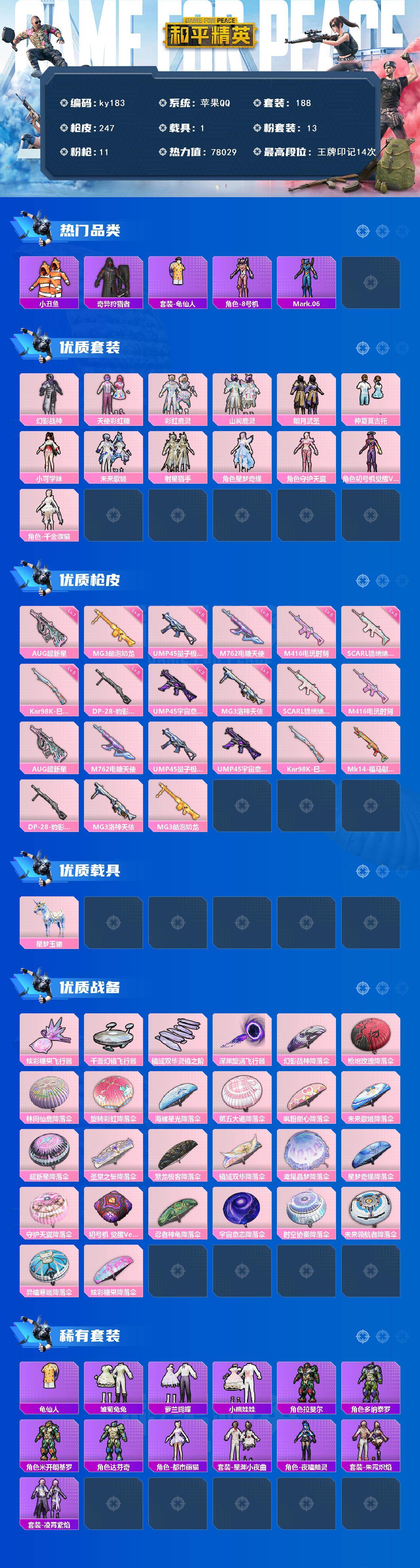 [16874459]苹果 手Q-13粉装-11特效枪-1载具-4粉色飞行器-78029热力值-14王牌印记-188套装-247枪皮 【热门品类】:套装-小丑鱼,套装-奇异狩猎者,套装-龟仙人,角色-8号机,角色-Mark.06 【粉色套装】:粉装-幻影战神,粉装-天使彩虹糖,粉装-彩虹鹿灵,粉装-山涧鹿灵,粉装-朗月武圣,粉装-仲夏莫吉托,角色-小可学妹,粉装-未来歌姬,粉装-射星猎手,角色-星梦奇缘,角色-守护天翼,角色-初号机 觉醒Ver.,角色-千金淑猫 【粉色枪皮等级】:SCAR-L-锦绣绵绵(五级),M416-电玩时刻(五级),AUG-超新星(七级),M762-电糖天使(五级),UMP45-量子极限(五级),UMP45-宇宙意志(三级),Kar98K-巳巳如意(五级),DP-28-豹影疾电(五级),MG3-洛神天依(一级),MG3-酷泡奶龙(六级) 【粉色载具】:星梦玉骢 【粉色枪皮】:SCAR-L-锦绣绵绵,M416-电玩时刻,AUG-超新星,M762-电糖天使,UMP45-量子极限,UMP45-宇宙意志,Kar98K-巳巳如意,Mk14-福马献瑞,DP-28-豹影疾电,MG3-洛神天依,MG3-酷泡奶龙 【粉色飞行器】:炫彩糖果飞行器,千面幻镜飞行器,镜域双华-灵镜之阶,深渊漩涡飞行器 【粉色降落伞】:幻影战神降落伞,枪炮玫瑰降落伞,林间仙鹿降落伞,旋转彩虹降落伞,海螺星光降落伞,第五大道降落伞,飒粉甜心降落伞,未来歌姬降落伞,超新星降落伞,圣堂之誓降落伞,繁龙极客降落伞,镜域双华降落伞,鸢尾晶梦降落伞,星梦奇缘降落伞,守护天翼降落伞,初号机 觉醒Ver.降落伞,忍者神龟降落伞,宇宙意志降落伞,时空协奏降落伞,未来领航者降落伞,异瞳寒姬降落伞,炫彩糖果降落伞 【稀有套装】:套装-龟仙人,套装-炫彩糖果,套装-雏菊兔兔,套装-萝兰蝴蝶,套装-小熊娃娃,角色-拉斐尔,角色-多纳泰罗,角色-米开朗基罗,角色-达芬奇,角色-都市丽猫,套装-星渊小夜曲,角色-夜瞳黯灵,套装-朱霞炽焰,套装-凌霄紫焰 【稀有枪皮】:AKM-奇异狩猎者,AKM-彩虹符号,AKM-破晓战魂,AKM-胡桃卫兵,AKM-虎虎生威,AKM-龙的传人,M16A4-幻世战舞者,M16A4-甜心亚梦,SCAR-L-夜灯,SCAR-L-玉兔迎春,SCAR-L-红色方程式,SCAR-L-黄金龙骨,M416-糯团青竹,