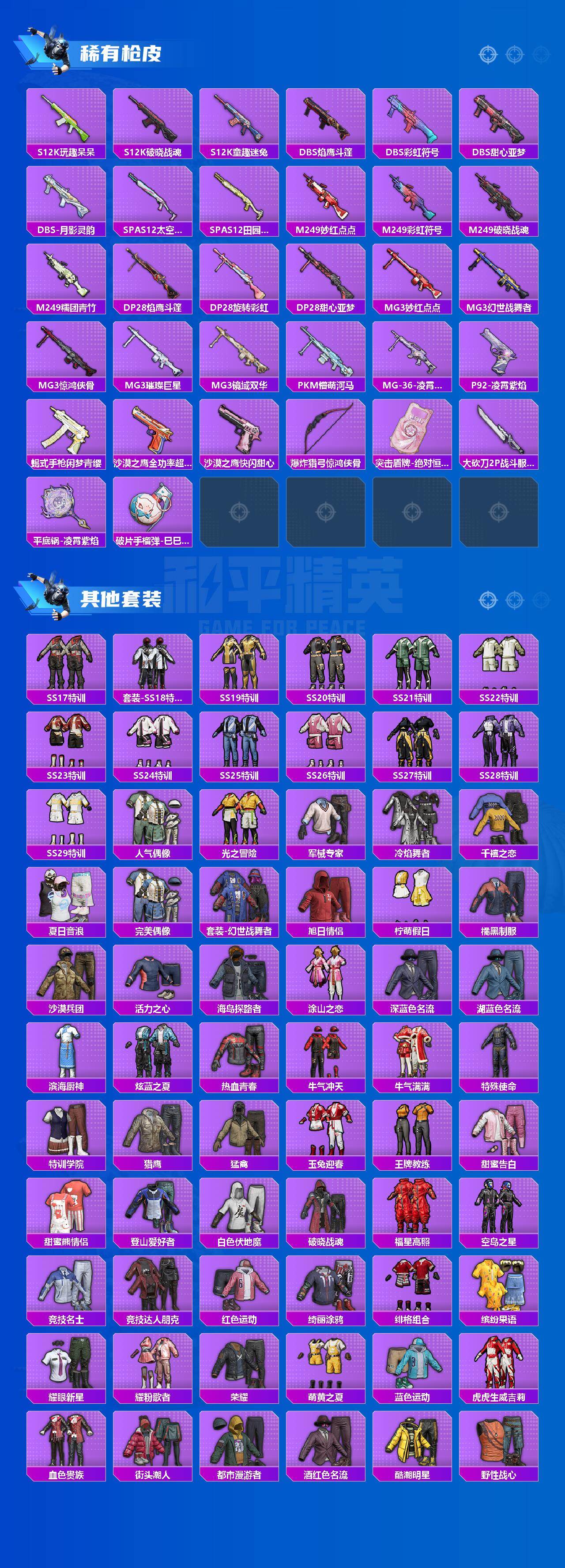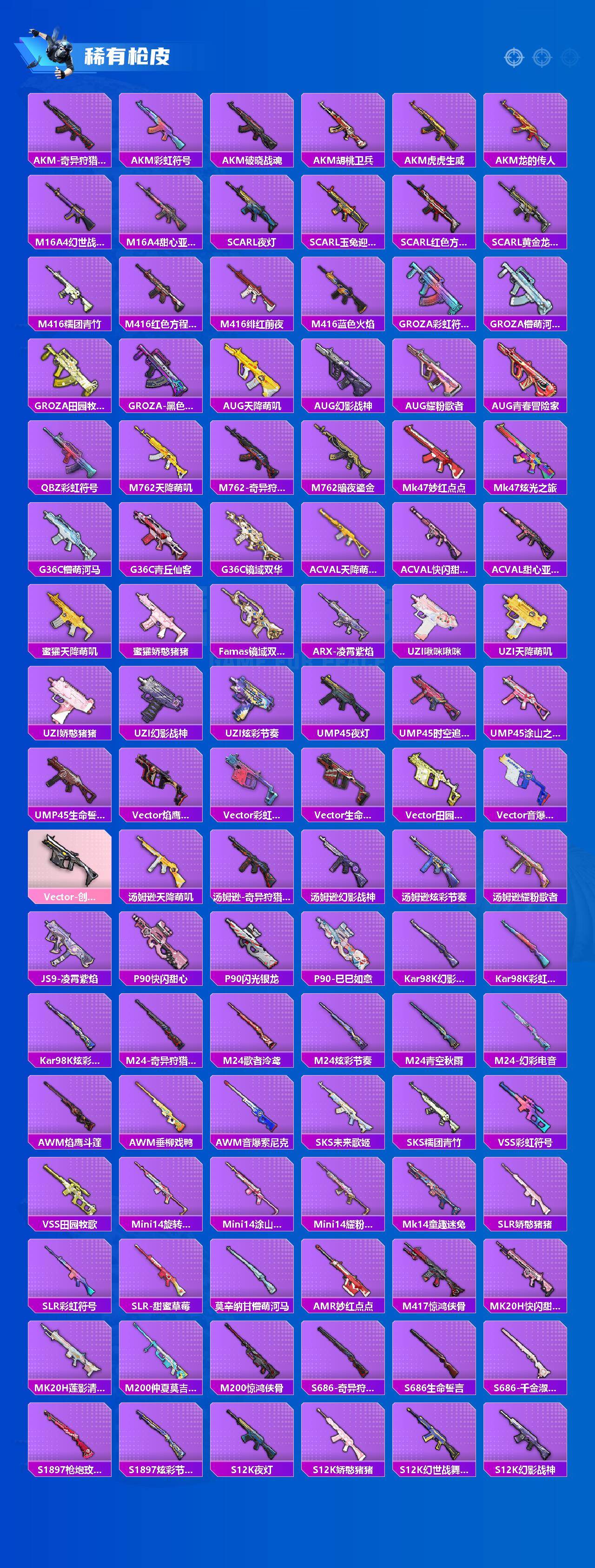【稀有枪皮】:AKM-奇异狩猎者,AKM-彩虹符号,AKM-破晓战魂,AKM-胡桃卫兵,AKM-虎虎生威,AKM-龙的传人,M16A4-幻世战舞者,M16A4-甜心亚梦,SCAR-L-夜灯,SCAR-L-玉兔迎春,SCAR-L-红色方程式,SCAR-L-黄金龙骨,M416-糯团青竹,