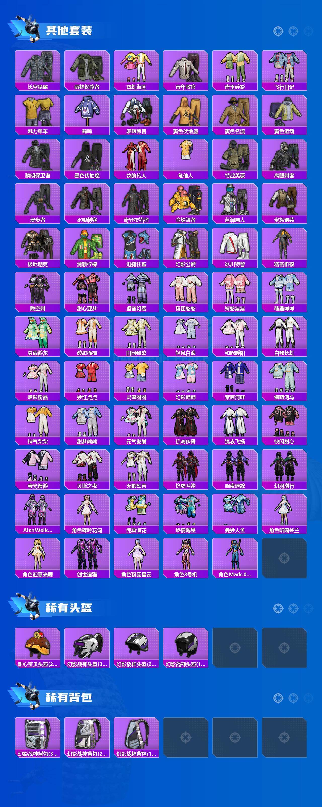 套装-奇异狩猎者,套装-幻影战神,套装-天使彩虹糖,套装-彩虹鹿灵,套装-山涧鹿灵,套装-朗月武圣,套装-仲夏莫吉托,角色-小可学妹,套装-未来歌姬,套装-射星猎手,角色-星梦奇缘,角色-守护天翼,角色-觉醒初号机,角色-千金淑猫,套装-鹰眼刺客,套装-迅捷狂鲨