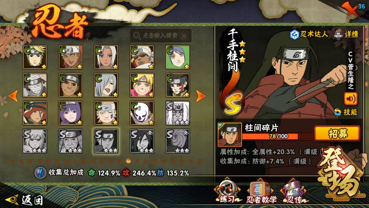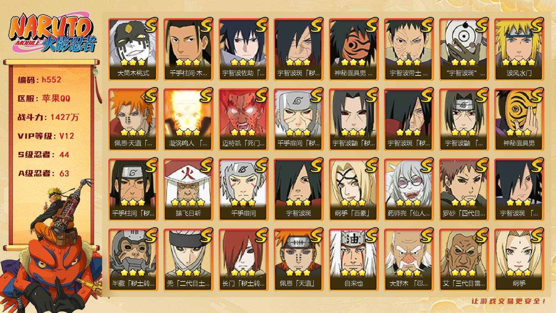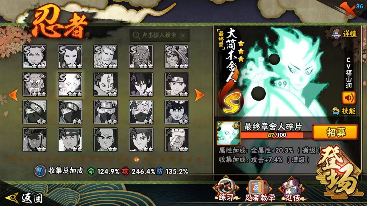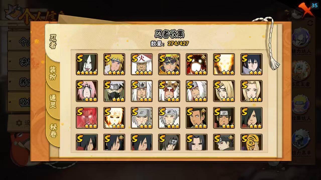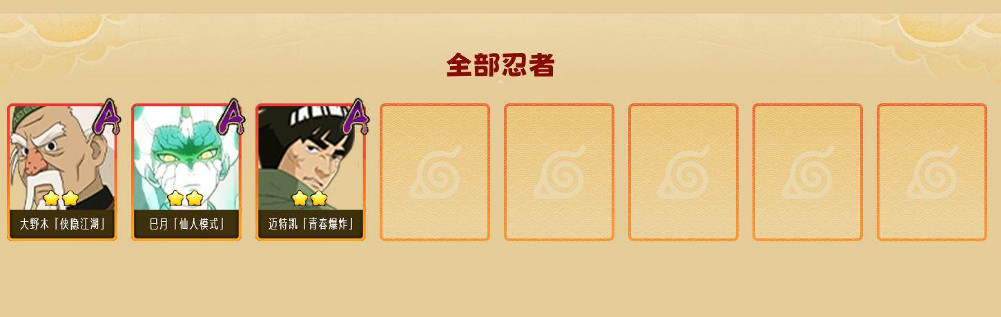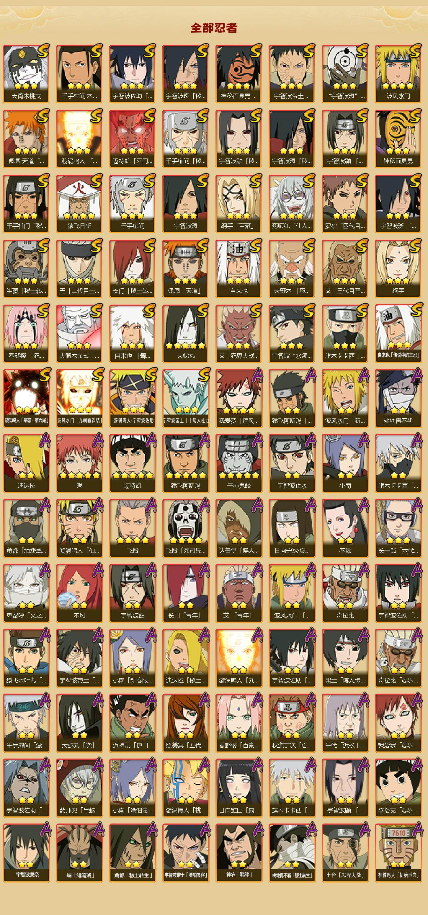【S级忍者】:长门「秽土转生」(3星),半藏「秽土转生」(3星),千手扉间「秽土转生」(3星),千手柱间「秽土转生」(3星),宇智波鼬「秽土转生」(3星),宇智波斑「秽土转生」(3星),宇智波斑「秽土转生·解」(3星),大野木「忍界大战」(3星),春野樱「忍界大战」(3星),宇智波带土「忍界大战」(3星),艾「忍界大战」(3星),宇智波鼬「须佐能乎」(3星),宇智波止水「须佐能乎」(3星),旗木卡卡西「须佐能乎」(3星),宇智波斑「木叶创立」(3星),千手柱间「木叶创立」(3星),无「二代目土影」(3星),罗砂「四代目风影」(3星),艾「三代目雷影」(3星),自来也(3星),自来也「舞之豪杰」(3星),大蛇丸(5星),自来也「传说中的三忍」(3星),纲手(3星),纲手「百豪」(3星),千手扉间(3星),猿飞日斩(4星),宇智波斑(3星),波风水门(4星),药师兜「仙人模式」(3星),神秘面具男(3星),神秘面具男「红夜之刃」(3星),漩涡鸣人「九喇嘛连结」(3星),迈特凯「死门」(3星),佩恩「天道」(3星),佩恩·天道「超」(3星),宇智波佐助「永恒万花筒」(3星),宇智波斑 「白面具」(3星宇智波斑「白面具」),大筒木金式(3星),大筒木桃式(3星),漩涡鸣人「暴怒·第六尾」(3星),波风水门「九喇嘛连结」(3星),漩涡鸣人·宇智波佐助(3星),宇智波带土「十尾人柱力」(3星)