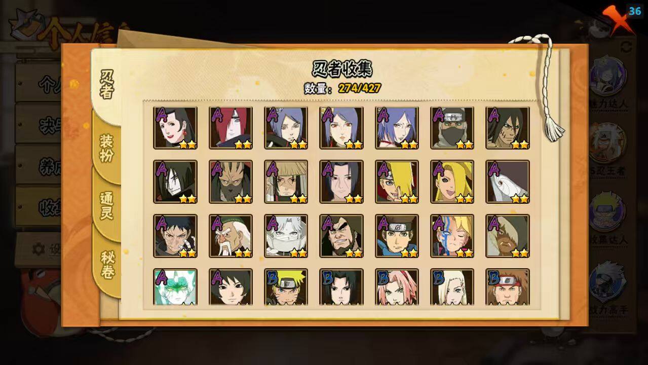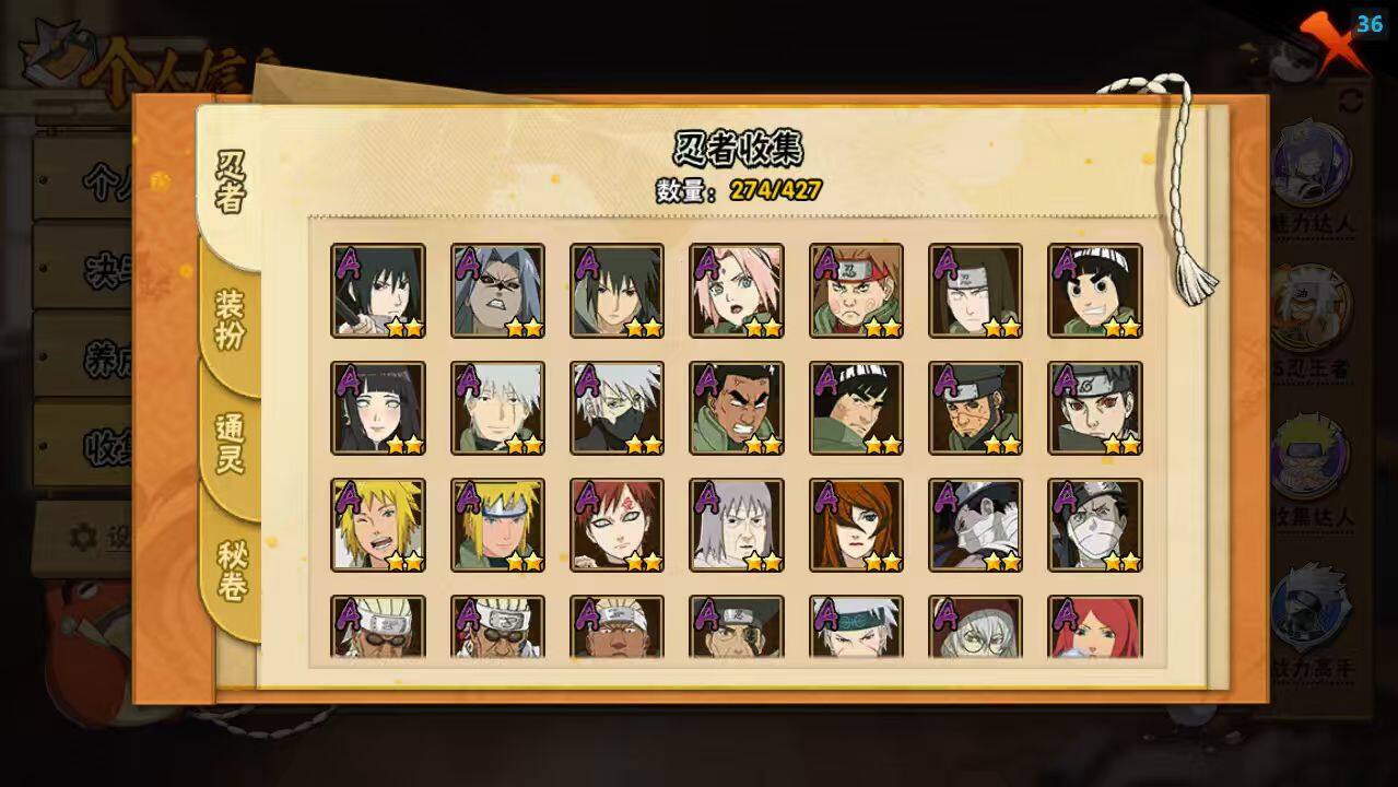 【A级忍者】:艾「青年」(2星),长门「青年」(2星),波风水门「青年」(2星),波风水门「新春限定」(2星),达鲁伊「博人传」(2星),迪达拉(2星),迪达拉「秽土转生」(2星),大蛇丸「晓」(2星),奇拉比(2星),奇拉比「忍界大战」(2星),飞段(4星),飞段「死司凭血」(4星),干柿鬼鲛(5星),漩涡博人「桃式显现」(2星),漩涡鸣人「仙人模式」(2星),漩涡鸣人「九尾查克拉」(2星),机械鸣人「初始形态」(2星),迈特凯(5星),迈特凯「惊门」(2星),旗木卡卡西「万花筒写轮眼」(2星),旗木卡卡西「幻之真容」(2星),桃地再不斩(2星),桃地再不斩「秽土转生」(2星),我爱罗「疾风传」(4星),我爱罗「忍界大战」(2星),蝎(5星),蝎「绯流琥」(2星),小南(2星),小南「新春限定」(2星),小南「漂泊浪客」(2星),角都「地怨虞」(2星)