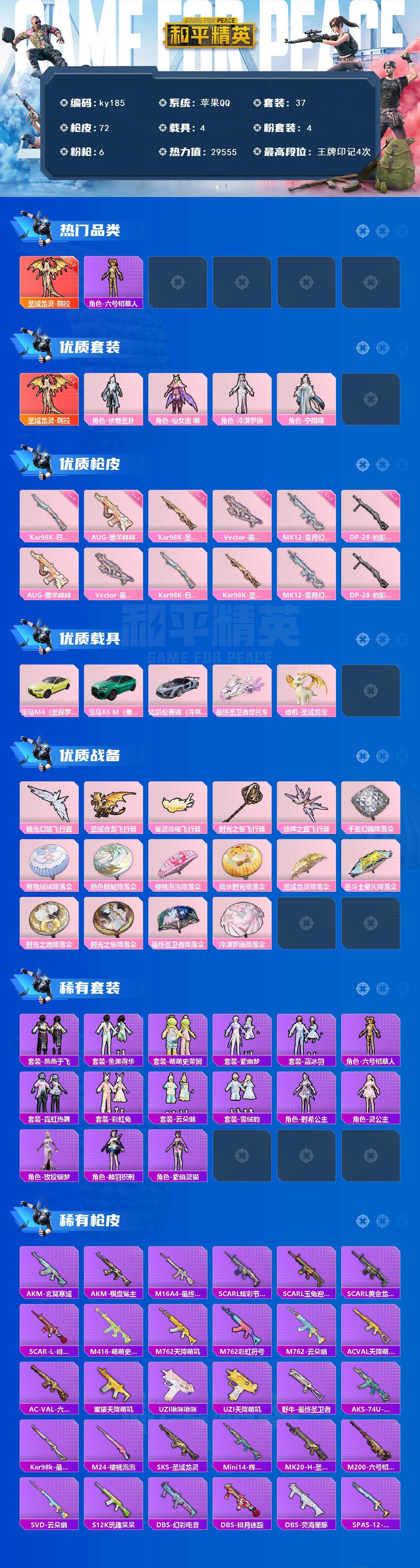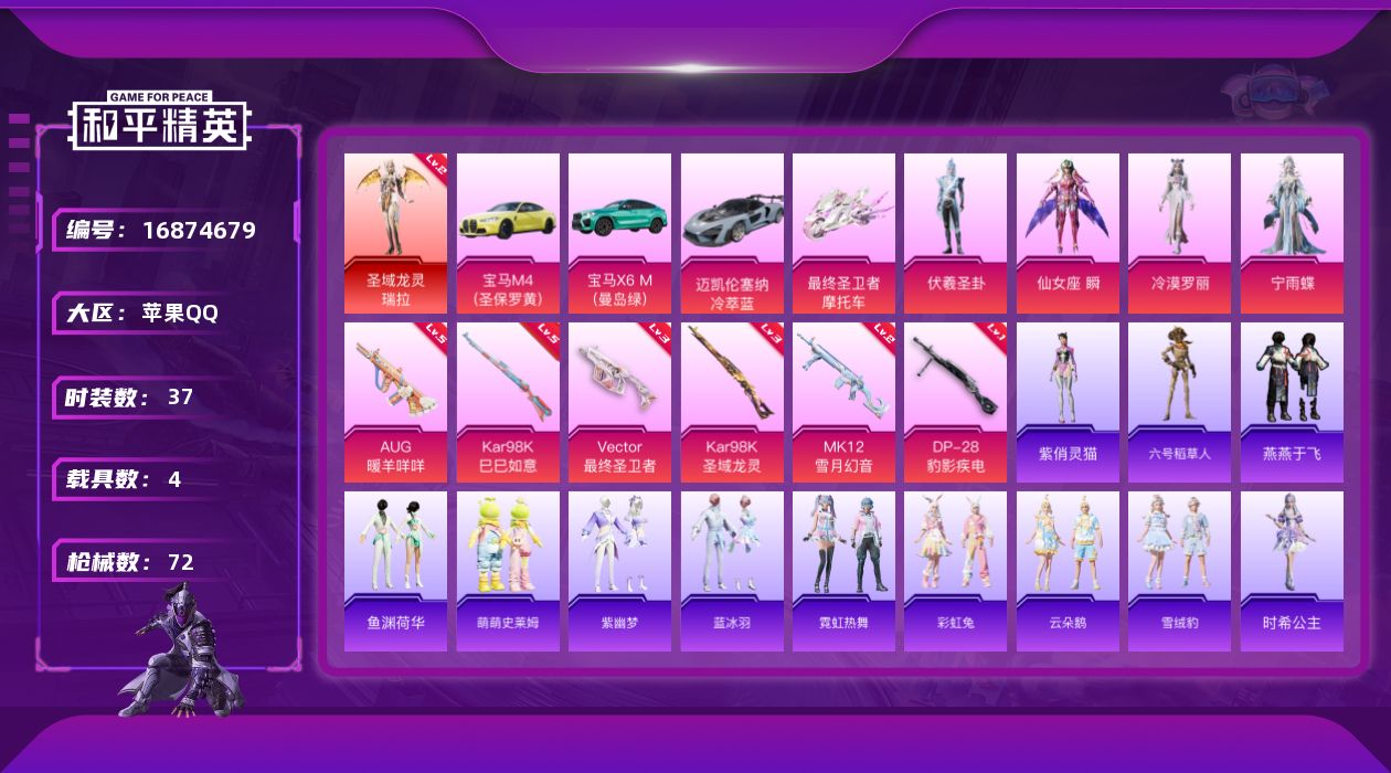 [16874679]苹果 手Q-1神装-4粉装-6特效枪-4载具-5粉色飞行器-29555热力值-4王牌印记-37套装-72枪皮 【红色神装等级】:圣域龙灵-瑞拉(二级) 【红色角色神装】:圣域龙灵-瑞拉 【热门品类】:角色-六号稻草人 【粉色套装】:角色-伏羲圣卦,角色-仙女座 瞬,角色-冷漠罗丽,角色-宁雨蝶 【粉色枪皮等级】:AUG-暖羊咩咩(五级),Vector-最终圣卫者(三级),汤姆逊-星月云朵(二级MK12-雪月幻音),Kar98K-巳巳如意(五级),Kar98K-圣域龙灵(三级),DP-28-豹影疾电(一级) 【粉色载具】:宝马M4(圣保罗黄),宝马X6 M(曼岛绿),迈凯伦塞纳(冷萃蓝),最终圣卫者摩托车,僚机-圣域龙宝 【粉色枪皮】:AUG-暖羊咩咩,Vector-最终圣卫者,Kar98K-巳巳如意,Kar98K-圣域龙灵,MK12-雪月幻音,DP-28-豹影疾电 【粉色飞行器】:镜光幻境飞行翼,圣域金龙飞行器,雀灵庇佑飞行器,时光之誓飞行器,终晖之翼飞行器 【粉色降落伞】:千面幻镜降落伞,萌物绒绒降落伞,绝色倾城降落伞,樱桃泡泡降落伞,戏水时光降落伞,圣域龙灵降落伞,圣斗士星矢降落伞,时光之吻降落伞,时光之誓降落伞,最终圣卫者降落伞,冷漠罗丽降落伞 【稀有套装】:套装-燕燕于飞,套装-鱼渊荷华,套装-萌萌史莱姆,套装-紫幽梦,套装-蓝冰羽,角色-六号稻草人,套装-霓虹热舞,套装-彩虹兔,套装-云朵鹅,套装-雪绒豹,角色-时希公主,角色-灵公主,角色-玫纹锢梦,角色-黯羽织刑,角色-紫俏灵猫 【稀有枪皮】:AKM-玄冥寒域,AKM-棋盘冕主,M16A4-最终圣卫者,SCAR-L-炫彩节奏,SCAR-L-玉兔迎春,SCAR-L-黄金龙骨,SCAR-L-绯月迷踪,M416-萌萌史莱姆,M762-天降萌叽,M762-彩虹符号,M762-云朵鹅,AC-VAL-天降萌叽,AC-VAL-六号稻草人,蜜獾-天降萌叽,UZI-啾咪啾咪,UZI-天降萌叽,野牛-最终圣卫者,AKS-74U-辉羽雀灵,Kar98k-最终圣卫者,M24-樱桃泡泡,SKS-圣域龙灵,Mini14-辉羽雀灵,MK20-H-圣域龙灵,M200-六号稻草人,SVD-云朵鹅,S12K-玩趣呆呆,DBS-绯月迷踪,DBS-荧海星豚,DBS-幻彩电音,SPAS-12-云朵鹅,M249-萌萌史莱姆,DP-28-彩虹符号