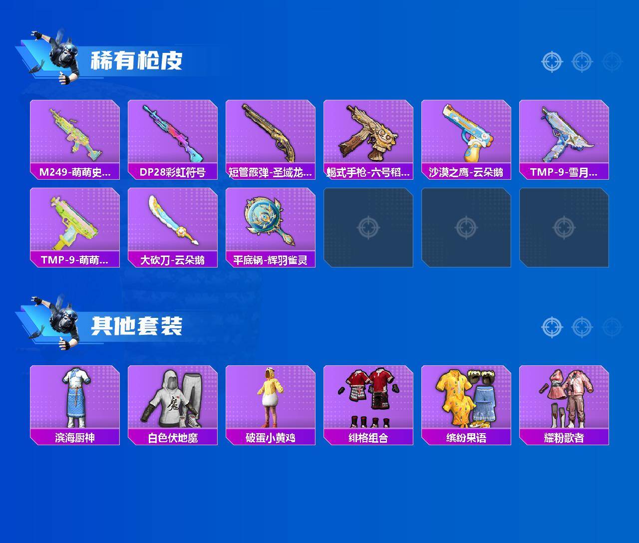 【稀有枪皮】:AKM-玄冥寒域,AKM-棋盘冕主,M16A4-最终圣卫者,SCAR-L-炫彩节奏,SCAR-L-玉兔迎春,SCAR-L-黄金龙骨,SCAR-L-绯月迷踪,M416-萌萌史莱姆,M762-天降萌叽,M762-彩虹符号,M762-云朵鹅,AC-VAL-天降萌叽,AC-VAL-六号稻草人,蜜獾-天降萌叽,UZI-啾咪啾咪,UZI-天降萌叽,野牛-最终圣卫者,AKS-74U-辉羽雀灵,Kar98k-最终圣卫者,M24-樱桃泡泡,SKS-圣域龙灵,Mini14-辉羽雀灵,MK20-H-圣域龙灵,M200-六号稻草人,SVD-云朵鹅,S12K-玩趣呆呆,DBS-绯月迷踪,DBS-荧海星豚,DBS-幻彩电音,SPAS-12-云朵鹅,M249-萌萌史莱姆,DP-28-彩虹符号