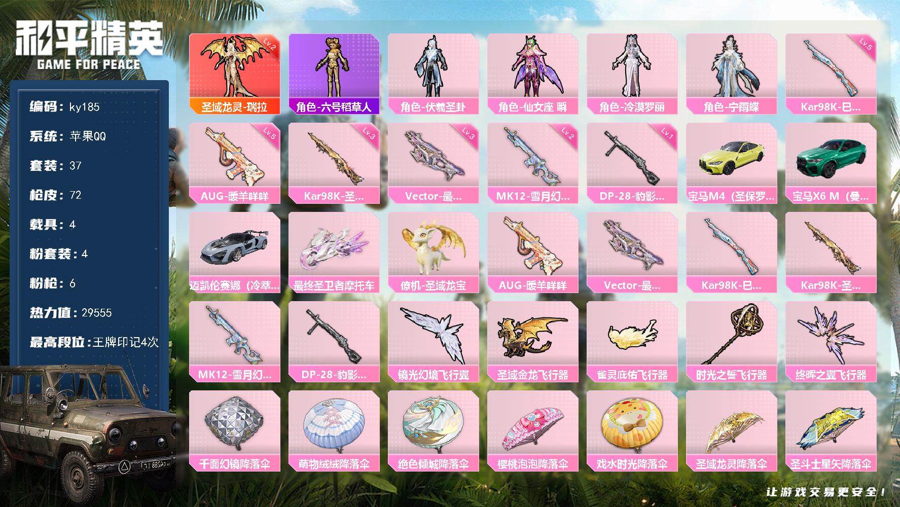 [16874679]苹果 手Q-1神装-4粉装-6特效枪-4载具-5粉色飞行器-29555热力值-4王牌印记-37套装-72枪皮
