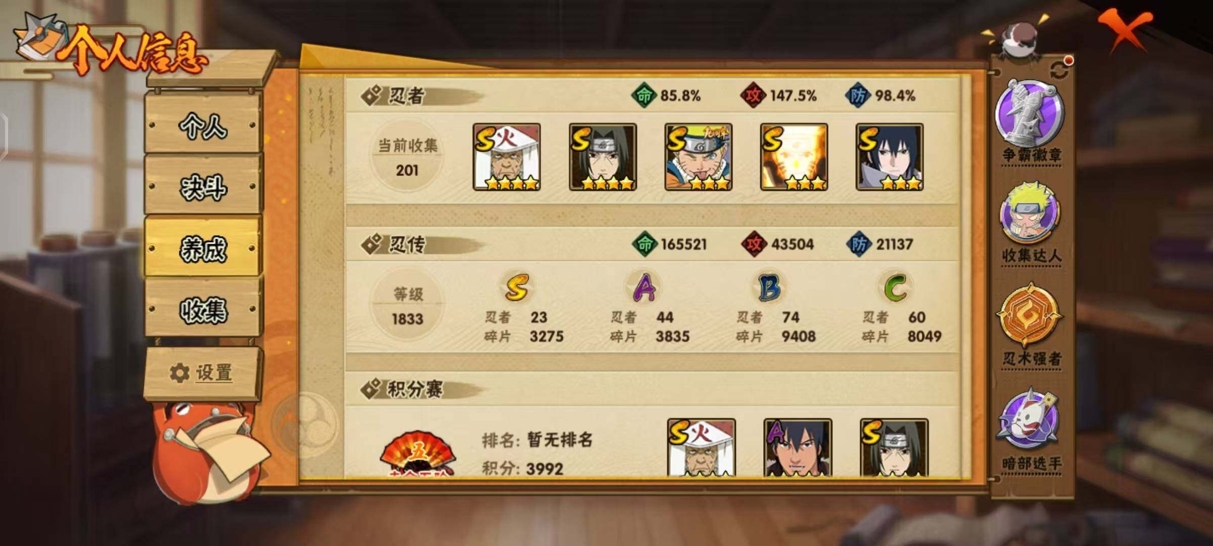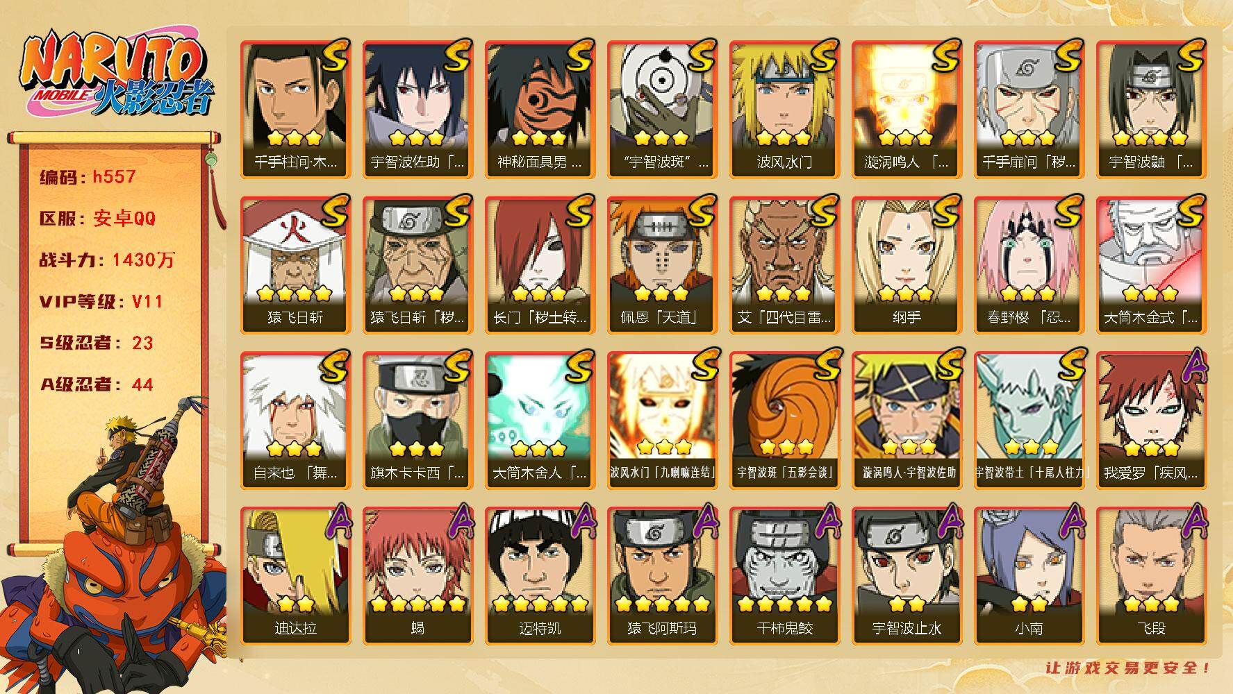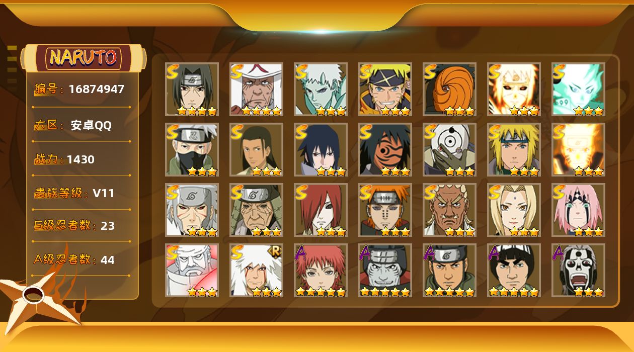 [16874947] VIP11,1430W战力,S忍23个,A忍44个,十尾带土已秒,止水80片,烈斗86片,桃式80片 多点券a