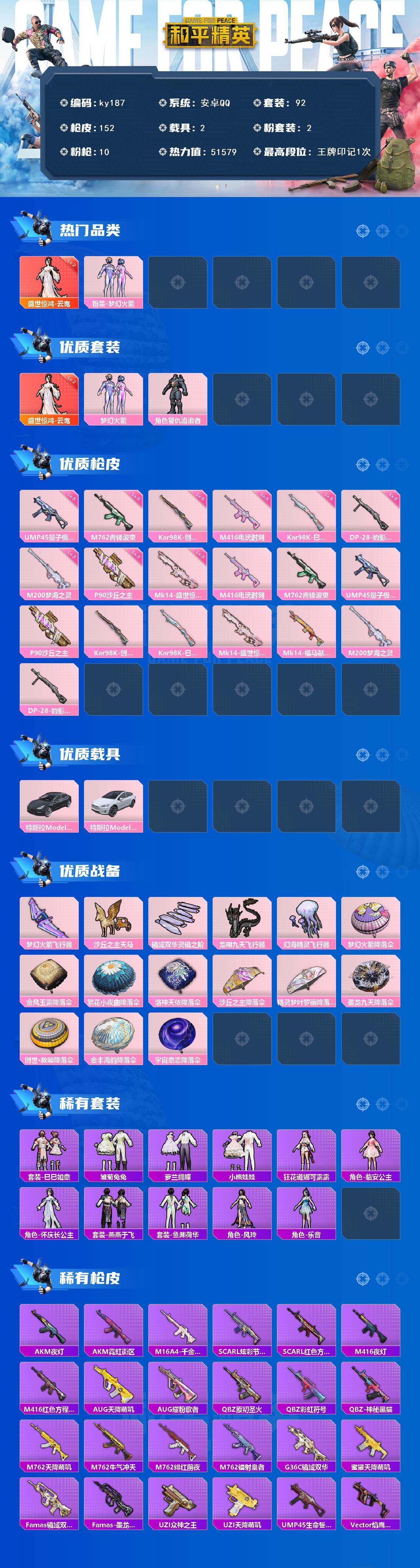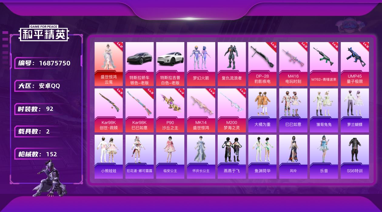 [16875750]安卓 手Q-1神装-2粉装-10特效枪-2载具-5粉色飞行器-51579热力值-1王牌印记-92套装-152枪皮 【红色神装等级】:盛世惊鸿-云鸾(二级) 【红色角色神装】:盛世惊鸿-云鸾 【热门品类】:粉装-梦幻火箭 【粉色套装】:粉装-梦幻火箭,角色-复仇流浪者 【粉色枪皮等级】:M416-电玩时刻(五级),M762-青锋波束(五级),UMP45-量子极限(五级),P90-沙丘之主(三级),Kar98K-创世·救赎(五级),Kar98K-巳巳如意(五级),Mk14-盛世惊鸿(三级),M200-梦海之灵(三级),DP-28-豹影疾电(五级) 【粉色载具】:特斯拉Model 3(冷光银),特斯拉Model X(珍珠白) 【粉色枪皮】:M416-电玩时刻,M762-青锋波束,UMP45-量子极限,P90-沙丘之主,Kar98K-创世·救赎,Kar98K-巳巳如意,Mk14-盛世惊鸿,Mk14-福马献瑞,M200-梦海之灵,DP-28-豹影疾电 【粉色飞行器】:梦幻火箭飞行器,沙丘之主天马,镜域双华-灵镜之阶,龙翔九天飞行器,幻海精灵飞行器 【粉色降落伞】:梦幻火箭降落伞,金风玉露降落伞,繁花小夜曲降落伞,洛神天依降落伞,沙丘之主降落伞,精灵梦叶罗丽降落伞,墨龙九天降落伞,创世·救赎降落伞,金丰海韵降落伞,宇宙意志降落伞 【稀有套装】:套装-巳巳如意,套装-雏菊兔兔,套装-萝兰蝴蝶,套装-小熊娃娃,角色-狂花道·娜可露露,角色-临安公主,角色-怀庆长公主,套装-燕燕于飞,套装-鱼渊荷华,角色-风玲,角色-乐音 【稀有枪皮】:AKM-夜灯,AKM-霓虹街区,M16A4-千金淑猫,SCAR-L-炫彩节奏,SCAR-L-红色方程式,M416-夜灯,M416-红色方程式,AUG-天降萌叽,AUG-耀粉歌者,QBZ-原初圣火,QBZ-彩虹符号,QBZ-神秘黑猫,M762-天降萌叽,M762-牛气冲天,M762-绯红前夜,M762-镭射皇者,G36C-镜域双华,蜜獾-天降萌叽,Famas-镜域双华,Famas-墨龙九天,UZI-众神之王,UZI-天降萌叽,UMP45-生命誓言,Vector-焰鹰斗篷,Vector-彩虹符号,Vector-生命誓言,Vector-创世·救赎,汤姆逊-勇闯险境,汤姆逊-天降萌叽,汤姆逊-耀粉歌者,野牛-沙丘之主,MP5K-众神之王,P90-巳巳如意,