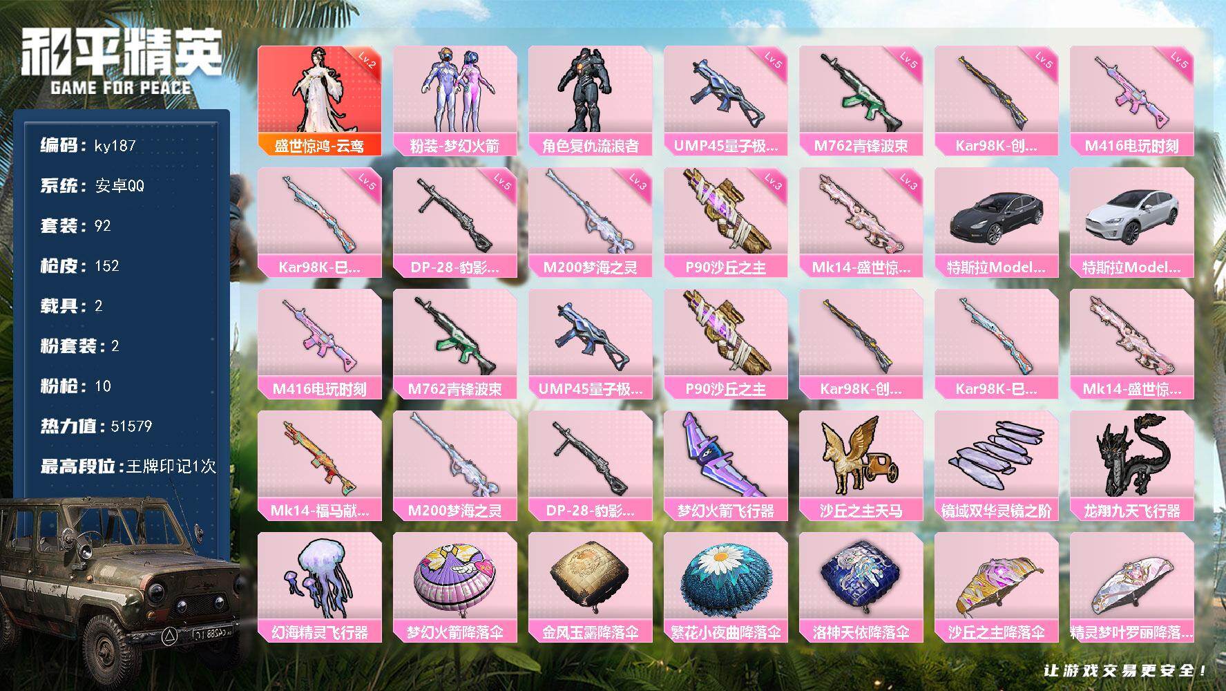 [16875750]安卓 手Q-1神装-2粉装-10特效枪-2载具-5粉色飞行器-51579热力值-1王牌印记-92套装-152枪皮