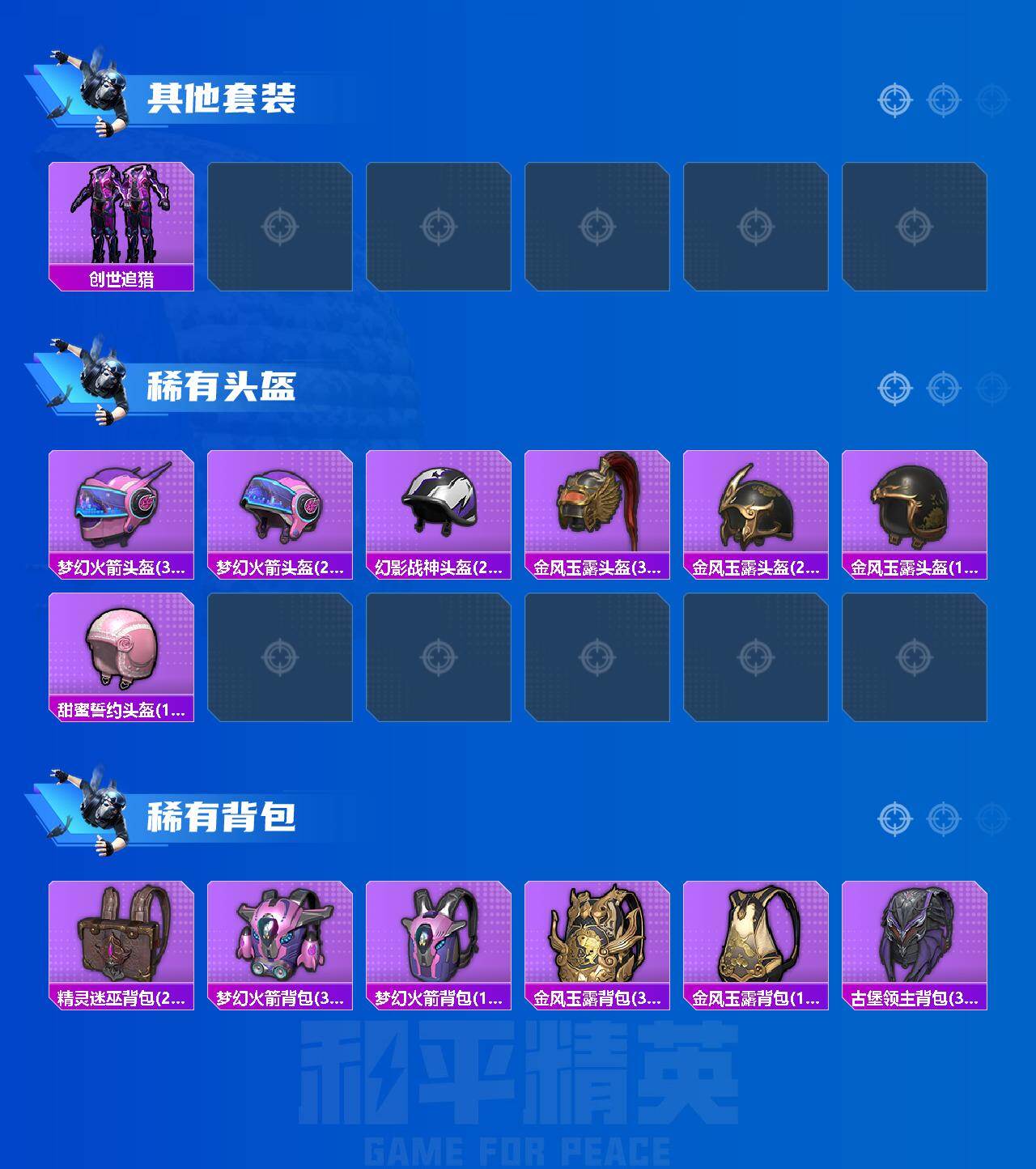 M416-电玩时刻,M762-青锋波束,UMP45-量子极限,P90-沙丘之主,Kar98K-创世·救赎,Kar98K-巳巳如意,Mk14-盛世惊鸿,M200-梦海之灵