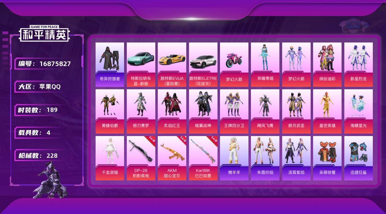 [16875827]苹果 手Q-14粉装-3特效枪-4载具-7粉色飞行器-82712热力值-9王牌印记-189套装-228枪皮