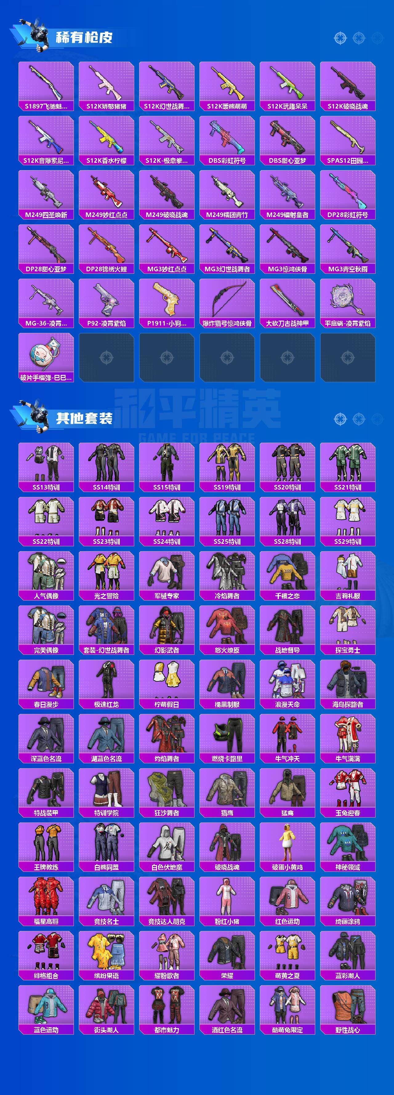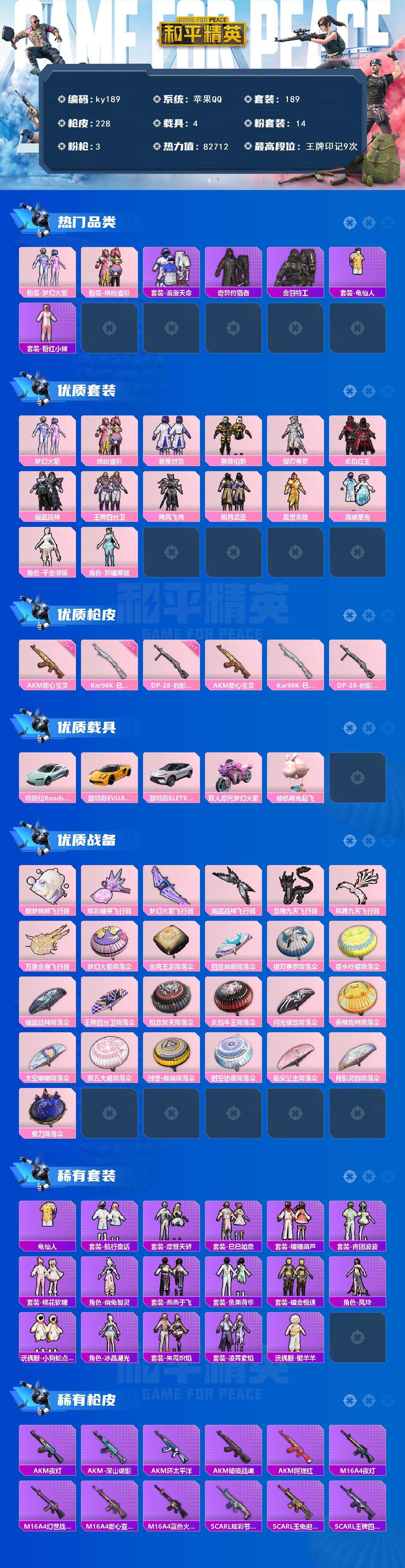 - [17018771]苹果 手Q-11粉装-9特效枪-4载具-6粉色飞行器-55697热力值-6王牌印记-98套装-157枪皮 【热门品类】:套装-龟仙人 【粉色套装】:粉装-吟月归客,粉装-恐龙拽拽,粉装-未来歌姬,粉装-拂晓神骑,角色-茉莉星,角色-水仙星,角色-宙之时溯,角色-圣堂之誓,角色-烟云彩露,角色-光极星,角色-异瞳寒姬 【粉色枪皮等级】:AKM-梦之光华(五级),SCAR-L-纯梦嫁纱(六级),M416-心之恋语(六级),UMP45-恐龙拽拽(五级),Kar98K-未来歌姬(一级),Kar98K-巳巳如意(五级),Mk14-精灵梦叶罗丽(五级),DP-28-豹影疾电(三级),MG-36-沧焰双生(五级) 【粉色载具】:宾利BATUR(极速紫),永恒黄蜂,萌喵橘座,护世瑞兽 【粉色枪皮】:AKM-梦之光华,SCAR-L-纯梦嫁纱,M416-心之恋语,UMP45-恐龙拽拽,Kar98K-未来歌姬,Kar98K-巳巳如意,Mk14-精灵梦叶罗丽,DP-28-豹影疾电,MG-36-沧焰双生 【粉色飞行器】:炫彩糖果飞行器,拂晓神骑飞行器,镜域双华-灵镜之阶,深渊漩涡飞行器,万象金身飞行器 【粉色降落伞】:恐龙拽拽降落伞,千面幻镜降落伞,第五大道降落伞,未来歌姬降落伞,变形金刚降落伞,拂晓神骑降落伞,萌物绒绒降落伞,炫光之旅降落伞,圣堂之誓降落伞,江南烟雨降落伞,精灵梦叶罗丽降落伞,墨龙九天降落伞,临安公主降落伞,金蛇镇世降落伞,异瞳寒姬降落伞,炫彩糖果降落伞 【稀有套装】:套装-龟仙人,套装-巳巳如意,套装-炫彩糖果,角色-光矢逐梦,套装-燕燕于飞,套装-鱼渊荷华,套装-朱霞炽焰,套装-凌霄紫焰,玩偶服-美羊羊,角色-绯色魅影,角色-霜刃之御 【稀有枪皮】:AUG-冰晶雪宝,AKM-恐龙拽拽,AKM-星之彼岸,AKM-龙的传人,SCAR-L-是爱神辣,M416-夜灯,M416-糯团青竹,GROZA-恐龙拽拽,GROZA-酷泡奶龙,AUG-金蛇镇世,AUG-月影灵韵,QBZ-未来歌姬,M762-天降萌叽,M762-第五大道,M762-绒雪飘舞,AC-VAL-天降萌叽,AC-VAL-快闪甜心,AC-VAL-闲梦青缨,蜜獾-天降萌叽,Famas-墨龙九天,ARX-凌霄紫焰,UZI-啾咪啾咪,UZI-天降萌叽,UZI-月影灵韵,UMP45-炫光之旅,UMP45-猪猪侠,Vector-