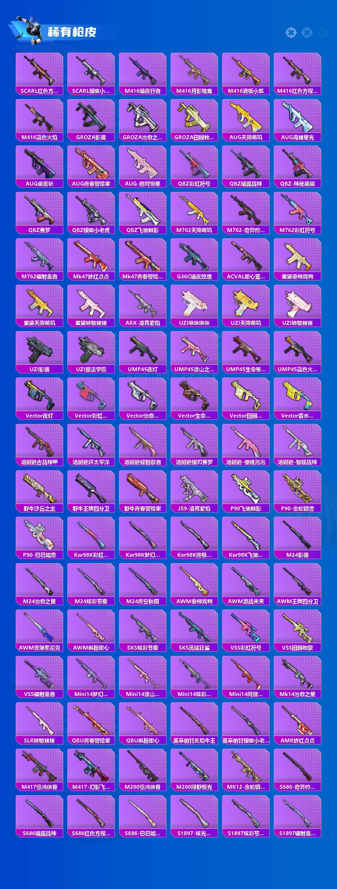 【稀有枪皮】:AKM-夜灯,AKM-深山诡影,AKM-环太平洋,AKM-破晓战魂,AKM-阿狸红,M16A4-夜灯,M16A4-幻世战舞者,M16A4-甜心亚梦,M16A4-蓝色火焰,SCAR-L-炫彩节奏,SCAR-L-玉兔迎春,SCAR-L-王牌四分卫,SCAR-L-红色方程式,SCAR-L-银碳小老虎,M416-暗夜行者,M416-月影鸳鸯,M416-滑板小狐,M416-红色方程式,M416-蓝色火焰,GROZA-影袭,GROZA-治愈之星,GROZA-田园牧歌,AUG-