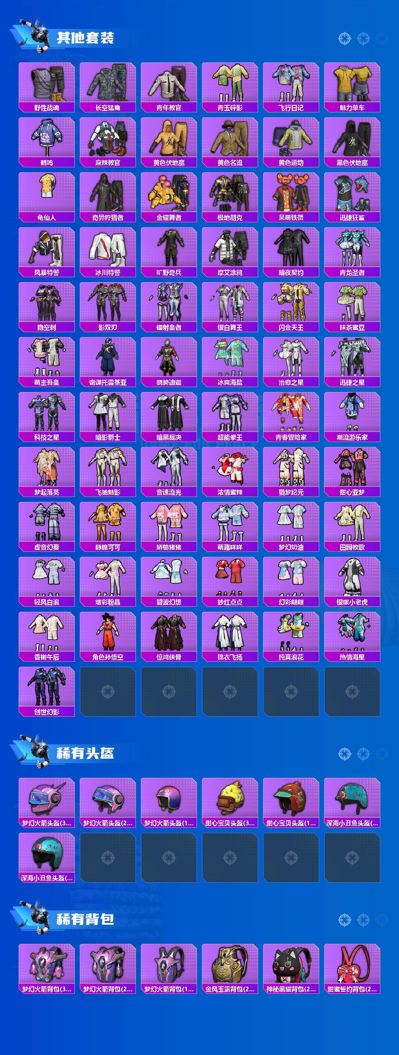 【稀有套装】:套装-龟仙人,套装-航行童话,套装-摩登天骄,套装-巳巳如意,套装-糖糖葫芦,套装-青团波波,套装-棉花软糖,角色-俏兔智灵,套装-燕燕于飞,套装-鱼渊荷华,套装-镭金极速,角色-风玲,玩偶服-小狗蛇点点,角色-冰晶湖光,套装-朱霞炽焰,套装-凌霄紫焰,玩偶服-懒羊羊