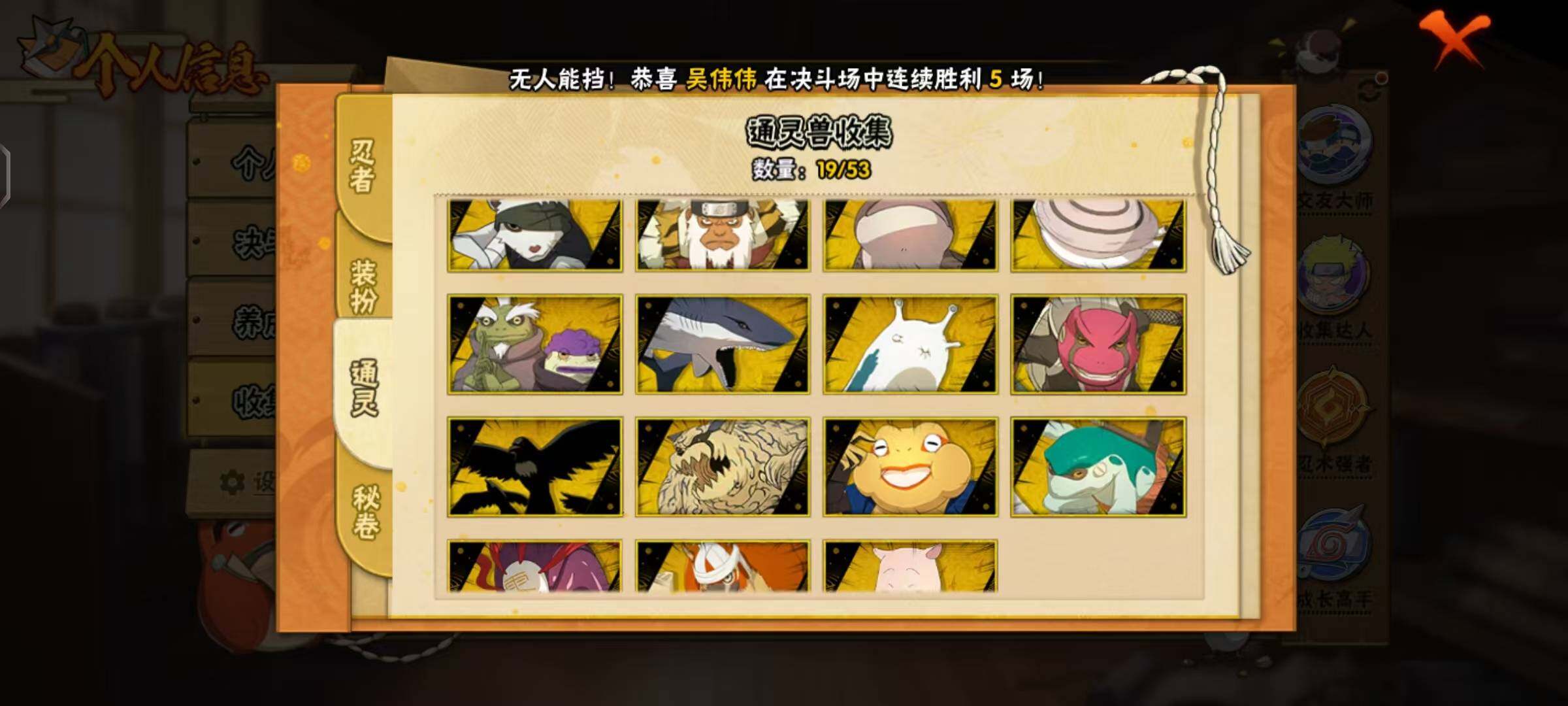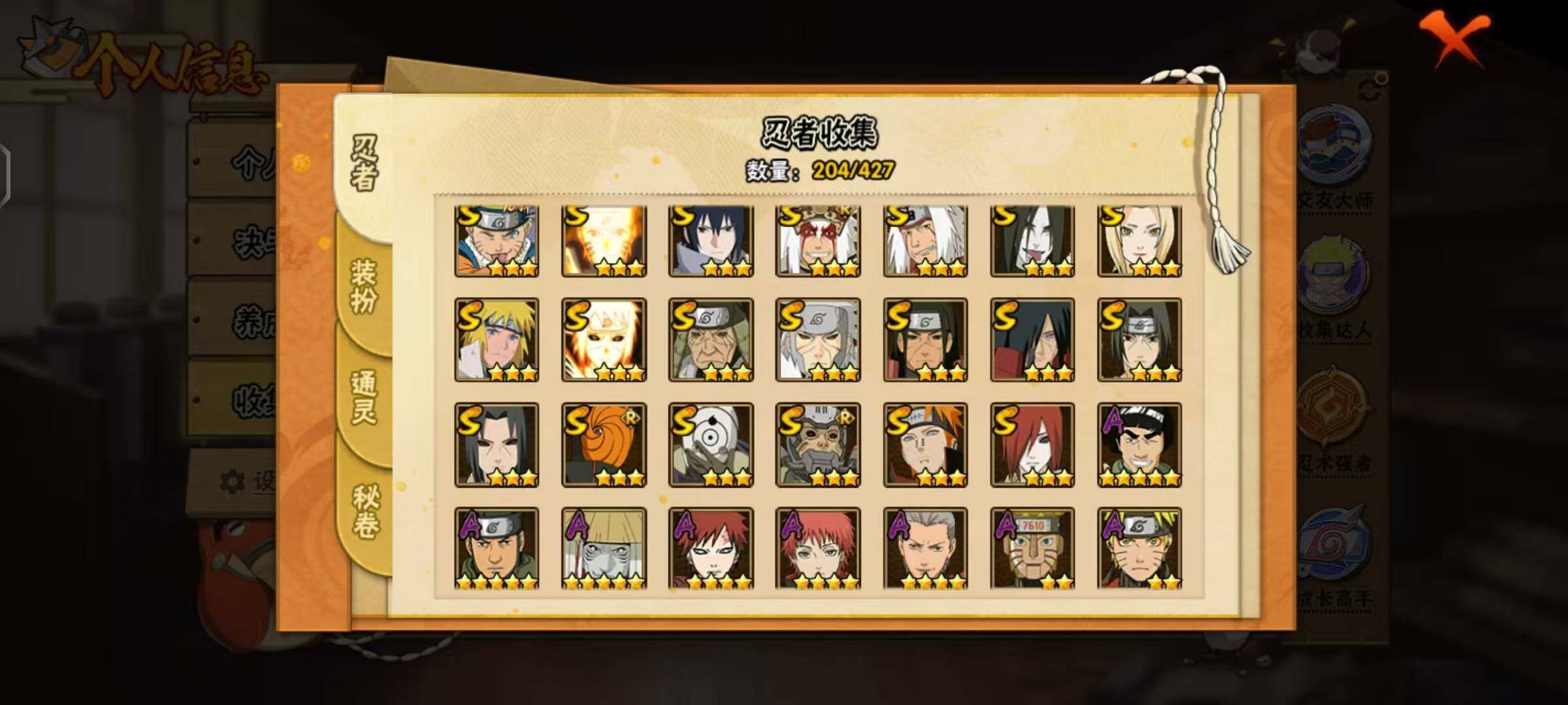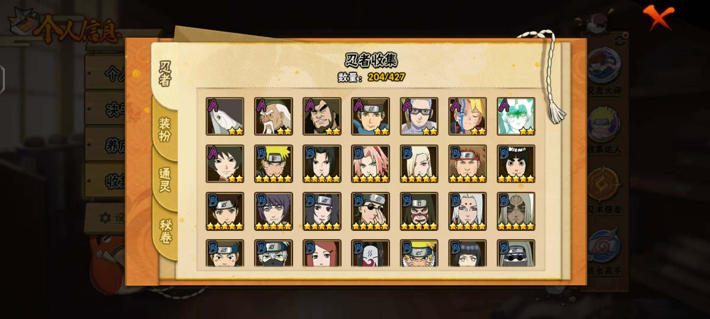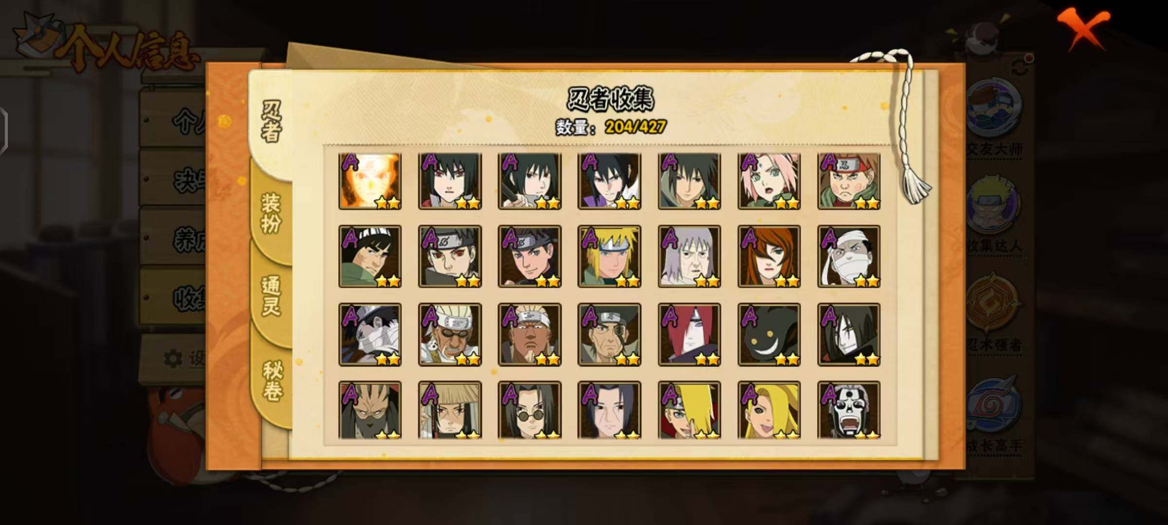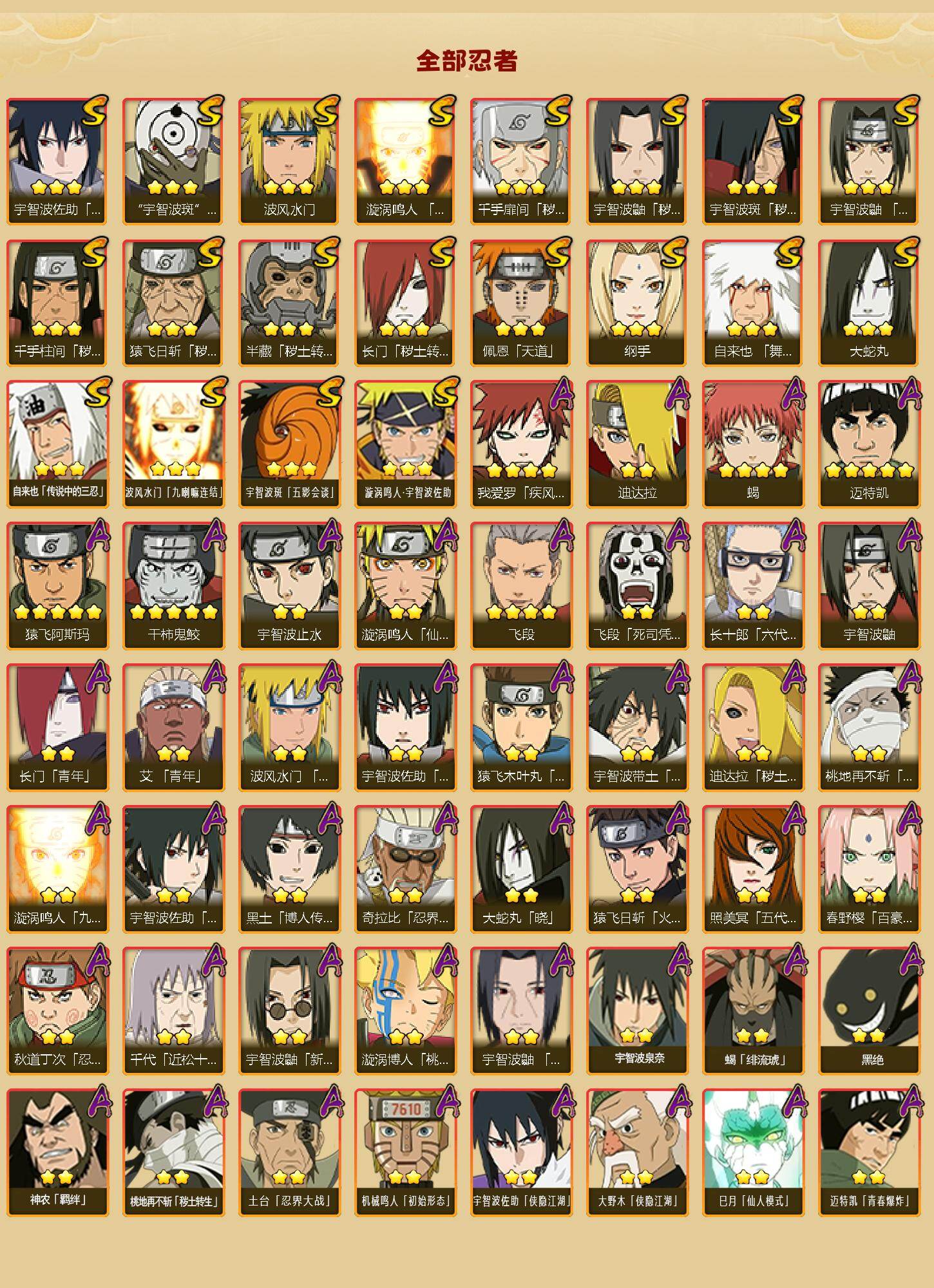 【A级忍者】:艾「青年」(2星),长门「青年」(2星),波风水门「青年」(2星),迪达拉(2星),迪达拉「秽土转生」(2星),大蛇丸「晓」(2星),奇拉比「忍界大战」(2星),飞段(4星),飞段「死司凭血」(2星),干柿鬼鲛(5星),漩涡博人「桃式显现」(2星),漩涡鸣人「仙人模式」(2星),漩涡鸣人「九尾查克拉」(2星),机械鸣人「初始形态」(2星),迈特凯(5星),桃地再不斩「漂泊武士」(2星),桃地再不斩「秽土转生」(2星),我爱罗「疾风传」(4星),蝎(4星),蝎「绯流琥」(2星),猿飞阿斯玛(5星),宇智波止水(2星),猿飞日斩「火影继承人」(2星),宇智波鼬(2星),宇智波鼬「新春限定」(2星),宇智波鼬「夏日限定」(2星),宇智波佐助「须佐能乎」(2星),宇智波佐助「万花筒写轮眼」(2星),宇智波佐助「侠隐江湖」(2星),照美冥「五代目水影」(2星),黑绝(2星),宇智波带土「暴怒」(2星),长十郎「六代目水影」(2星),猿飞木叶丸「博人传」(2星),黑土「博人传」(2星),春野樱「百豪」(2星),秋道丁次「忍界大战」(2星),千代「近松十人卫」(2星),神农「羁绊」(2星),土台「忍界大战」(2星),宇智波泉奈(2星),大野木「侠隐江湖」(2星),巳月「仙人模式」(2星),迈特凯「青春爆炸」(2星)