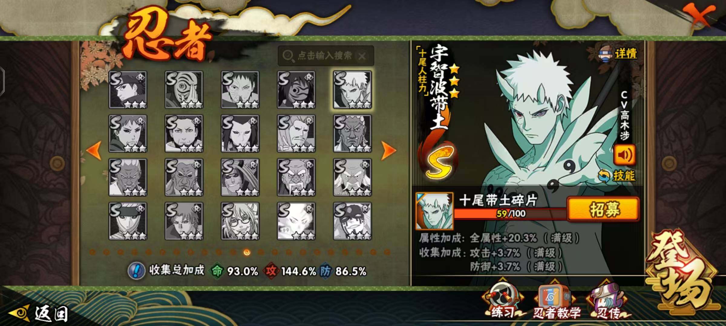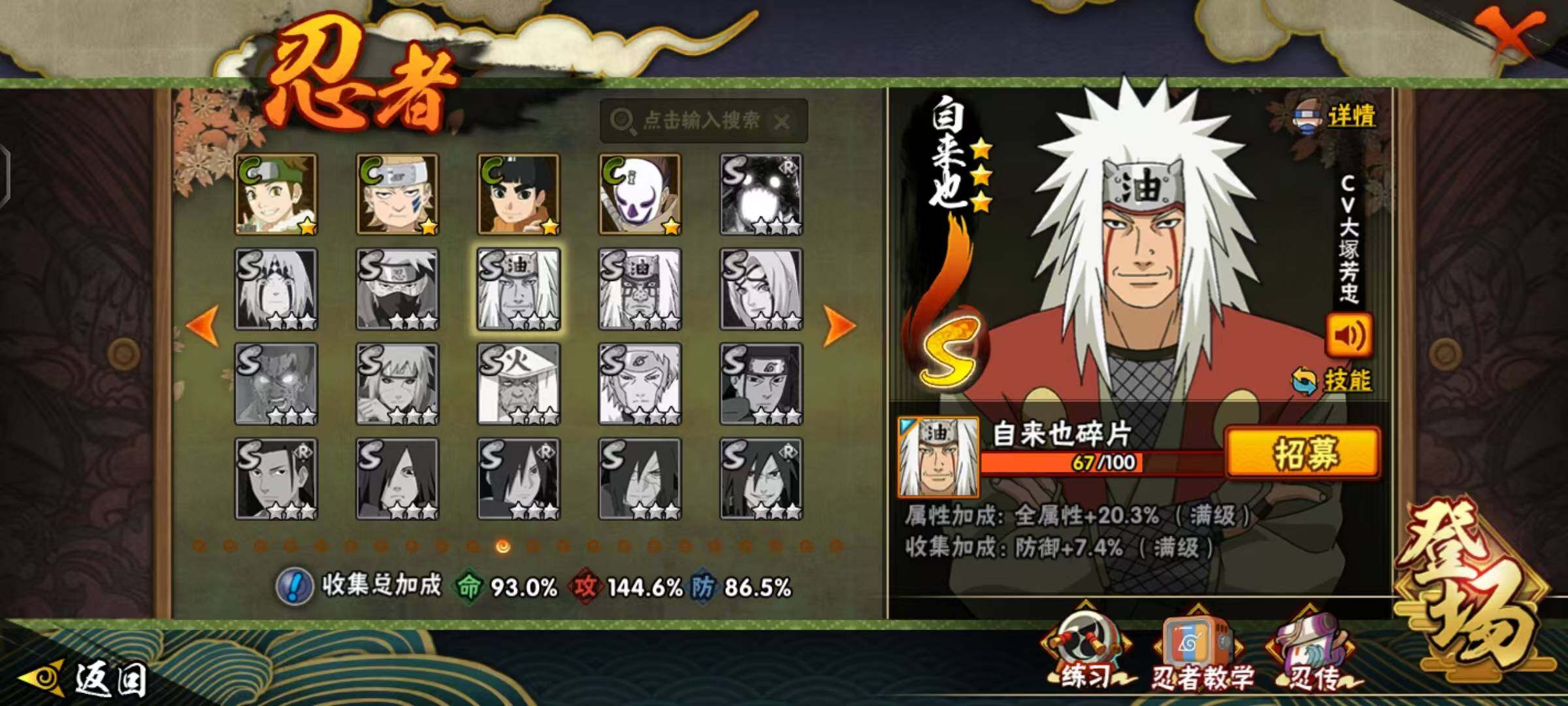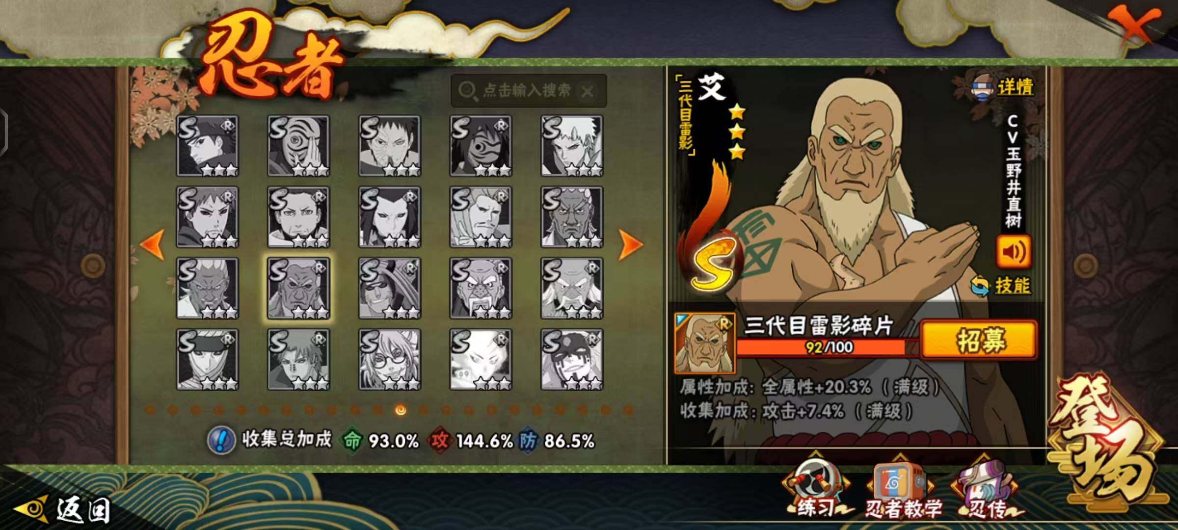 【S级忍者】:长门「秽土转生」(3星),半藏「秽土转生」(3星),猿飞日斩「秽土转生」(3星),千手扉间「秽土转生」(3星),千手柱间「秽土转生」(3星),宇智波鼬「秽土转生」(3星),宇智波斑「秽土转生」(3星),宇智波鼬「须佐能乎」(3星),自来也「舞之豪杰」(3星),大蛇丸(3星),自来也「传说中的三忍」(3星),纲手(3星),波风水门(3星),漩涡鸣人「九喇嘛连结」(3星),佩恩「天道」(3星),宇智波佐助「永恒万花筒」(3星),宇智波斑 「白面具」(3星宇智波斑「白面具」),波风水门「九喇嘛连结」(3星),宇智波斑「五影会谈」(3星),漩涡鸣人·宇智波佐助(3星)