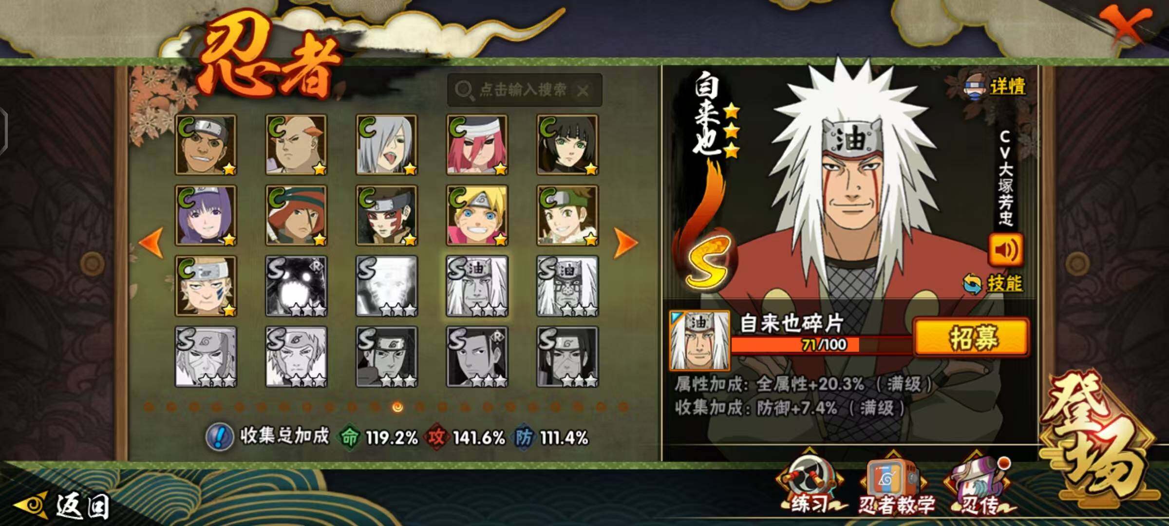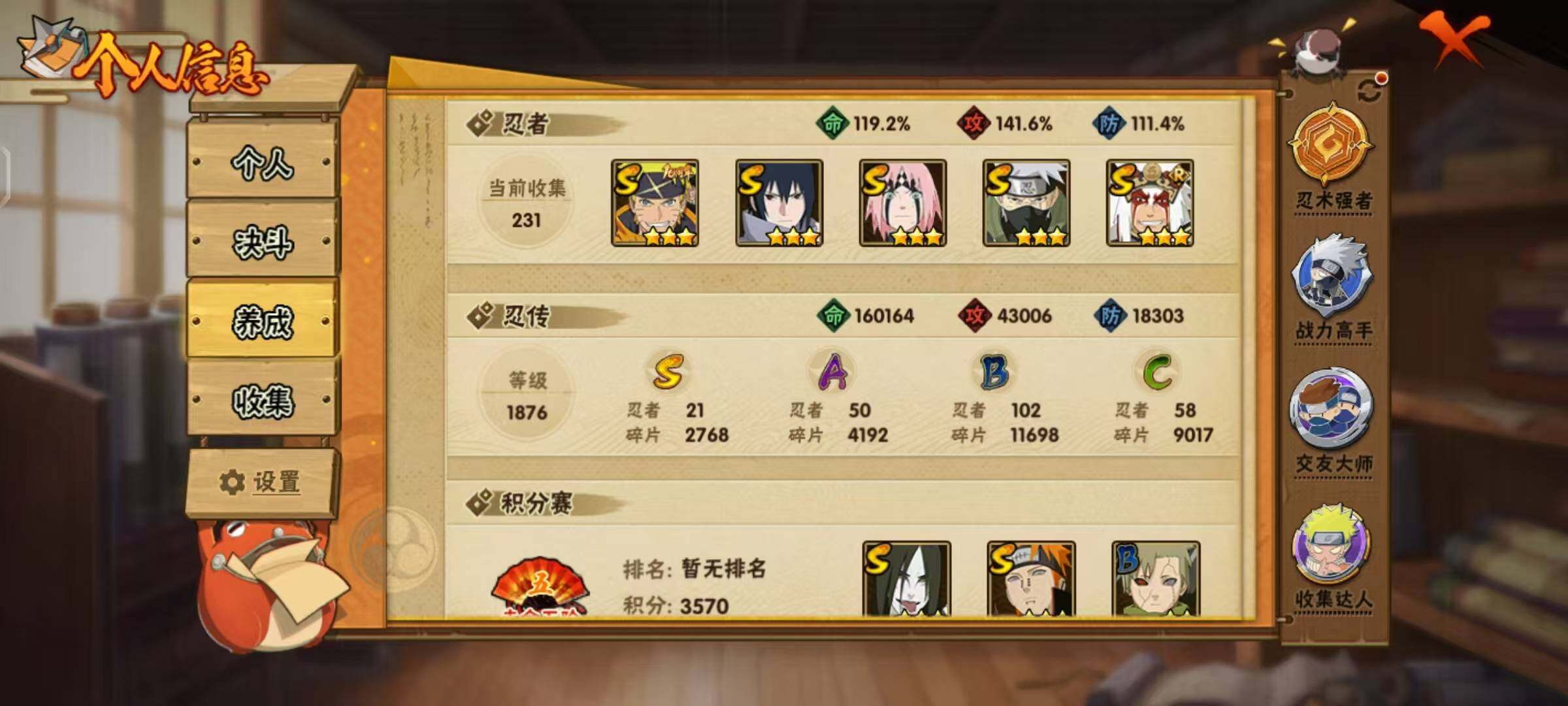 [16878197]21S级忍者数-50A级忍者数 【S级忍者】:猿飞日斩「秽土转生」(3星),波风水门「秽土转生」(3星),宇智波斑「秽土转生」(3星),春野樱「忍界大战」(3星),艾「忍界大战」(3星),宇智波鼬「须佐能乎」(3星),旗木卡卡西「须佐能乎」(3星),自来也「舞之豪杰」(3星),大蛇丸(3星),自来也「传说中的三忍」(3星),纲手(3星),纲手「百豪」(3星),猿飞日斩(3星),波风水门(3星),迈特凯「死门」(3星),佩恩「天道」(3星),宇智波佐助「永恒万花筒」(3星),宇智波斑 「白面具」(3星宇智波斑「白面具」),波风水门「九喇嘛连结」(3星),宇智波斑「五影会谈」(3星),漩涡鸣人·宇智波佐助(3星) 【A级忍者】:艾「青年」(2星),长门「青年」(2星),波风水门「青年」(2星),迪达拉(2星),迪达拉「秽土转生」(2星),大蛇丸「晓」(2星),飞段(4星),飞段「死司凭血」(4星),干柿鬼鲛(5星),漩涡博人「桃式显现」(2星),漩涡鸣人「仙人模式」(2星),漩涡鸣人「九尾查克拉」(2星),机械鸣人「初始形态」(2星),迈特凯(5星),旗木卡卡西「元气夏日」(2星),旗木卡卡西「万花筒写轮眼」(2星),旗木卡卡西「幻之真容」(2星),桃地再不斩「秽土转生」(2星),我爱罗「疾风传」(4星),我爱罗「忍界大战」(2星),蝎(4星),蝎「绯流琥」(2星),小南(2星),小南「新春限定」(2星),猿飞阿斯玛(5星),猿飞阿斯玛「秽土转生」(2星),宇智波止水(2星),宇智波鼬(2星),宇智波鼬「夏日限定」(2星),宇智波佐助「须佐能乎」(2星),宇智波佐助「万花筒写轮眼」(2星),药师兜「半蛇斗篷」(2星),照美冥「五代目水影」(2星),日向宁次「忍界大战」(2星),日向雏田「最终章」(2星),黑绝(2星),宇智波带土「漂泊浪客」(2星),长十郎「六代目水影」(2星),李洛克「忍界大战」(2星),猿飞木叶丸「博人传」(2星),黑土「博人传」(2星),春野樱「百豪」(2星),秋道丁次「忍界大战」(2星),千代「近松十人卫」(2星),神农「羁绊」(2星),土台「忍界大战」(2星),不缘(2星),宇智波泉奈(2星),巳月「仙人模式」(2星),迈特凯「青春爆炸」(2星)