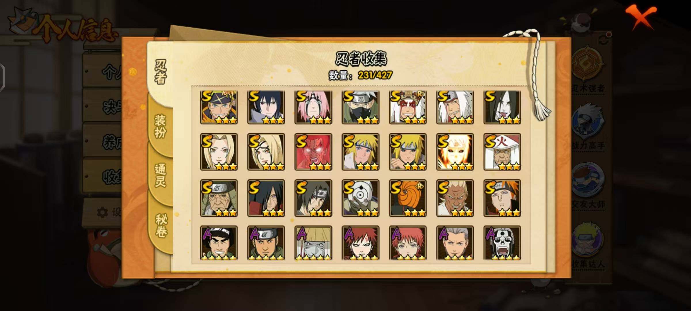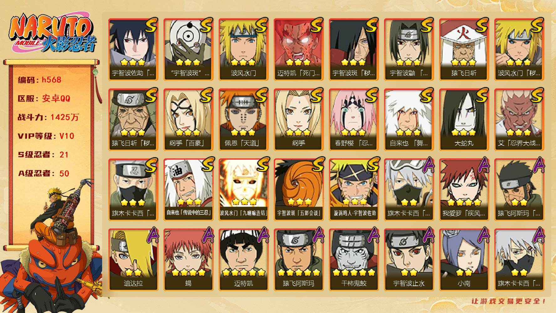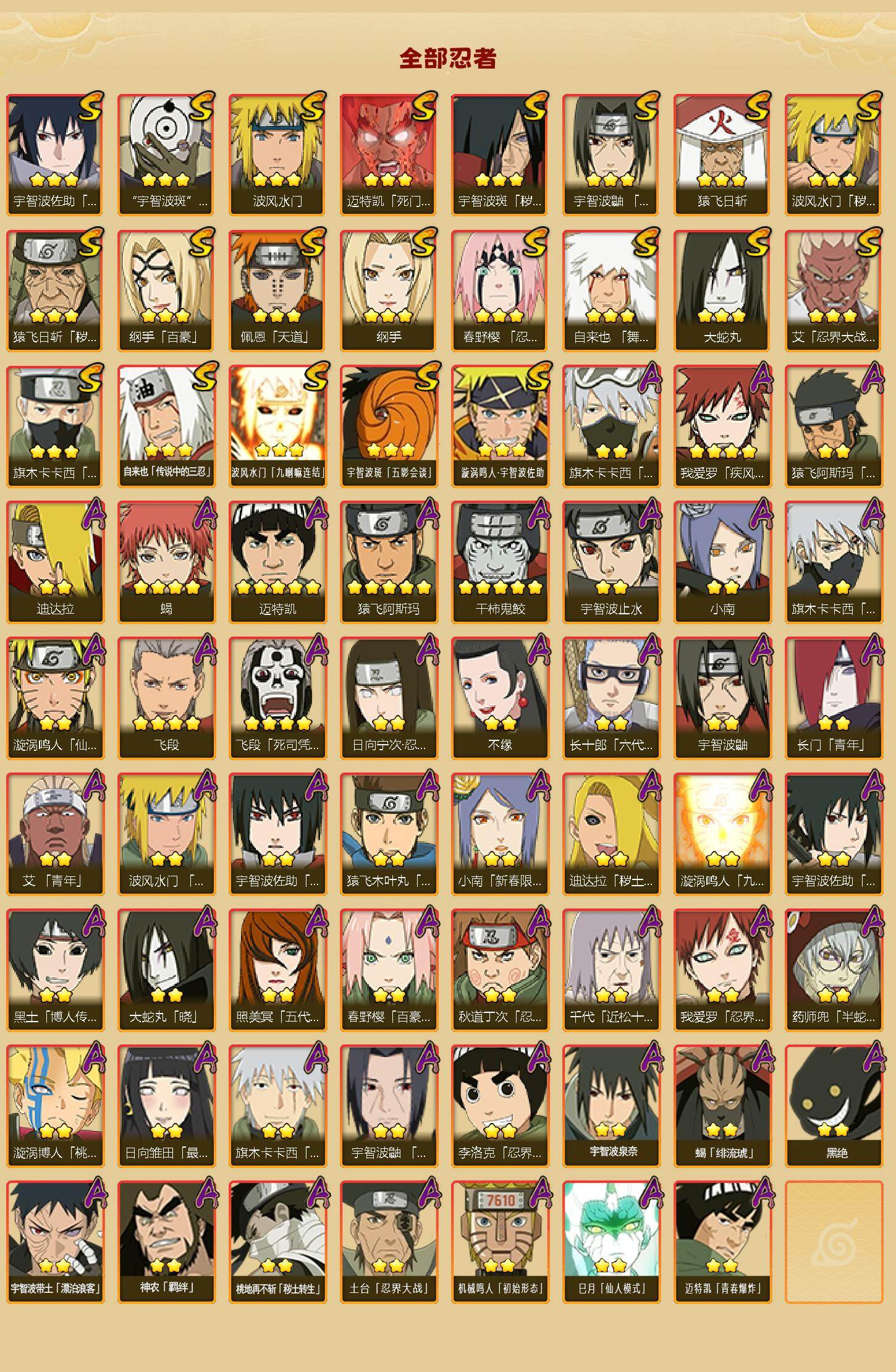 【S级忍者】:猿飞日斩「秽土转生」(3星),波风水门「秽土转生」(3星),宇智波斑「秽土转生」(3星),春野樱「忍界大战」(3星),艾「忍界大战」(3星),宇智波鼬「须佐能乎」(3星),旗木卡卡西「须佐能乎」(3星),自来也「舞之豪杰」(3星),大蛇丸(3星),自来也「传说中的三忍」(3星),纲手(3星),纲手「百豪」(3星),猿飞日斩(3星),波风水门(3星),迈特凯「死门」(3星),佩恩「天道」(3星),宇智波佐助「永恒万花筒」(3星),宇智波斑 「白面具」(3星宇智波斑「白面具」),波风水门「九喇嘛连结」(3星),宇智波斑「五影会谈」(3星),漩涡鸣人·宇智波佐助(3星)