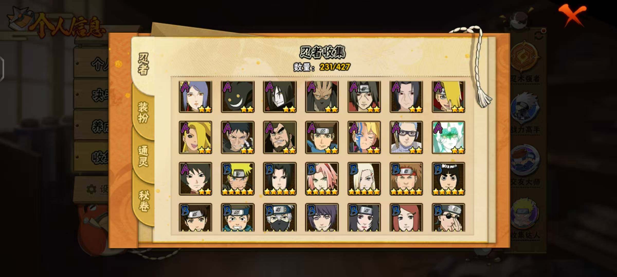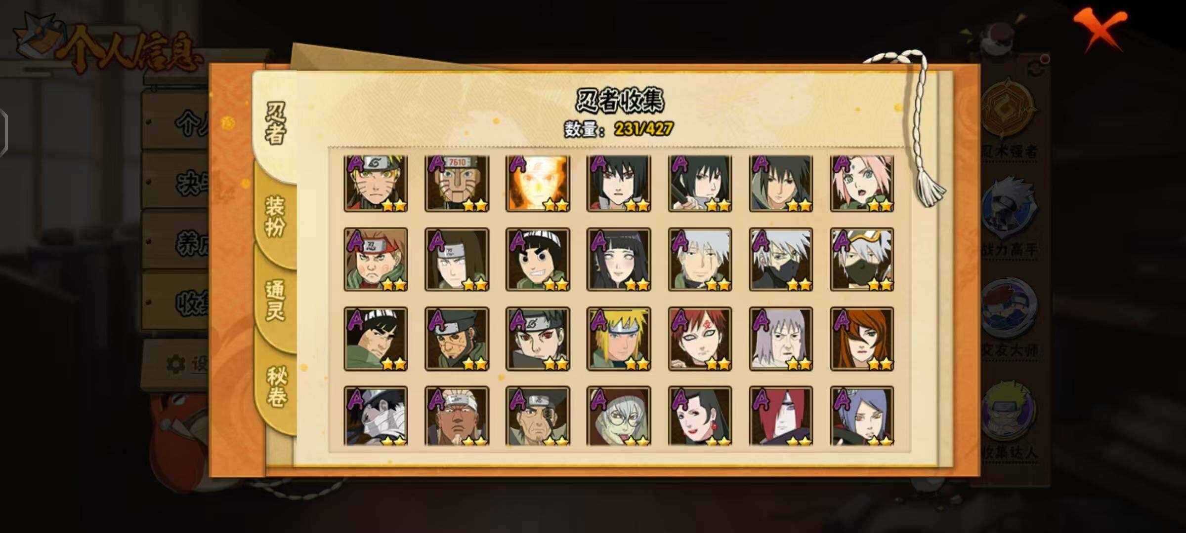 【A级忍者】:艾「青年」(2星),长门「青年」(2星),波风水门「青年」(2星),迪达拉(2星),迪达拉「秽土转生」(2星),大蛇丸「晓」(2星),飞段(4星),飞段「死司凭血」(4星),干柿鬼鲛(5星),漩涡博人「桃式显现」(2星),漩涡鸣人「仙人模式」(2星),漩涡鸣人「九尾查克拉」(2星),机械鸣人「初始形态」(2星),迈特凯(5星),旗木卡卡西「元气夏日」(2星),旗木卡卡西「万花筒写轮眼」(2星),旗木卡卡西「幻之真容」(2星),桃地再不斩「秽土转生」(2星),我爱罗「疾风传」(4星),我爱罗「忍界大战」(2星),蝎(4星),蝎「绯流琥」(2星),小南(2星),小南「新春限定」(2星),猿飞阿斯玛(5星),猿飞阿斯玛「秽土转生」(2星),宇智波止水(2星),宇智波鼬(2星),宇智波鼬「夏日限定」(2星),宇智波佐助「须佐能乎」(2星),宇智波佐助「万花筒写轮眼」(2星),药师兜「半蛇斗篷」(2星),照美冥「五代目水影」(2星),日向宁次「忍界大战」(2星),日向雏田「最终章」(2星),黑绝(2星),宇智波带土「漂泊浪客」(2星),长十郎「六代目水影」(2星),李洛克「忍界大战」(2星),猿飞木叶丸「博人传」(2星),黑土「博人传」(2星),春野樱「百豪」(2星),秋道丁次「忍界大战」(2星),千代「近松十人卫」(2星),神农「羁绊」(2星),土台「忍界大战」(2星),不缘(2星),宇智波泉奈(2星),巳月「仙人模式」(2星),迈特凯「青春爆炸」(2星)