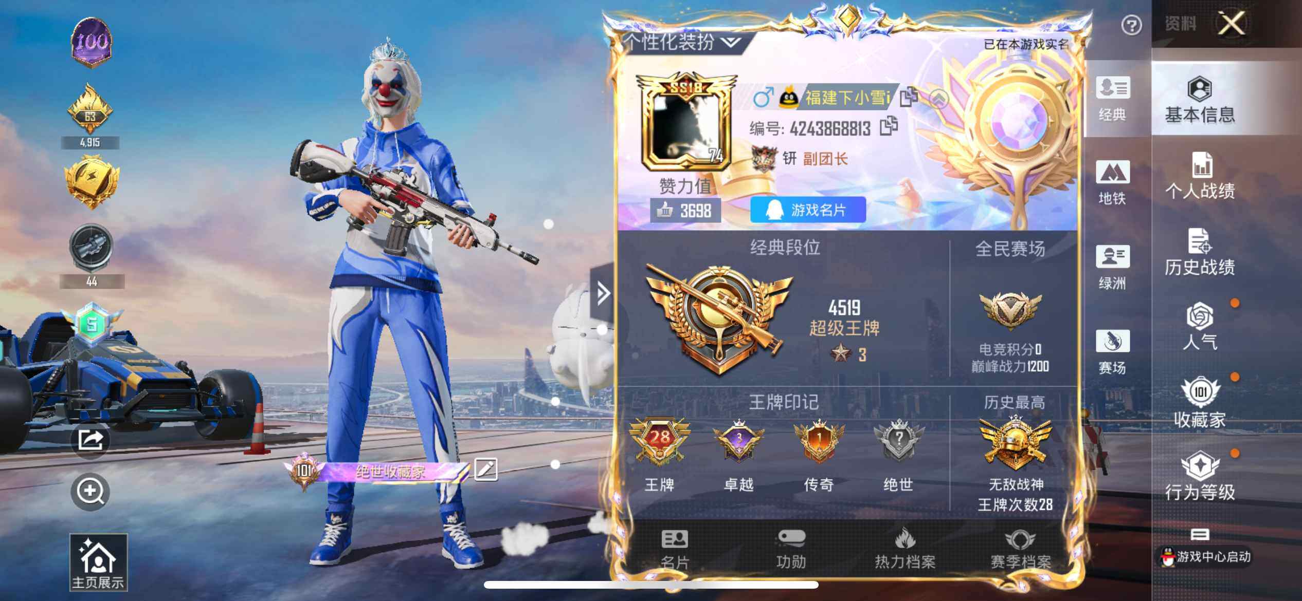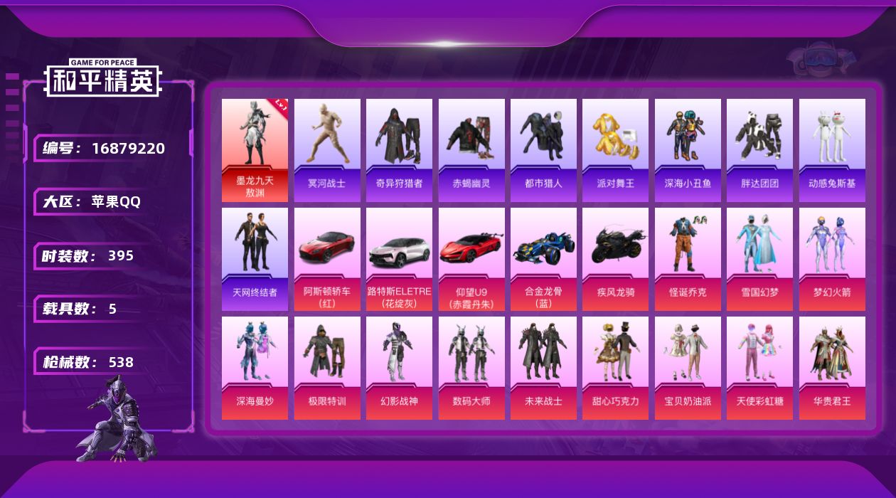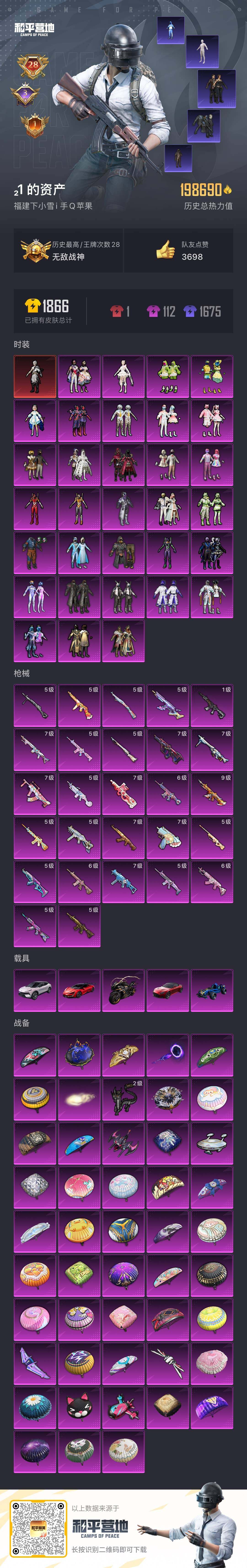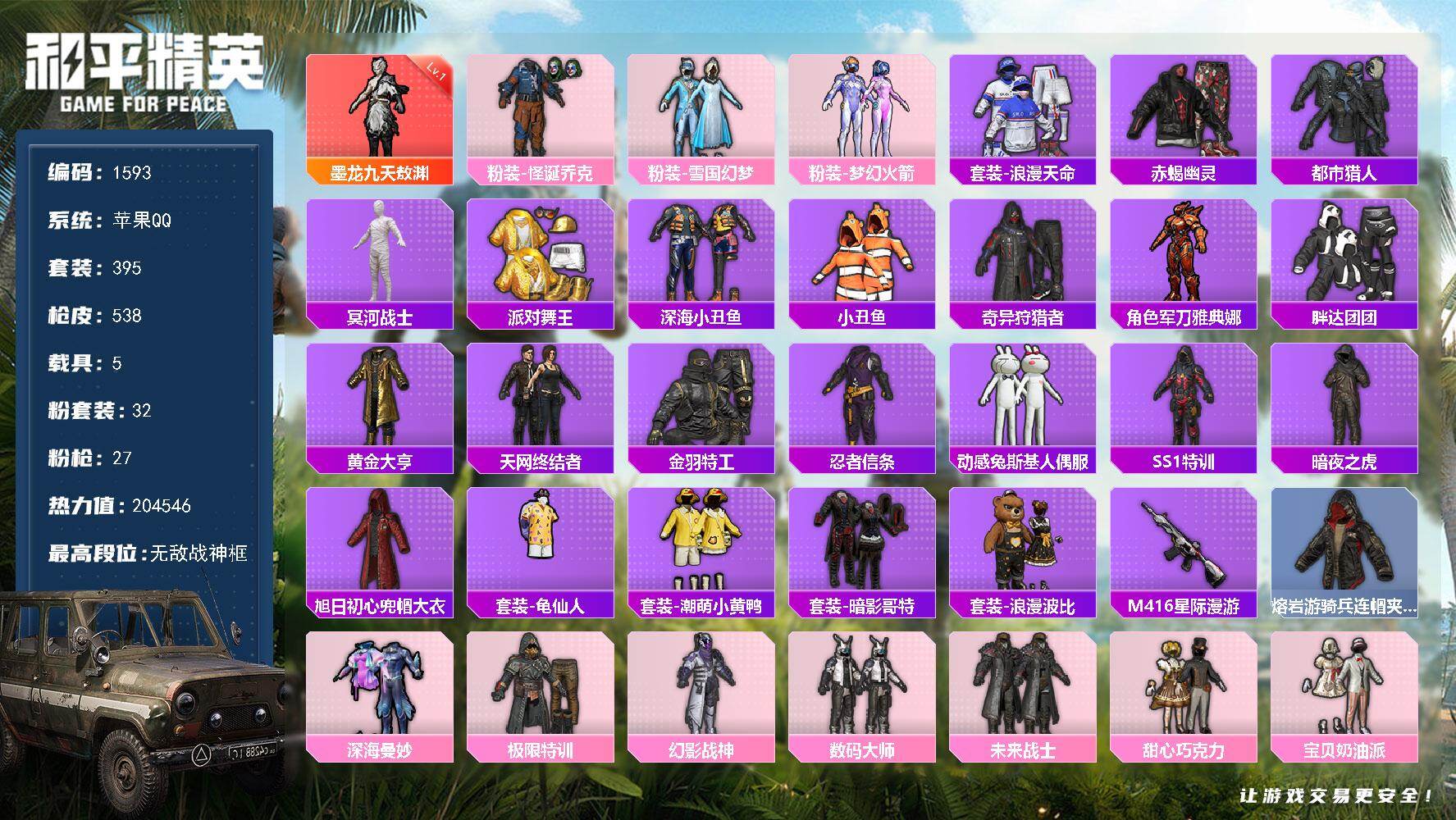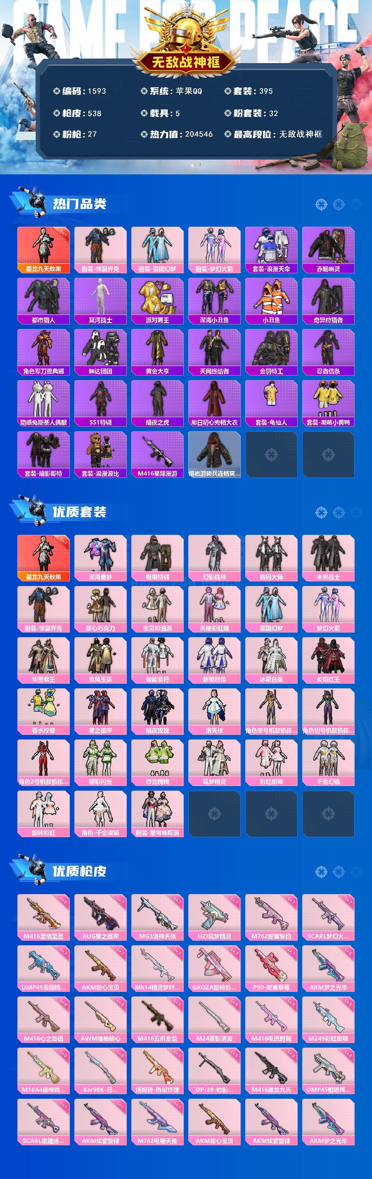 [16879220]【1593】苹果 手Q-无敌战神框-1神装-32粉装-27特效枪-5载具-9粉色飞行器-204546热力值-30王牌印记-395套装-538枪皮