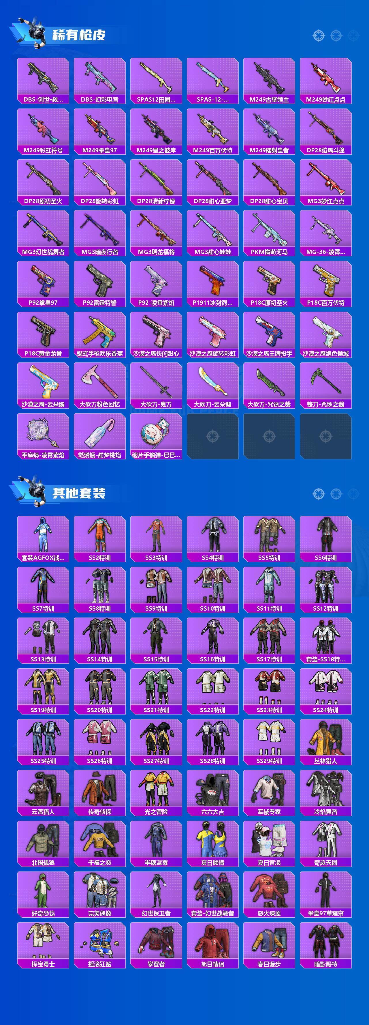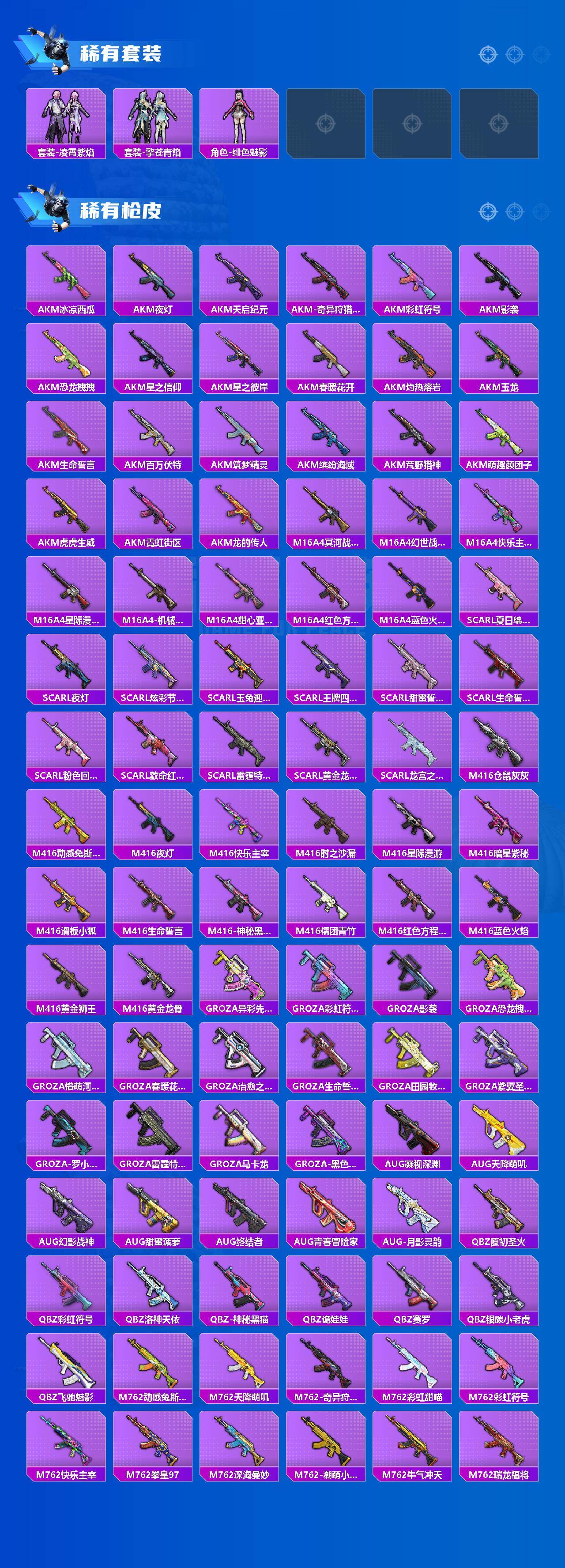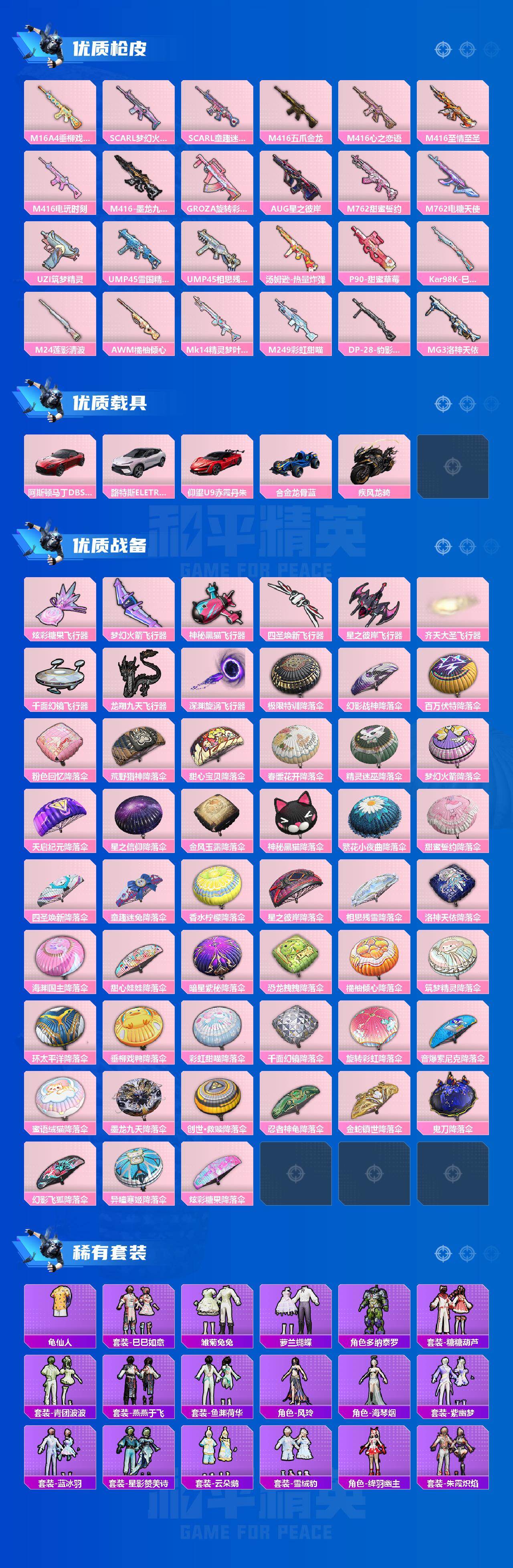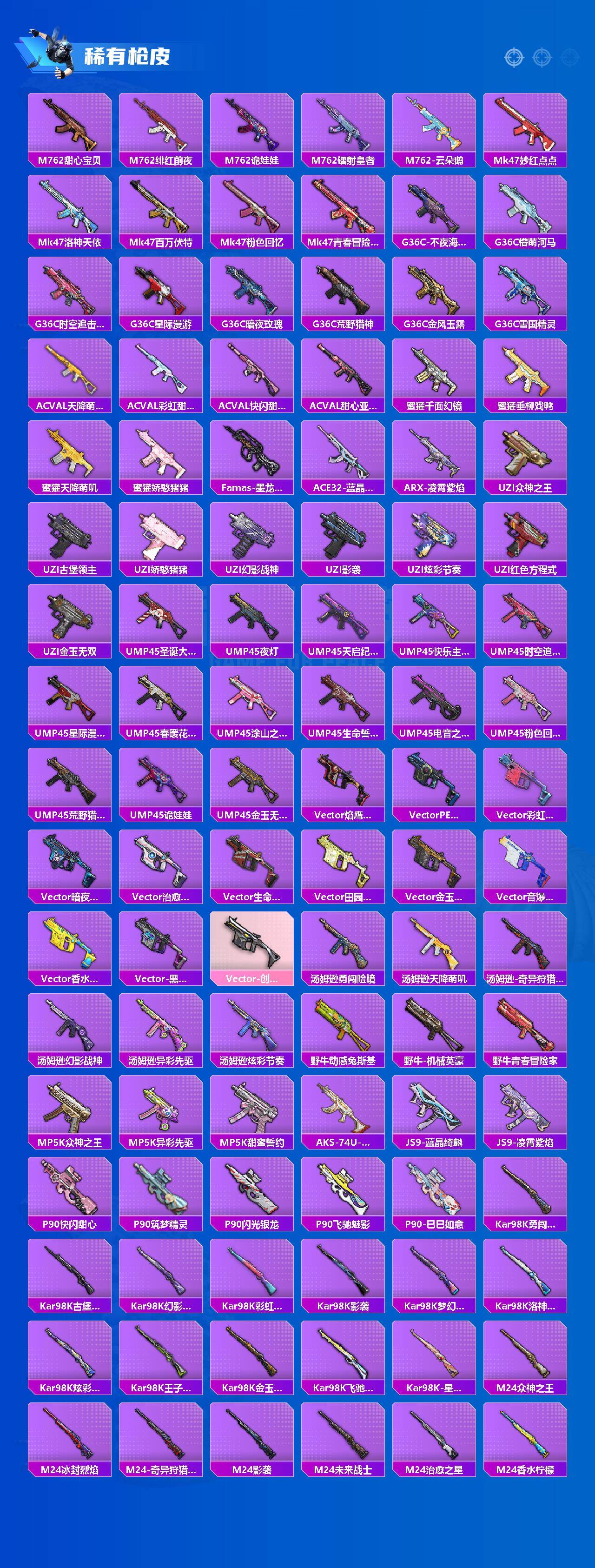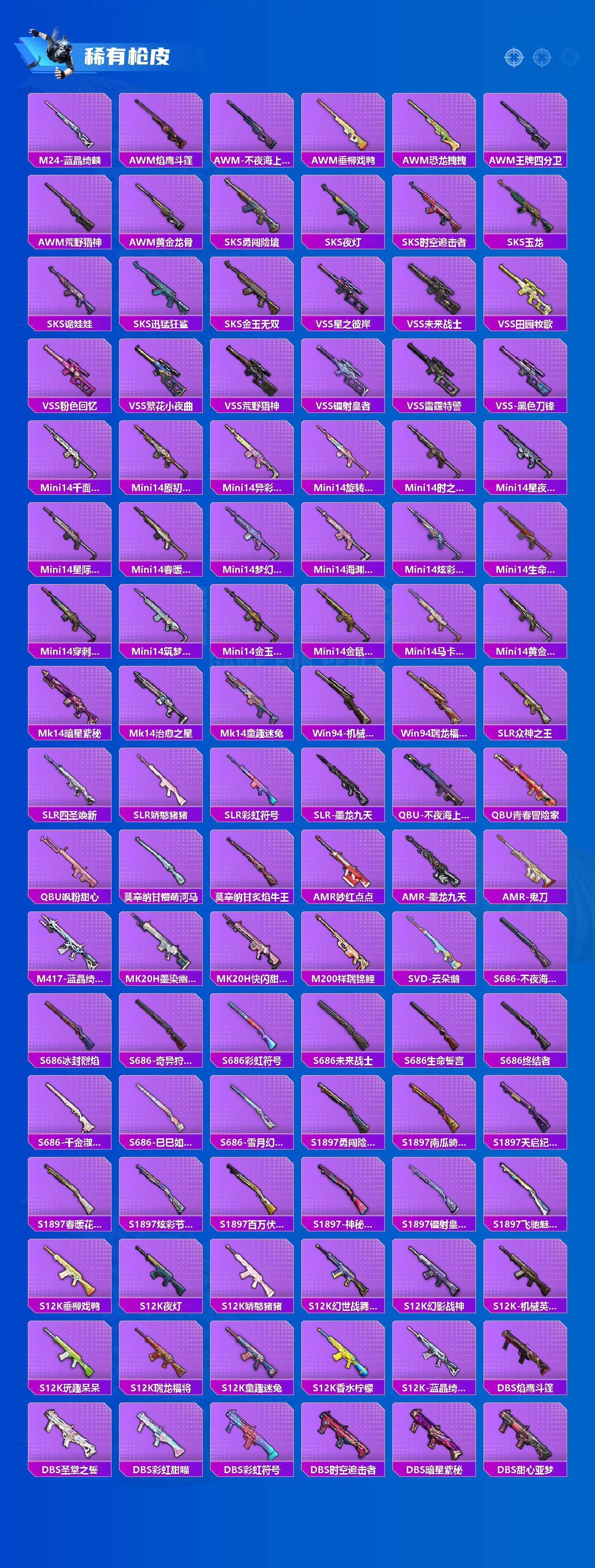 AKM-甜心宝贝,AKM-炫紫旋律,AKM-梦之光华,M16A4-垂柳戏鸭,SCAR-L-梦幻火箭,SCAR-L-童趣迷兔,M416-五爪金龙,M416-心之恋语,M416-至情至圣,M416-电玩时刻,M416-墨龙九天,GROZA-旋转彩虹,AUG-星之彼岸,M762-甜蜜誓约,M762-电糖天使,UZI-筑梦精灵,UMP45-雪国精灵,UMP45-相思残雪,P90-甜蜜草莓,Kar98K-巳巳如意,M24-莲影清波,AWM-橘柚倾心,Mk14-精灵梦叶罗丽,M249-彩虹甜喵,MG3-洛神天依