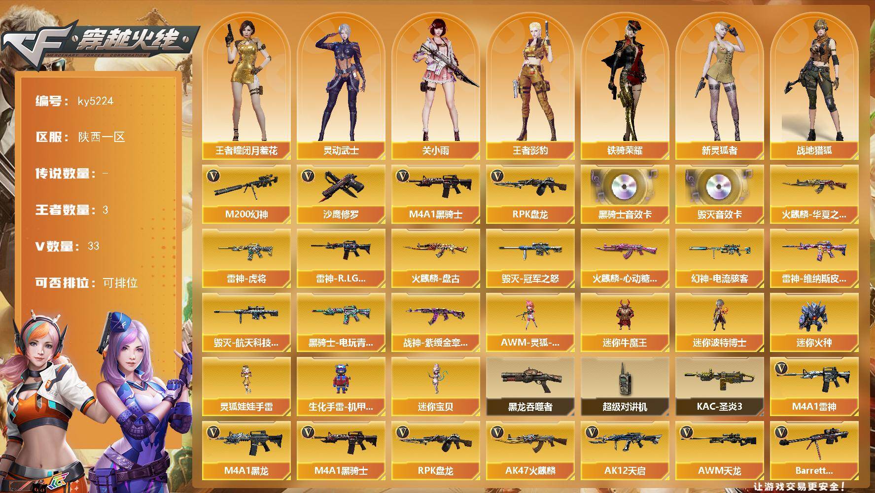[16879920]陕西一区-33V-3王者-0炫金 【热门武器】:M200-幻神,M4A1-黑骑士,RPK-盘龙,沙鹰-修罗 【音效卡】:M4A1-黑骑士音效卡,Barrett-毁灭音效卡 【皮肤】:幻神-电流骇客 皮肤,雷神-虎将,雷神-R.LGD-CFPLS18冠军,雷神-维纳斯皮肤,火麒麟-华夏之心,火麒麟-盘古,火麒麟-心动糖果,毁灭-冠军之怒,毁灭-航天科技皮肤,黑骑士-电玩青兔皮肤,战神-紫绶金章皮肤*2 【角色】:关小雨,战地猎狐,王者-瞳-闭月羞花,王者影豹,奇洋探员,乔伊教练,暗夜-X,嘉年华灵狐,疾风,娟娟,兰妹妹,灵动武士,萌儿,潘多拉-X,斯沃特-X,铁骑荣耀,兔囡囡,新灵狐者,游珑儿 【人偶武器】:迷你宝贝,AWM-灵狐-15周年嘉年华,迷你牛魔王,迷你波特博士*4,迷你火种,生化手雷-机甲核心,灵狐娃娃手雷 【暴走生化】:黑龙吞噬者,超级对讲机 【挑战大师】:KAC-圣炎切割者III 【英雄级武器】:AK47-火麒麟*2,M4A1-黑龙,M4A1-雷神,M4A1-黑骑士,AK12-天启,AK47-机械迷城,无影-神兵利器,黑武士-锦绣游龙,烈火-动感闪耀,黑骑士-海王,AWM-天龙,Barrett-毁灭,M200-幻神,RPK-盘龙,沙鹰-修罗,COP 357-雷霆王者-觉醒版,天神-动感闪耀,屠龙*2,麒麟刺,屠龙-动感闪耀,高爆手雷-幻灵*2,手雷-动感闪耀,手雷-热带奇洋,闪光弹-幻灵*3,烟雾弹-幻灵*2 【道具】:亚洲杯纪念炫彩背包,全能枪王背包,冰冰企鹅背包-猛男专用,奇洋探员-海龟背包,女皇终结者-背包,女皇终结者-魔龙之吻,绿色巨人,灵魂忍者,迷雾幽灵,生化弹匣,夺命之镰,防化服*2,金色流光-枪王排位*2,星辰流光-枪王排位,枪王排位28赛季金色流光,动感闪耀表情,C4-再燃火线,防弹头盔*7,防弹衣*7,C4工具钳*7,手雷包*7 【特殊枪械】:1黑骑士,1盘龙