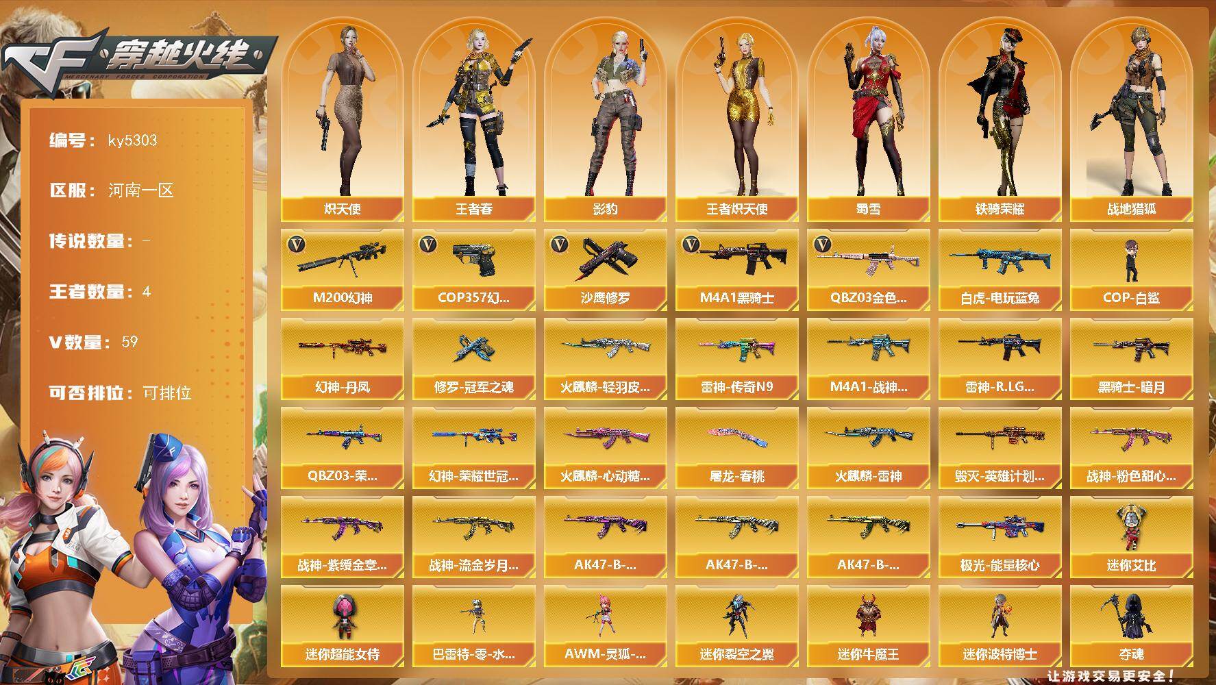[16881106]河南一区-60V-4王者武器数-0炫金武器数 【热门武器】:QBZ03-金色蔷薇,M200-幻神,白虎-电玩蓝兔,M4A1-黑骑士,COP-白鲨,COP 357-幻灵,沙鹰-修罗*3 【皮肤】:幻神-丹凤,M200-幻神-荣耀世冠白鲨,QBZ03-荣耀世冠白鲨,雷神-传奇N9,M4A1-战神赵云,雷神-R.LGD-CFPLS18冠军,火麒麟-雷神*2,火麒麟-轻羽皮肤,火麒麟-心动糖果,毁灭-英雄计划 皮肤,黑骑士-暗月,战神-粉色甜心皮肤,战神-紫绶金章皮肤,战神-流金岁月皮肤,AK47-B-常胜将军-曹操,AK47-B-常胜将军-刘备,AK47-B-常胜将军-孙权,极光-能量核心,修罗-冠军之魂,屠龙-春桃 皮肤 【角色】:影豹,战地猎狐,王者春,王者炽天使,奇洋探员,乔伊教练,修道士,云海玲珑,炽天使,暗夜-X,初恋灵狐,电竞少女,风暴女,嘉年华灵狐,娟娟,兰-新年限定,灵狐者-X,灵狐者-七夕宝贝,潘多拉-X,潘多拉-甜心教官,斯沃特-X,蜀雪,铁骑荣耀,兔囡囡 【人偶武器】:COP-白鲨,巴雷特-零-水下丽影,AWM-灵狐-15周年嘉年华,迷你裂空之翼,迷你牛魔王,迷你波特博士,夺魂,迷你牛牛,深渊终结者手雷,闪光弹-貂蝉,高爆手雷-大乔,迷你艾比,迷你超能女侍 【暴走生化】:超级对讲机 【挑战大师】:神圣爆裂者III,冰龙粉碎者-白马银枪*2,激光毁灭者III-白马银枪,激光毁灭者III,机甲撕裂者III,试炼破坏者III,神圣爆裂者-末日III,阐释者III,VEPR-12-紫魔 【英雄级武器】:AK47-火麒麟*2,M4A1-雷神,M4A1-黑骑士,无影-神兵利器,黑武士-锦绣游龙,QBZ03-金色蔷薇,烈火-动感闪耀,AK-47-猩红传说*2,AK47-B-战神,AK47-B-常胜将军*2,白虎-电玩蓝兔,Barrett-毁灭,M200-幻神,沙鹰-修罗*3,COP 357-幻灵,柯尔特-荣耀世冠EP,天神-动感闪耀,屠龙,幻灵之锋*2,擎天-竞技荣光,屠龙-动感闪耀,王者之啸-觉醒版,高爆手雷-幻灵*5,高爆手雷-竞技荣光*2,手雷-动感闪耀,闪光弹-幻灵*6,闪光弹-竞技荣光*2,烟雾弹-幻灵*6,烟雾弹-竞技荣光*2,烟雾弹-荣耀世冠EP,M4A1-赤狱骑士 【道具】:EDG炫彩背包,全能枪王背包,女皇终结者-背包,战舰背包,虎牙炫彩背包,