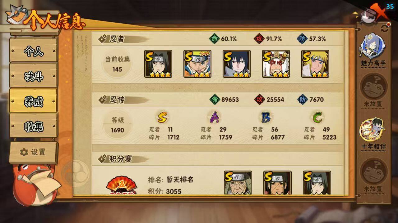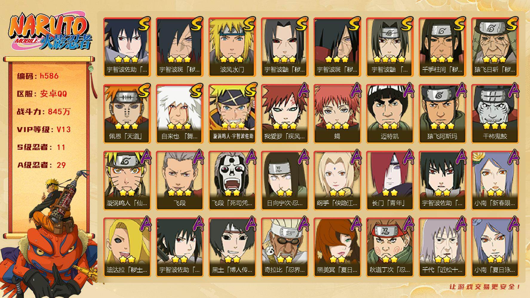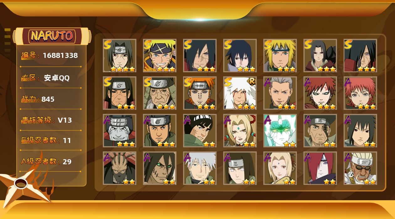 [16881338]11S级忍者数-29A级忍者数 【S级忍者】:猿飞日斩「秽土转生」(3星),千手柱间「秽土转生」(3星),宇智波鼬「秽土转生」(3星),宇智波斑「秽土转生」(3星),宇智波斑「秽土转生·解」(3星),宇智波鼬「须佐能乎」(4星),自来也「舞之豪杰」(3星),波风水门(3星),佩恩「天道」(3星),宇智波佐助「永恒万花筒」(3星),漩涡鸣人·宇智波佐助(3星) 【A级忍者】:长门「青年」(2星),迪达拉「秽土转生」(2星),奇拉比「忍界大战」(2星),飞段(3星),飞段「死司凭血」(2星),干柿鬼鲛(3星),漩涡鸣人「仙人模式」(2星),迈特凯(2星),旗木卡卡西「幻之真容」(2星),我爱罗「疾风传」(3星),蝎(3星),蝎「绯流琥」(2星),小南「新春限定」(2星),小南「夏日泳装」(2星),角都「秽土转生」(2星),猿飞阿斯玛(3星),宇智波佐助「须佐能乎」(2星),宇智波佐助「万花筒写轮眼」(2星),照美冥「夏日泳装」(2星),日向宁次「忍界大战」(2星),纲手「侠隐江湖」(2星),黑土「博人传」(2星),秋道丁次「忍界大战」(2星),千代「近松十人卫」(2星),土台「忍界大战」(2星),宇智波泉奈(2星),巳月「仙人模式」(2星),纲手「妖怪奇谭」(2星),迈特凯「青春爆炸」(2星)