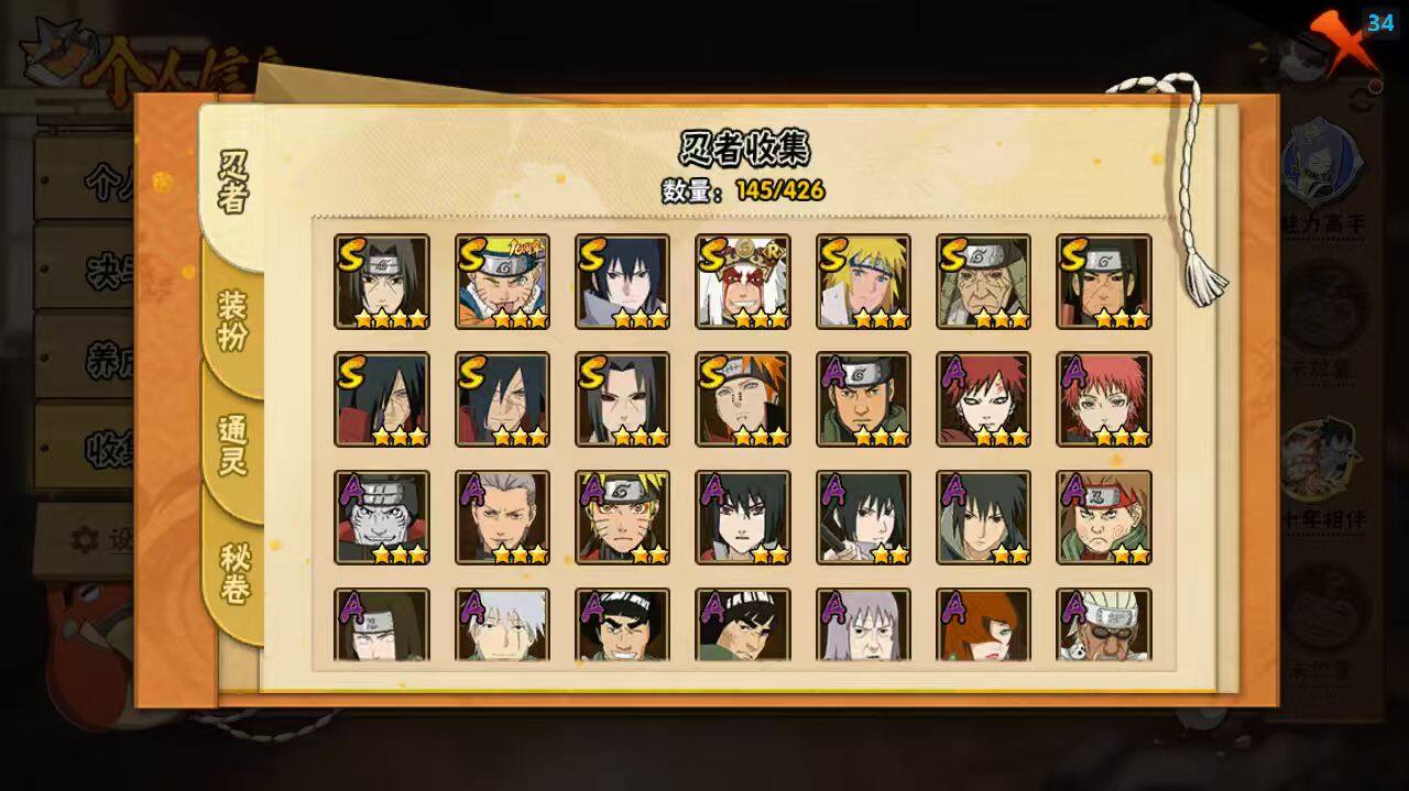 【S级忍者】:猿飞日斩「秽土转生」(3星),千手柱间「秽土转生」(3星),宇智波鼬「秽土转生」(3星),宇智波斑「秽土转生」(3星),宇智波斑「秽土转生·解」(3星),宇智波鼬「须佐能乎」(4星),自来也「舞之豪杰」(3星),波风水门(3星),佩恩「天道」(3星),宇智波佐助「永恒万花筒」(3星),漩涡鸣人·宇智波佐助(3星)