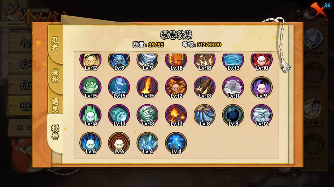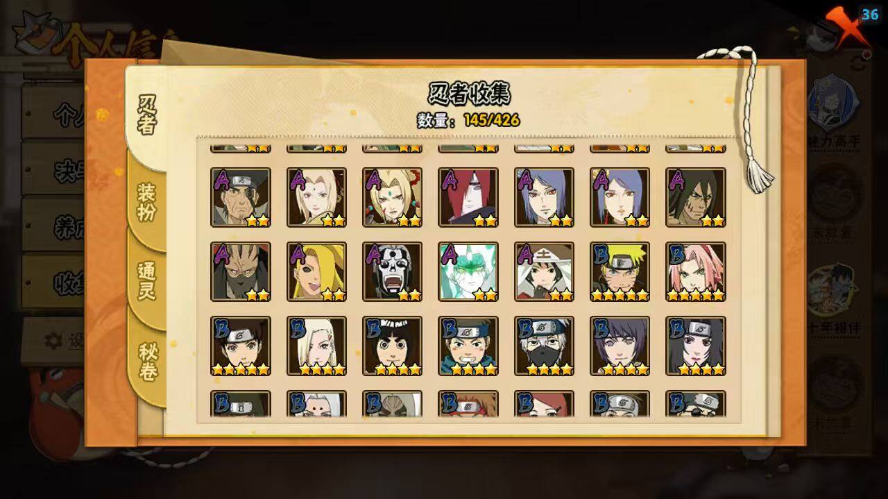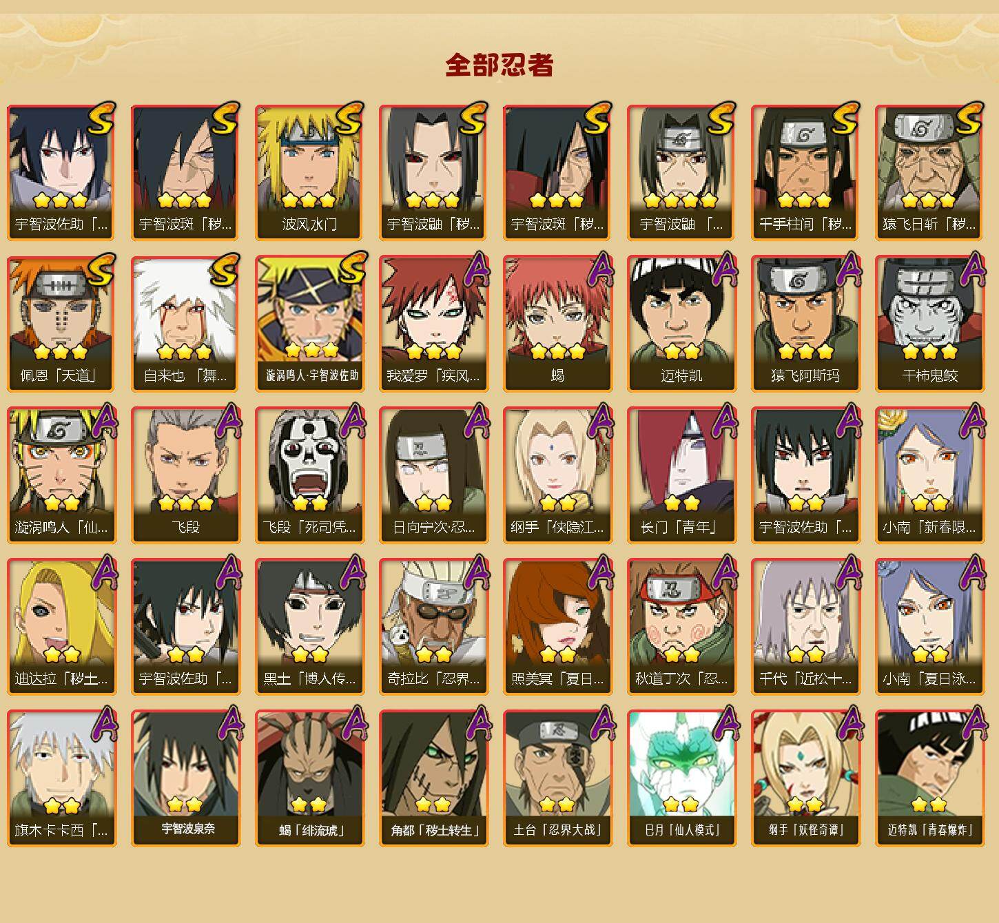 【A级忍者】:长门「青年」(2星),迪达拉「秽土转生」(2星),奇拉比「忍界大战」(2星),飞段(3星),飞段「死司凭血」(2星),干柿鬼鲛(3星),漩涡鸣人「仙人模式」(2星),迈特凯(2星),旗木卡卡西「幻之真容」(2星),我爱罗「疾风传」(3星),蝎(3星),蝎「绯流琥」(2星),小南「新春限定」(2星),小南「夏日泳装」(2星),角都「秽土转生」(2星),猿飞阿斯玛(3星),宇智波佐助「须佐能乎」(2星),宇智波佐助「万花筒写轮眼」(2星),照美冥「夏日泳装」(2星),日向宁次「忍界大战」(2星),纲手「侠隐江湖」(2星),黑土「博人传」(2星),秋道丁次「忍界大战」(2星),千代「近松十人卫」(2星),土台「忍界大战」(2星),宇智波泉奈(2星),巳月「仙人模式」(2星),纲手「妖怪奇谭」(2星),迈特凯「青春爆炸」(2星)