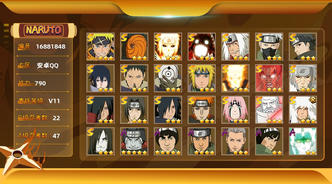 【S级忍者】:千手扉间「秽土转生」(3星),宇智波斑「秽土转生」(3星),春野樱「忍界大战」(3星),宇智波带土「忍界大战」(3星),宇智波鼬「须佐能乎」(3星),宇智波止水「须佐能乎」(3星),旗木卡卡西「须佐能乎」(3星),宇智波斑「木叶创立」(3星),自来也「舞之豪杰」(3星),大蛇丸(3星),自来也「传说中的三忍」(3星),波风水门(3星),漩涡鸣人「九喇嘛连结」(3星),迈特凯「死门」(3星),佩恩「天道」(3星),宇智波佐助「永恒万花筒」(3星),宇智波斑 「白面具」(3星宇智波斑「白面具」),大筒木金式(3星),漩涡鸣人「暴怒·第六尾」(3星),波风水门「九喇嘛连结」(3星),宇智波斑「五影会谈」(3星),漩涡鸣人·宇智波佐助(3星)