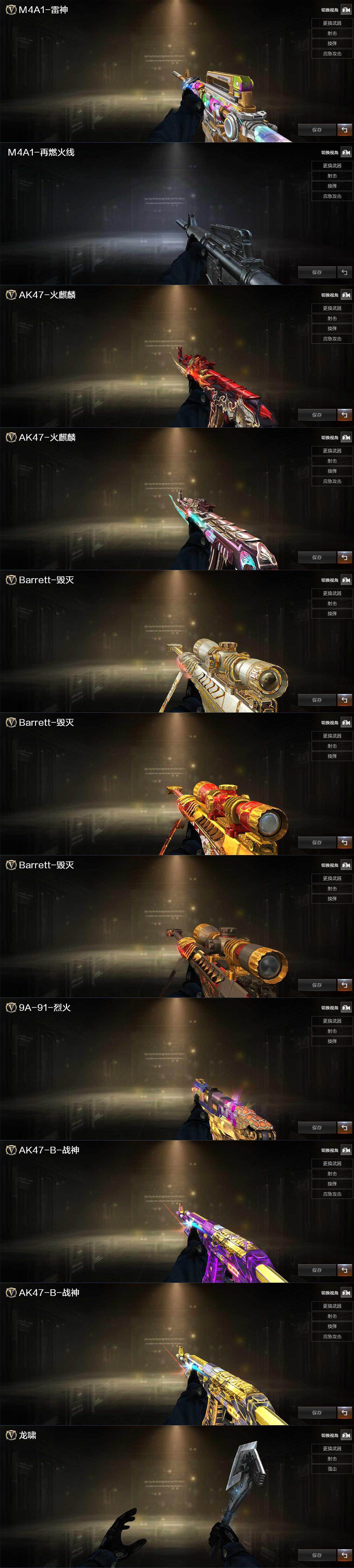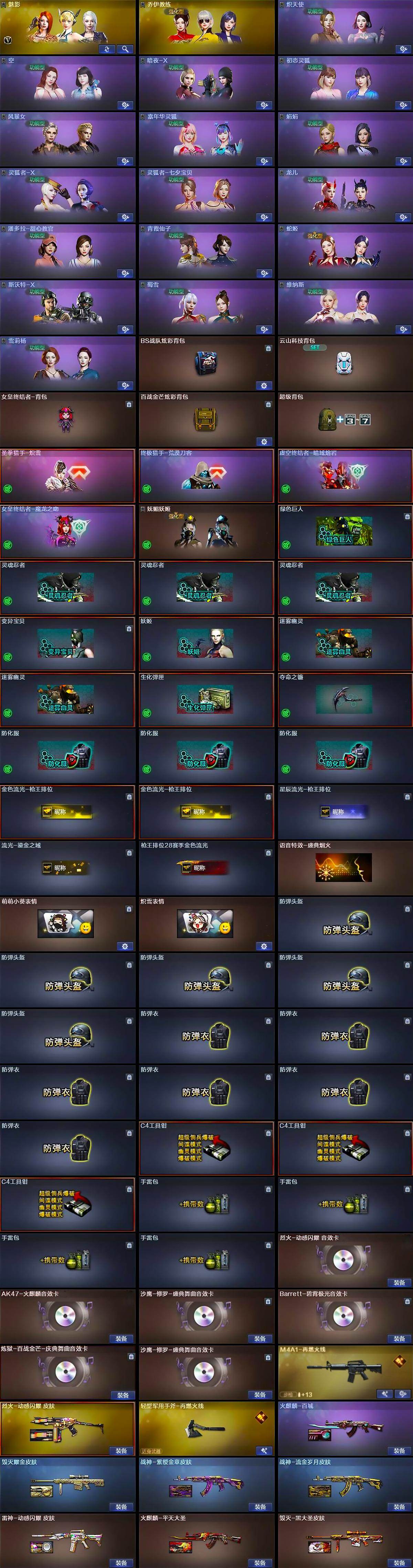 【英雄级武器】:AK47-火麒麟,M4A1-黑龙,M4A1-雷神,M4A1-黑骑士*3,AK47-无影,AN94-超新星,AK47-黑鲨,Scar Light-白虎,无影-神兵利器,M4A1-玫瑰精灵,王者之幻-觉醒版,AK47-B-战神,黑骑士-海王,QBZ-03-王者蔷薇-觉醒版,Barrett-毁灭,Barrett-极光,AWM-裁决,M200-竞技荣光,RPK-盘龙*5,加特林-炼狱*2,炼狱-百战金芒,汤姆逊-烈龙*6,沙鹰-修罗*2,天神-动感闪耀,屠龙,擎天,擎天-竞技荣光,斩神刀-雷暴,麒麟刺-百战金芒,王者之锋-觉醒版,丛林匕首-玄豹,高爆手雷-雷暴*2,手雷-动感闪耀,闪光弹-雷暴*2,闪光弹-竞技荣光,烟雾弹-雷暴*2,