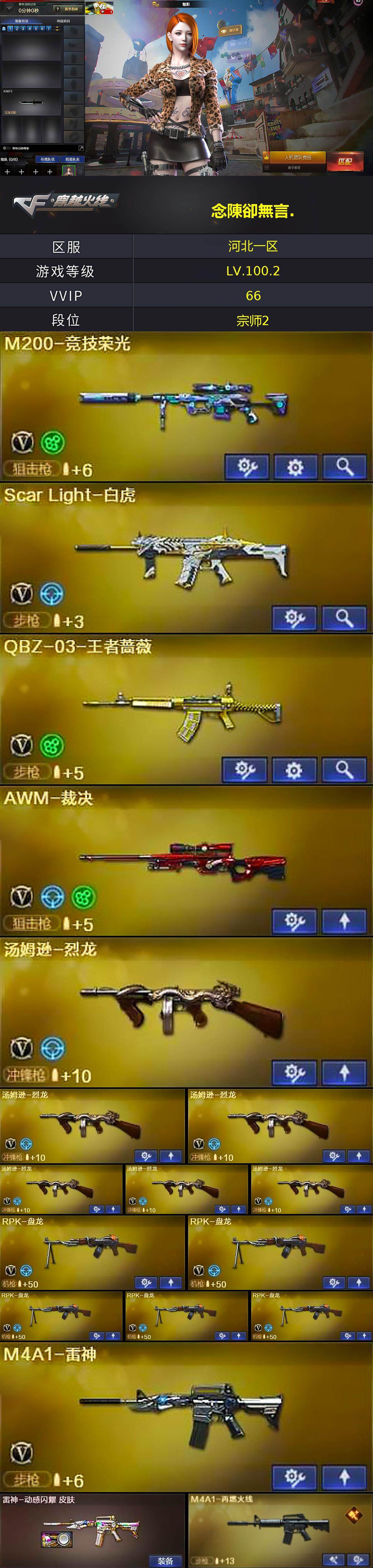 【热门武器】:Scar Light-白虎,M200-竞技荣光,死亡之眼*2,毒蜂,牛牛-AK47,M4A1-黑骑士*3,汤姆逊-烈龙*6,RPK-盘龙*5,加特林-炼狱*2,沙鹰-修罗*2