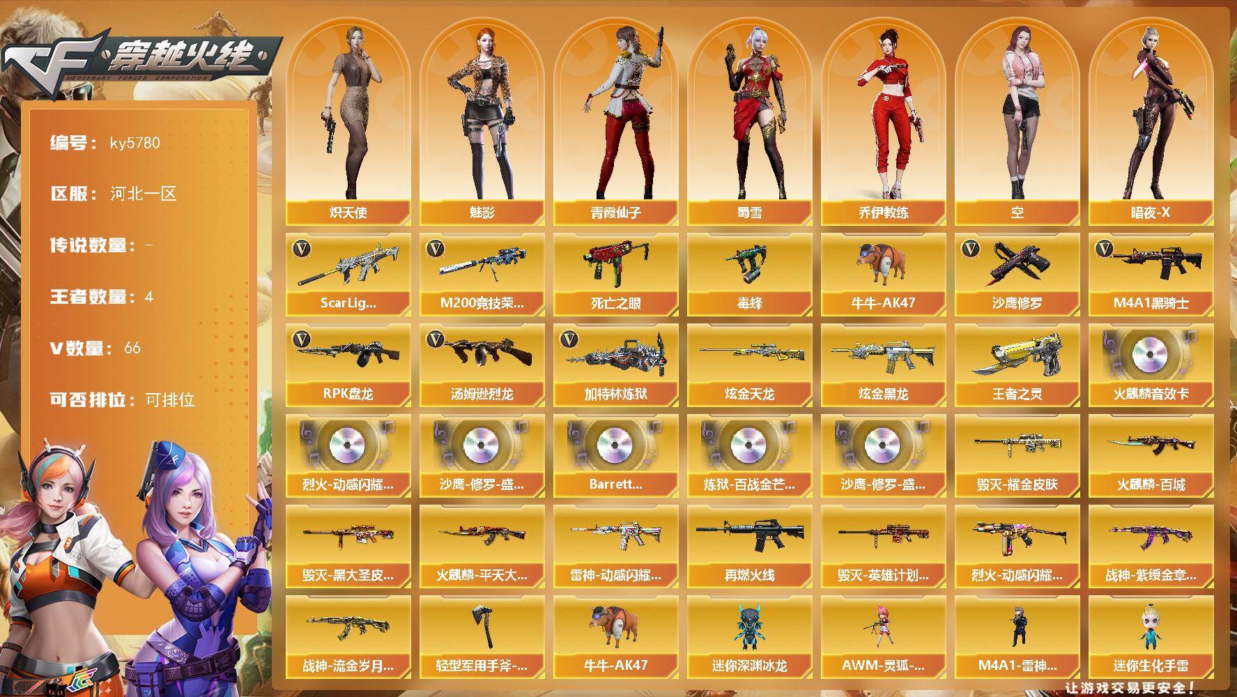 [16881945]河北一区-72V-4王者武器数-2炫金武器数 【热门武器】:Scar Light-白虎,M200-竞技荣光,死亡之眼*2,毒蜂,牛牛-AK47,M4A1-黑骑士*3,汤姆逊-烈龙*6,RPK-盘龙*5,加特林-炼狱*2,沙鹰-修罗*2 【王者炫金武器】:王者之灵,炫金黑龙,炫金天龙 【音效卡】:烈火-动感闪耀 音效卡,AK47-火麒麟音效卡,沙鹰-修罗-盛典舞曲音效卡*2,Barrett-碧霄极光音效卡,炼狱-百战金芒-庆典舞曲音效卡 【皮肤】:雷神-动感闪耀 皮肤,M4A1-再燃火线,火麒麟-平天大圣,火麒麟-百城,毁灭耀金皮肤,毁灭-黑大圣皮肤,毁灭-英雄计划 皮肤,烈火-动感闪耀 皮肤,战神-紫绶金章皮肤,战神-流金岁月皮肤,轻型军用手斧-再燃火线 【角色】:魅影,乔伊教练,炽天使,空,暗夜-X,初恋灵狐,风暴女,嘉年华灵狐,娟娟,灵狐者-X,灵狐者-七夕宝贝,龙儿,潘多拉-甜心教官,青霞仙子,蛇姬,斯沃特-X,蜀雪,兔囡囡,维纳斯,雪莉杨 【人偶武器】:M4A1-雷神-精英刀锋,迷你钢铁终结者,迷你救赎猎手,加特林-机械猎手,AWM-灵狐-15周年嘉年华,牛牛-AK47,迷你深渊冰龙,迷你生化手雷*2,生化手雷-机甲核心*2,深渊终结者手雷,闪光弹-小乔,COP-青花瓷-斯沃特精英 【暴走生化】:毒蜂,KAC-狂怒咆哮,死亡之眼*2,超级对讲机 【挑战大师】:神圣爆裂者III,AK47-冰龙粉碎者,冰龙粉碎者-白马银枪,激光毁灭者III,机甲撕裂者III,KAC-圣炎切割者III,神圣爆裂者-末日III,阐释者III 【英雄级武器】:AK47-火麒麟,M4A1-黑龙,M4A1-雷神,M4A1-黑骑士*3,AK47-无影,AN94-超新星,AK47-黑鲨,Scar Light-白虎,无影-神兵利器,M4A1-玫瑰精灵,王者之幻-觉醒版,AK47-B-战神,黑骑士-海王,QBZ-03-王者蔷薇-觉醒版,Barrett-毁灭,Barrett-极光,AWM-裁决,M200-竞技荣光,RPK-盘龙*5,加特林-炼狱*2,炼狱-百战金芒,汤姆逊-烈龙*6,沙鹰-修罗*2,天神-动感闪耀,屠龙,擎天,擎天-竞技荣光,斩神刀-雷暴,麒麟刺-百战金芒,王者之锋-觉醒版,丛林匕首-玄豹,高爆手雷-雷暴*2,手雷-动感闪耀,闪光弹-雷暴*2,闪光弹-竞技荣光,烟雾弹-雷暴*2,