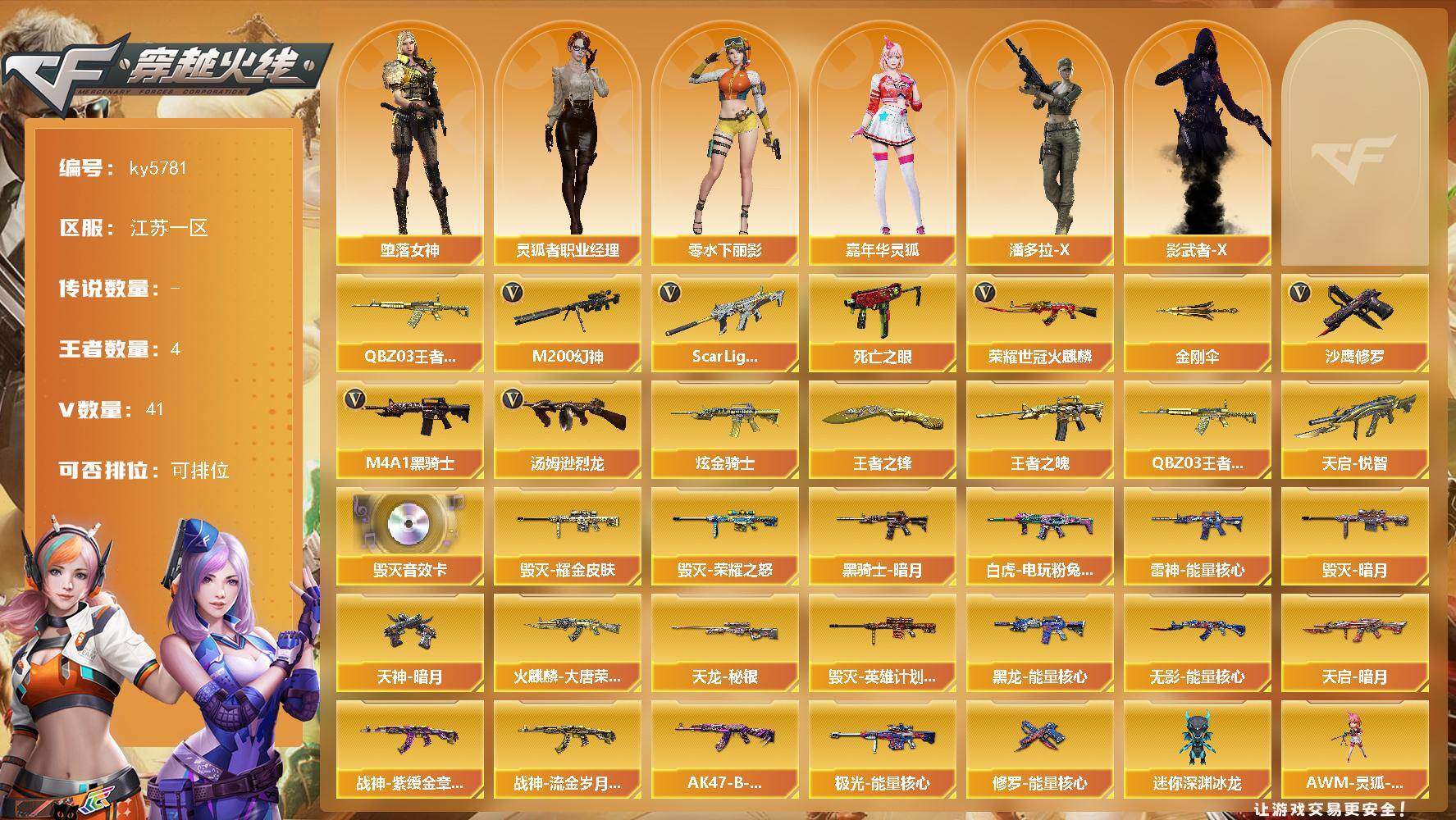 [16882057]江苏一区-41V-4王者武器数-1炫金武器数 【热门武器】:Scar Light-白虎,M200-幻神,QBZ-03-王者蔷薇,死亡之眼,荣耀世冠-火麒麟,M4A1-黑骑士,汤姆逊-烈龙,沙鹰-修罗*2,金刚伞 【王者炫金武器】:天启-悦智,王者之魄,QBZ-03-王者蔷薇,王者之锋,炫金骑士 【音效卡】:Barrett-毁灭音效卡 【皮肤】:白虎-电玩粉兔皮肤,雷神-能量核心,火麒麟-大唐荣光,毁灭-暗月,毁灭-荣耀之怒*2,毁灭耀金皮肤,毁灭-英雄计划 皮肤,黑龙-能量核心,黑骑士-暗月,无影-能量核心,天启-暗月,战神-紫绶金章皮肤,战神-流金岁月皮肤*3,AK47-B-常胜将军-曹操,天龙-秘银,极光-能量核心,修罗-能量核心,天神-暗月*3 【角色】:堕落女神,嘉年华灵狐,零-水下丽影,灵狐者-职业经理,潘多拉-X,影武者-X 【人偶武器】:AWM-灵狐-15周年嘉年华,M4A1-刀锋,迷你深渊冰龙,迷你波特博士,闪光弹-小乔 【暴走生化】:KAC-狂怒咆哮,死亡之眼 【挑战大师】:冰龙粉碎者-白马银枪,神圣爆裂者-末日III,阐释者III*2 【英雄级武器】:AK47-火麒麟,M4A1-黑龙,M4A1-雷神*2,M4A1-黑骑士,AK47-黑武士,AN94-超新星*2,AK47-机械迷城*2,M4A1-龙血,Scar Light-白虎,M4A1-神工天巧,无影-神兵利器,M4A1-玫瑰精灵,AK-47-猩红传说,AK47-B-战神*2,黑骑士-海王,荣耀世冠-火麒麟,AWM-天龙,Barrett-毁灭*2,Barrett-极光,M200-幻神,汤姆逊-烈龙,沙鹰-修罗*2,沙鹰-天神,USP-神工天巧,屠龙*2,擎天,麒麟刺*2,幻灵之锋,唐刀-神工天巧,闪光弹-神工天巧 【道具】:全能枪王背包,炫彩背包,超级背包,绿色巨人,灵魂忍者,迷雾幽灵,夺命之镰,防化服*2,金色流光-枪王排位*2,枪王排位29赛季金色流光,斯沃特表情,EP战队名片,C4-红龙,防弹头盔*2,防弹衣*2,C4工具钳*2,手雷包*2 【特殊枪械】:1白虎,1黑骑士,1烈龙