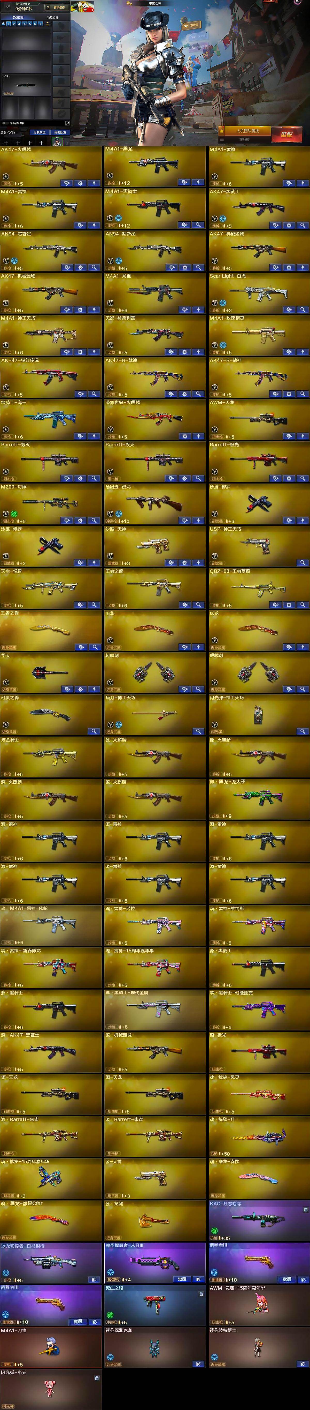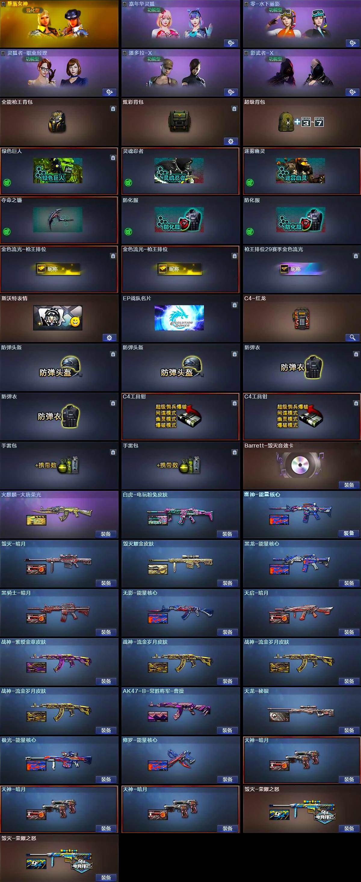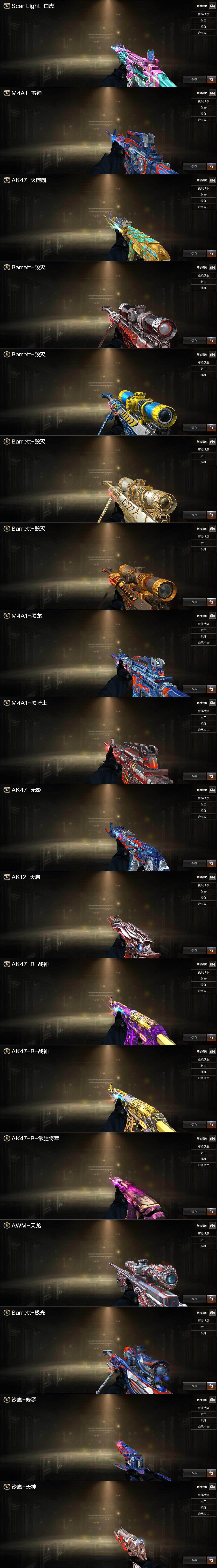 【英雄级武器】:AK47-火麒麟,M4A1-黑龙,M4A1-雷神*2,M4A1-黑骑士,AK47-黑武士,AN94-超新星*2,AK47-机械迷城*2,M4A1-龙血,Scar Light-白虎,M4A1-神工天巧,无影-神兵利器,M4A1-玫瑰精灵,AK-47-猩红传说,AK47-B-战神*2,黑骑士-海王,荣耀世冠-火麒麟,AWM-天龙,Barrett-毁灭*2,Barrett-极光,M200-幻神,汤姆逊-烈龙,沙鹰-修罗*2,沙鹰-天神,USP-神工天巧,屠龙*2,擎天,麒麟刺*2,幻灵之锋,唐刀-神工天巧,闪光弹-神工天巧