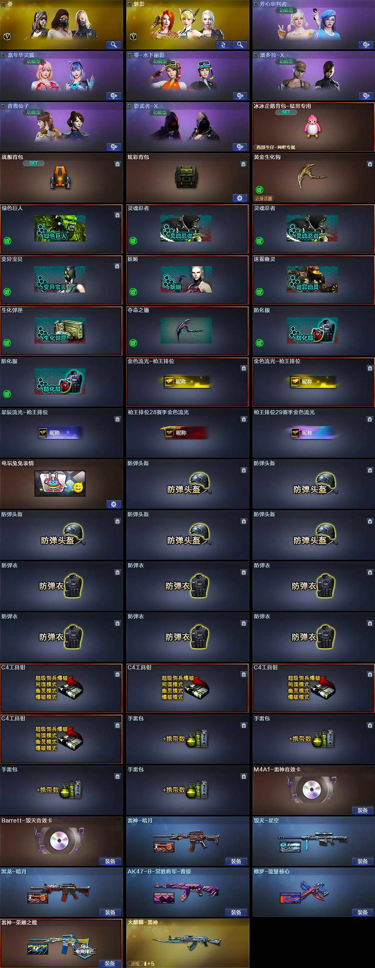 【道具】:冰冰企鹅背包-猛男专用,战舰背包,炫彩背包,黄金生化钩,绿色巨人,灵魂忍者*2,变异宝贝,妖姬,迷雾幽灵,生化弹匣,夺命之镰,防化服*2,金色流光-枪王排位*2,星辰流光-枪王排位,枪王排位28赛季金色流光,枪王排位29赛季金色流光,电玩兔兔表情,防弹头盔*5,防弹衣*6,C4工具钳*4,手雷包*4