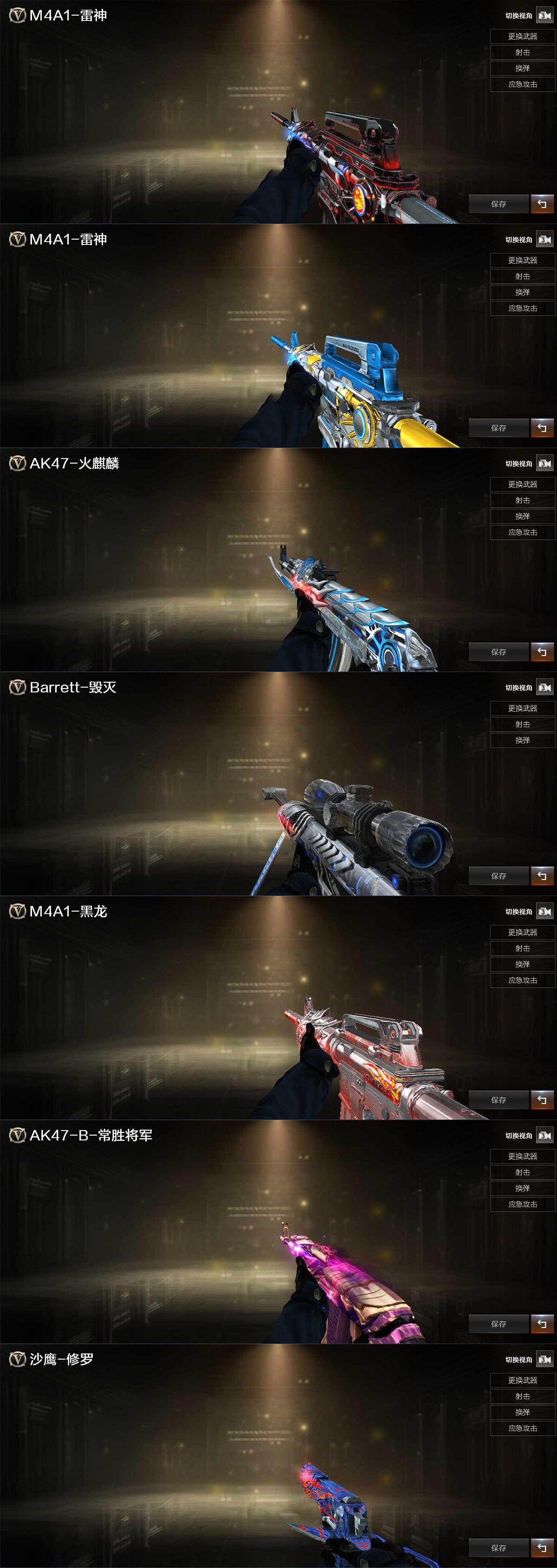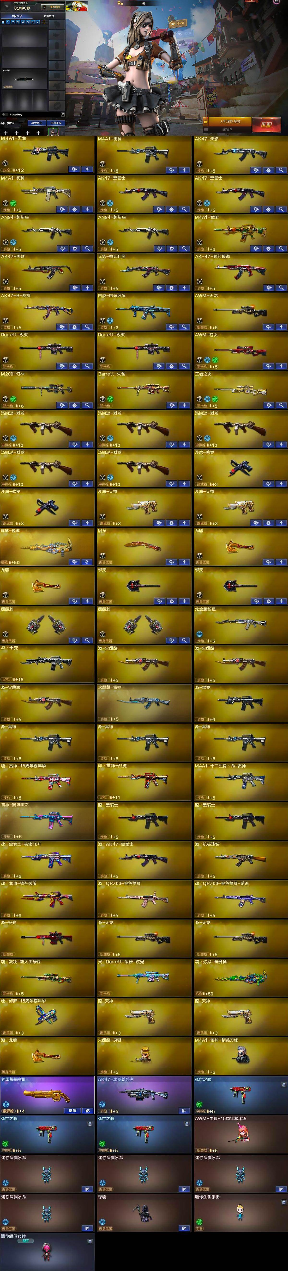 【英雄级武器】:M4A1-黑龙,M4A1-雷神,AK47-无影,M4A1-死神,AK47-黑武士*2,AN94-超新星*2,M4A1-武圣,AK47-黑鲨,无影-神兵利器,AK-47-猩红传说,AK47-B-战神,白虎-电玩蓝兔,AWM-天龙,Barrett-毁灭*2,AWM-裁决,M200-幻神,Barrett-朱雀,王者之决-觉醒版,汤姆逊-烈龙*5,沙鹰-修罗*2,沙鹰-天神*2,屠龙,龙啸*2,擎天*2,麒麟刺*2