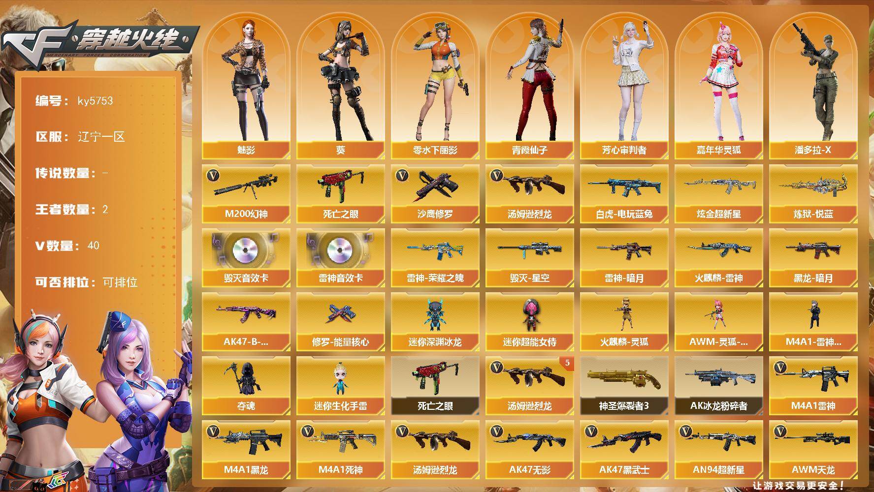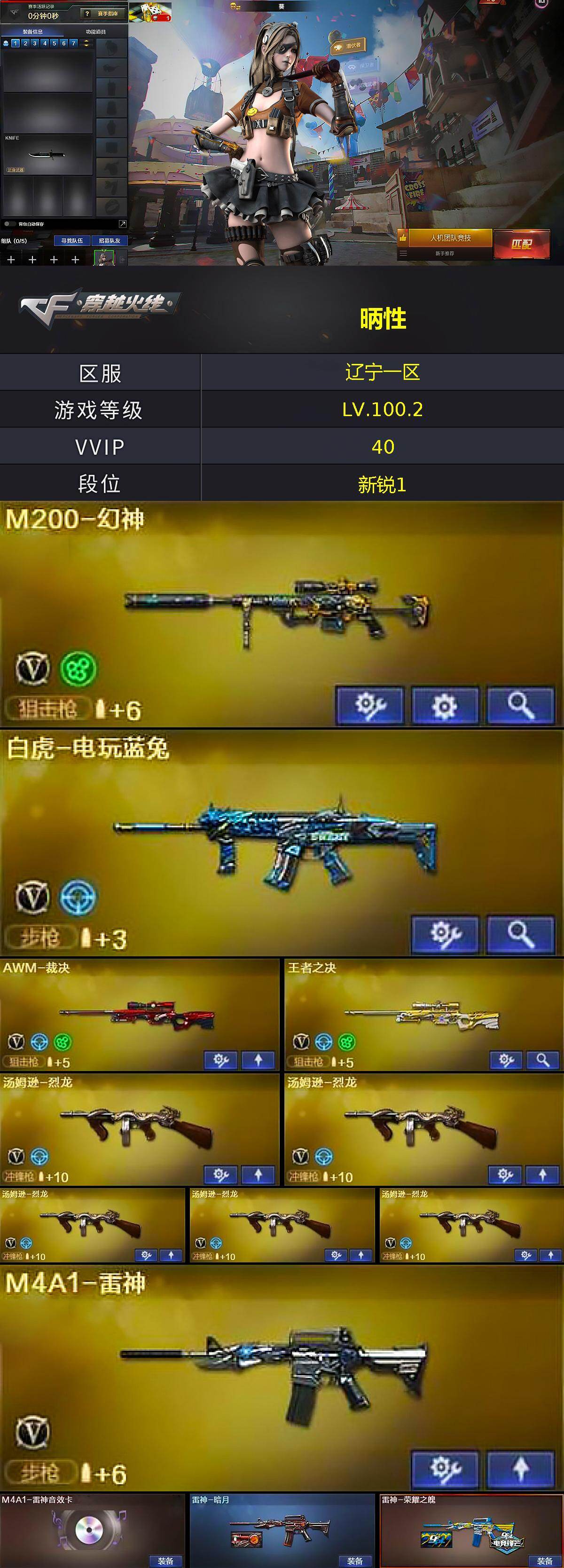 [16882073]辽宁一区-41V-2王者武器数-1炫金武器数 【热门武器】:M200-幻神,死亡之眼*3,白虎-电玩蓝兔,汤姆逊-烈龙*5,沙鹰-修罗*2 【王者炫金武器】:炼狱-悦蓝,炫金超新星 【音效卡】:M4A1-雷神音效卡,Barrett-毁灭音效卡 【皮肤】:雷神-暗月,雷神-荣耀之魄,火麒麟-雷神,毁灭-星空,黑龙-暗月,AK47-B-常胜将军-曹操,修罗-能量核心 【角色】:葵,魅影,芳心审判者,嘉年华灵狐,零-水下丽影,潘多拉-X,青霞仙子,影武者-X 【人偶武器】:火麒麟-灵狐,M4A1-雷神-精英刀锋,AWM-灵狐-15周年嘉年华,迷你深渊冰龙*4,夺魂,迷你生化手雷,迷你超能女侍 【暴走生化】:死亡之眼*3 【挑战大师】:神圣爆裂者III,AK47-冰龙粉碎者 【英雄级武器】:M4A1-黑龙,M4A1-雷神,AK47-无影,M4A1-死神,AK47-黑武士*2,AN94-超新星*2,M4A1-武圣,AK47-黑鲨,无影-神兵利器,AK-47-猩红传说,AK47-B-战神,白虎-电玩蓝兔,AWM-天龙,Barrett-毁灭*2,AWM-裁决,M200-幻神,Barrett-朱雀,王者之决-觉醒版,汤姆逊-烈龙*5,沙鹰-修罗*2,沙鹰-天神*2,屠龙,龙啸*2,擎天*2,麒麟刺*2 【道具】:冰冰企鹅背包-猛男专用,战舰背包,炫彩背包,黄金生化钩,绿色巨人,灵魂忍者*2,变异宝贝,妖姬,迷雾幽灵,生化弹匣,夺命之镰,防化服*2,金色流光-枪王排位*2,星辰流光-枪王排位,枪王排位28赛季金色流光,枪王排位29赛季金色流光,电玩兔兔表情,防弹头盔*5,防弹衣*6,C4工具钳*4,手雷包*4 【特殊枪械】:5烈龙