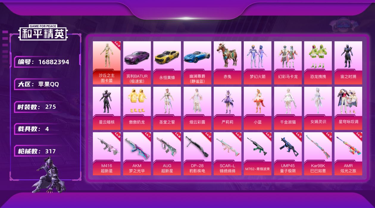 [16882394]【1630】苹果 手Q-1神装-13粉装-16特效枪-4载具-15粉色飞行器-120687热力值-21王牌印记-275套装-317枪皮 【红色神装等级】:沙丘之主-图卡盟(三级) 【红色角色神装】:沙丘之主-图卡盟 【热门品类】:粉装-梦幻火箭,套装-浪漫天命,套装-小丑鱼,角色-忠猛周仓,角色-忠真马岱,套装-龟仙人,套装-粉红小猪,角色-8号机,角色-Mark.06,角色-六号稻草人,大砍刀-青龙偃月刀,撬棍-龙胆亮银枪 【粉色载具】:宾利BATUR(极速紫),永恒黄蜂,幽澜尊爵(静谧蓝),赤兔 【粉色套装】:粉装-梦幻火箭,粉装-幻彩马卡龙,粉装-恐龙拽拽,角色-宙之时溯,角色-星云暗核,粉装-傲傲奶龙,角色-圣堂之誓,角色-烟云彩露,角色-严莉莉,角色-小蓝,角色-千金淑猫,角色-女娲灵识,粉装-星穹咏叹调 【粉色枪皮等级】:AKM-梦之光华(七级),SCAR-L-锦绣绵绵(五级),M416-风花雪月(一级),M416-超新星(九级),GROZA-精灵之光(三级),AUG-超新星(六级),M762-青锋波束(五级),UMP45-量子极限(五级),P90-沙丘之主(三级),Kar98K-巳巳如意(五级),M24-镜域双华(三级),Mk14-盛世惊鸿(三级),AMR-炫光之旅(五级),MK12-雪月幻音(三级),DP-28-豹影疾电(五级) 【粉色枪皮】:AKM-梦之光华,SCAR-L-锦绣绵绵,M416-风花雪月,M416-超新星,GROZA-精灵之光,AUG-超新星,M762-青锋波束,UMP45-量子极限,P90-沙丘之主,Kar98K-巳巳如意,M24-镜域双华,Mk14-盛世惊鸿,AMR-炫光之旅,MK12-雪月幻音,DP-28-豹影疾电,破片手榴弹-秋玉花灯 【粉色飞行器】:酣梦熊熊飞行器,萌物绒绒飞行器,超新星飞行器,万古烈焰飞行器,沙丘之主天马,镜域双华-灵镜之阶,绝色倾城飞行器,龙翔九天飞行器,深渊漩涡飞行器,幽焰列车飞行器,脆鲨七海飞行器,凤舞九天飞行器,赛博古神飞行器,极意拳锋飞行器 【粉色降落伞】:至尊龙雀降落伞,精灵迷巫降落伞,梦幻火箭降落伞,古堡领主降落伞,甜蜜誓约降落伞,星之彼岸降落伞,甜梦小狐降落伞,暗夜鎏金降落伞,第五大道降落伞,萌物绒绒降落伞,炫光之旅降落伞,莲影清波降落伞,圣堂之誓降落伞,沙丘之主降落伞,蜜语绒猫降落伞,镜
