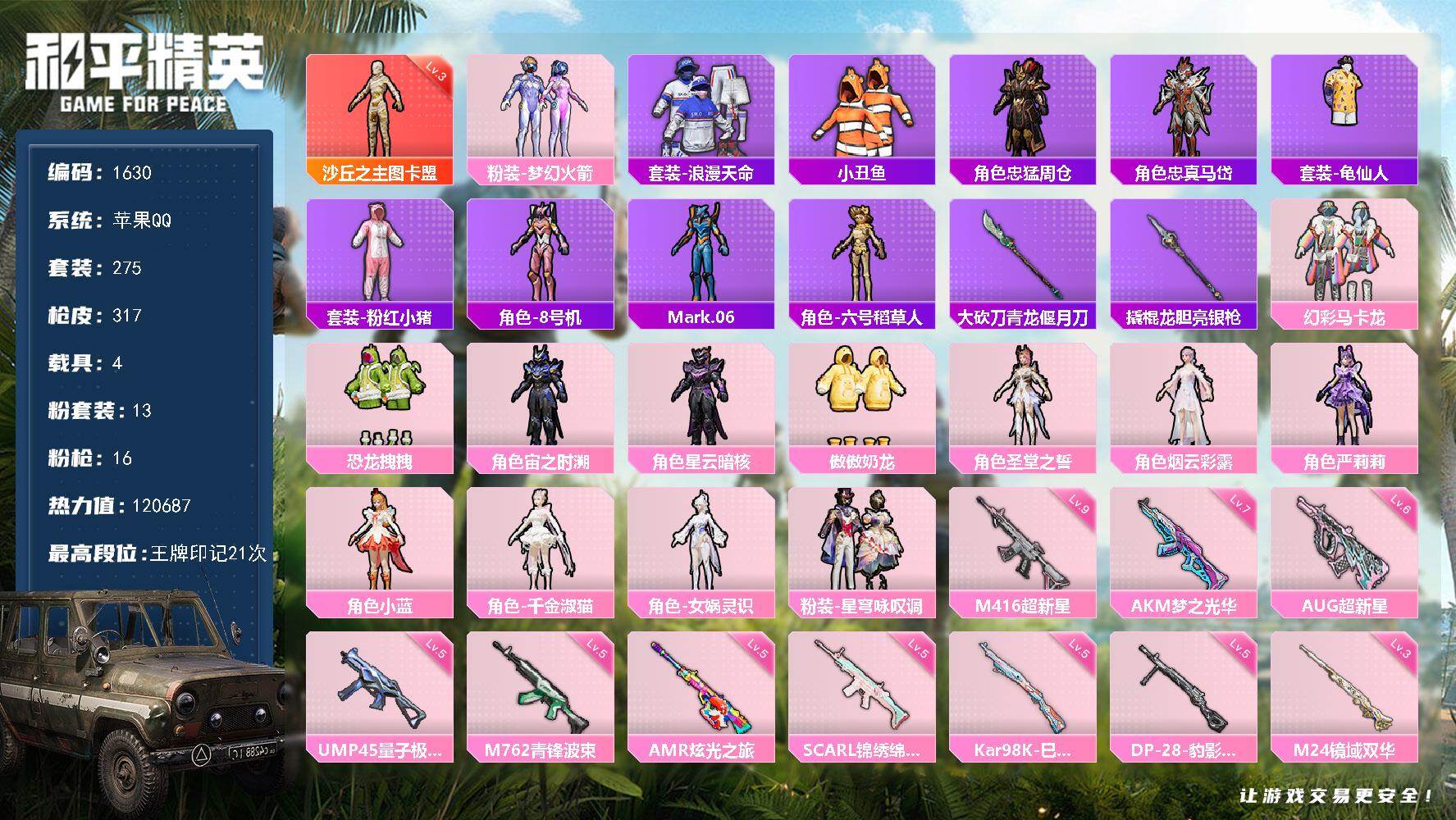 [16882394]【1630】苹果 手Q-1神装-13粉装-16特效枪-4载具-15粉色飞行器-120687热力值-21王牌印记-275套装-317枪皮