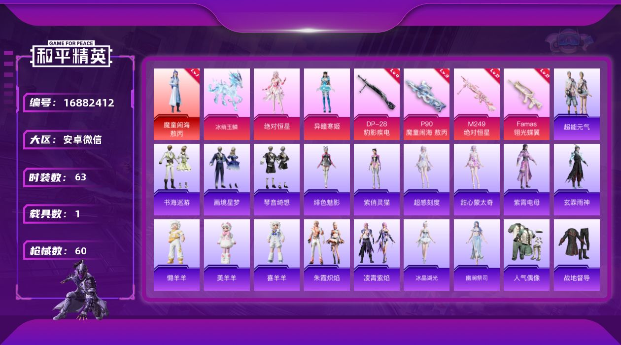 [16882412]安卓 微信-1神装-2粉装-4特效枪-1载具-3粉色飞行器-23694热力值-1王牌印记-63套装-60枪皮