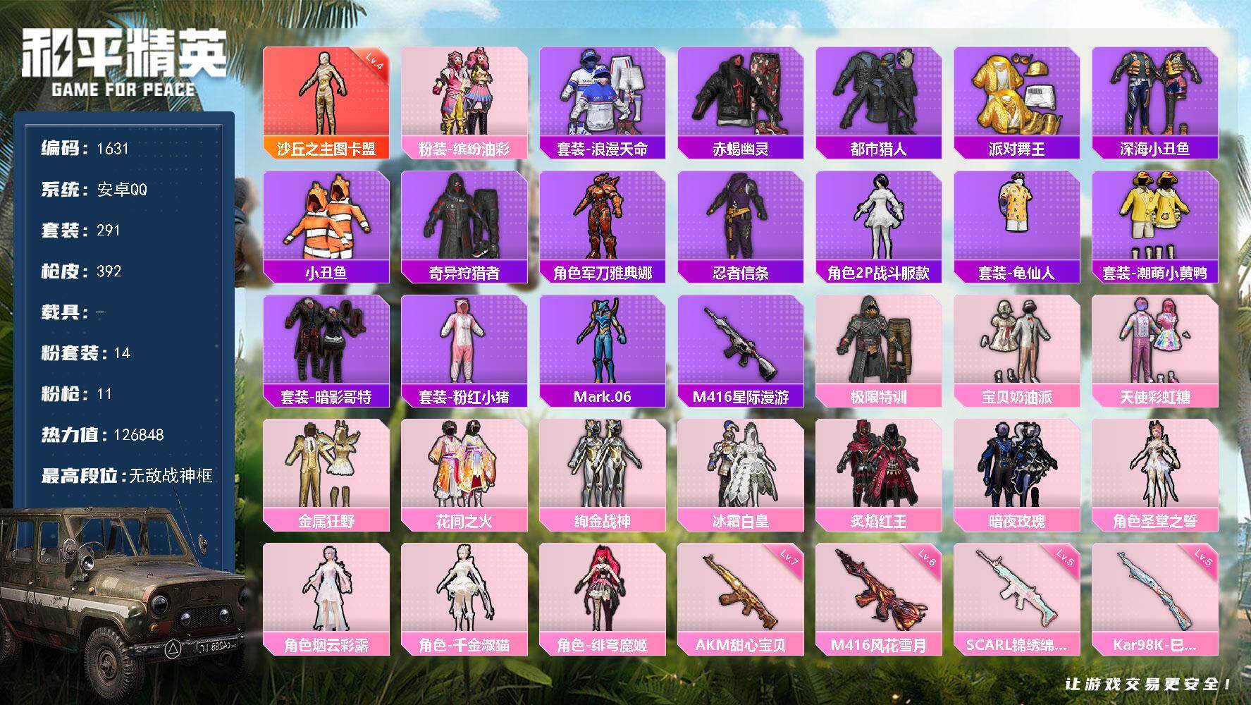 [16882600]【1631】安卓 手Q-无敌战神框-1神装-14粉装-11特效枪-0载具-6粉色飞行器-126848热力值-25王牌印记-291套装-392枪皮