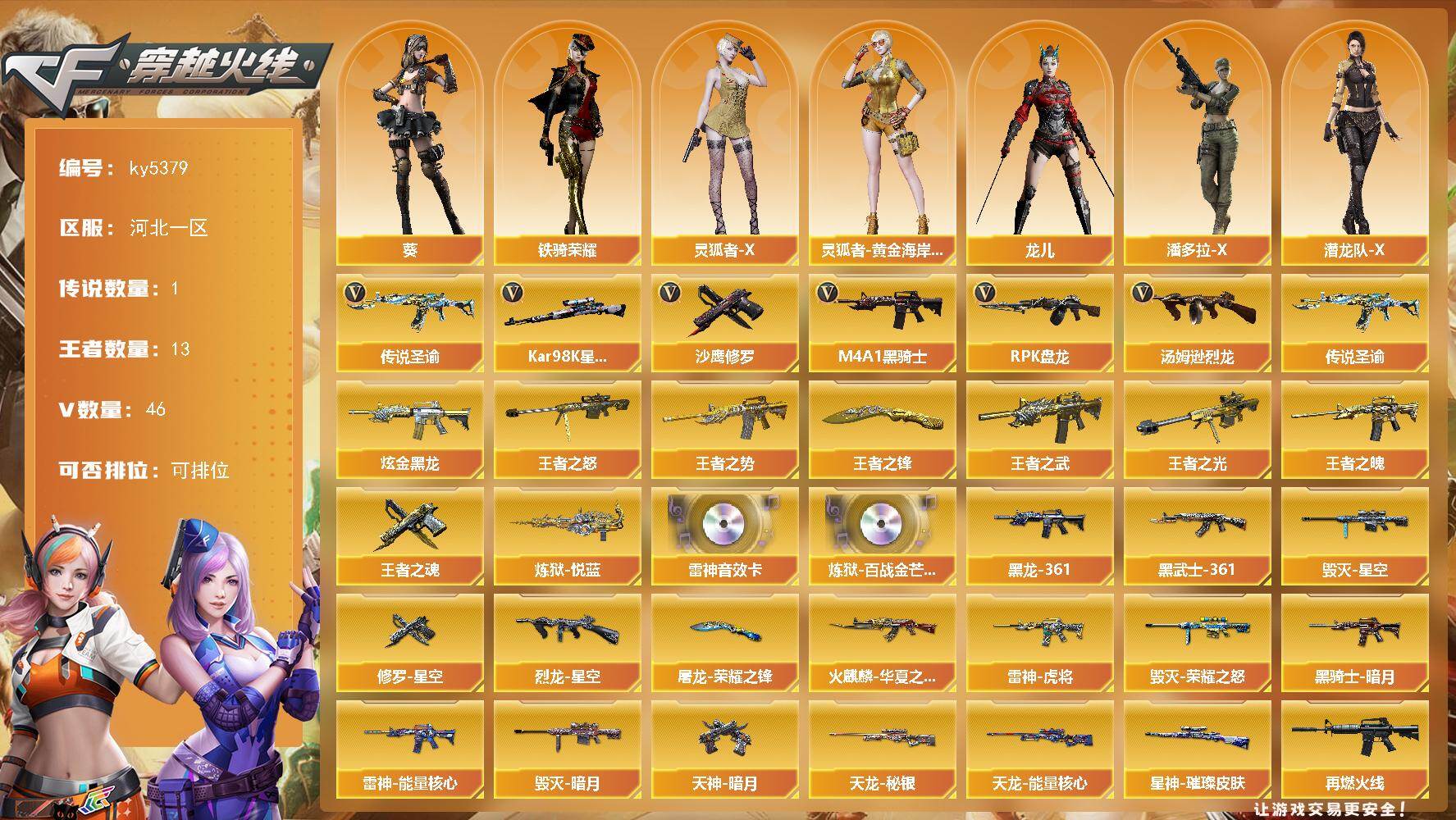 [16882710]河北一区-48V-13王者武器数-2炫金武器数 【传说武器】:传说圣谕 【传说角色】:传说星骇 【热门武器】:传说圣谕,Kar98K-星神,M4A1-黑骑士,汤姆逊-烈龙*2,RPK-盘龙*3,沙鹰-修罗*5 【王者炫金武器】:王者之势,王者之武,王者之魄,王者之光,王者之怒*2,炼狱-悦蓝*2,王者之魂,王者之锋*2,炫金黑龙*2 【音效卡】:M4A1-雷神音效卡,炼狱-百战金芒-庆典舞曲音效卡 【皮肤】:星神-璀璨皮肤,烈龙-星空,雷神-能量核心*2,雷神-虎将,M4A1-再燃火线,火麒麟-华夏之心,毁灭-暗月,毁灭-荣耀之怒,毁灭-星空,黑龙-能量核心,黑龙-暗月*2,M4A1-黑龙-361,黑骑士-暗月,无影-暗月*5,无影-能量核心,死神-秘银*2,AK47-黑武士-361,天启-暗月,天龙-秘银*2,天龙-能量核心,修罗-能量核心*2,修罗-星空,天神-暗月*4,屠龙-荣耀之锋,轻型军用手斧-再燃火线 【角色】:葵,灵狐者-X,灵狐者-黄金海岸,龙儿,潘多拉-X,潜龙队-X,铁骑荣耀,雪莉杨 【英雄级武器】:M4A1-千变,AK47-火麒麟,M4A1-黑龙,M4A1-雷神,M4A1-黑骑士,M4A1-死神,AK47-黑武士,AK12-天启*4,AWM-天龙,Barrett-毁灭*2,Barrett-极光,AWM-裁决,Kar98K-星神,RPK-盘龙*3,炼狱-百战金芒,汤姆逊-烈龙*2,AA-12-雷霆,沙鹰-修罗*5,沙鹰-天神*2,屠龙*2,龙啸,擎天*2,麒麟刺,麒麟刺-百战金芒,王者之锋-觉醒版,丛林匕首-玄豹,王者冰锋-觉醒版,高爆手雷-玄豹 【道具】:战舰背包,炫彩背包,百战金芒炫彩背包,超级背包,女皇终结者-魔龙之吻,绿色巨人,灵魂忍者,变异宝贝,迷雾幽灵,夺命之镰,防化服*3,语音特效-盛典烟火,萌萌小葵表情,防弹头盔*3,防弹衣*3,C4工具钳*3,手雷包*3 【特殊枪械】:1黑骑士,2烈龙,3盘龙
