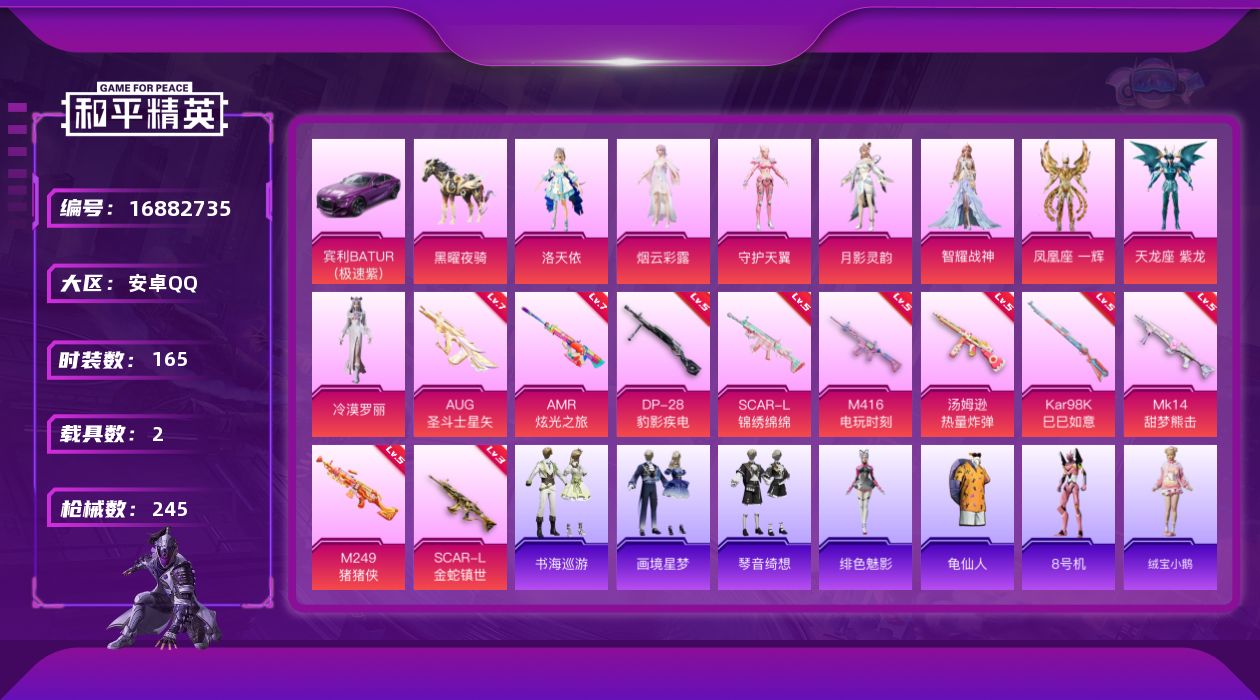 [16882735]安卓 手Q-8粉装-10特效枪-2载具-10粉色飞行器-80401热力值-11王牌印记-165套装-245枪皮 【热门品类】:套装-龟仙人,角色-8号机 【粉色套装】:角色-洛天依,角色-烟云彩露,角色-守护天翼,角色-月影灵韵,角色-智耀战神,角色-凤凰座 一辉,角色-天龙座 紫龙,角色-冷漠罗丽 【粉色枪皮等级】:SCAR-L-锦绣绵绵(五级),SCAR-L-金蛇镇世(三级),M416-电玩时刻(五级),AUG-圣斗士星矢(七级),汤姆逊-热量炸弹(五级),Kar98K-巳巳如意(五级),Mk14-甜梦熊击(五级),AMR-炫光之旅(七级),M249-猪猪侠(五级),DP-28-豹影疾电(五级) 【粉色载具】:宾利BATUR(极速紫),黑曜夜骑 【粉色枪皮】:SCAR-L-锦绣绵绵,SCAR-L-金蛇镇世,M416-电玩时刻,AUG-圣斗士星矢,汤姆逊-热量炸弹,Kar98K-巳巳如意,Mk14-甜梦熊击,AMR-炫光之旅,M249-猪猪侠,DP-28-豹影疾电 【粉色飞行器】:炫彩糖果飞行器,祥瑞起舞飞行器,天之羽翼飞行器,绝色倾城飞行器,幽焰列车飞行器,万象金身飞行器,御兔特攻飞行器,终晖之翼飞行器,暮色之舞飞行器 【粉色降落伞】:天之羽翼降落伞,闪光银龙降落伞,环太平洋降落伞,萌物绒绒降落伞,炫光之旅降落伞,莲影清波降落伞,猪猪侠降落伞,祥瑞锦鲤降落伞,花傲天降落伞,繁龙极客降落伞,蜜语绒猫降落伞,绝色倾城降落伞,江南烟雨降落伞,电糖天使降落伞,创世·救赎降落伞,时空协奏降落伞,BEARBRICK降落伞,未来领航者降落伞,千金淑猫降落伞,信仰神谕降落伞,月影灵韵降落伞,动力核心降落伞,盛世惊鸿降落伞,金蛇镇世降落伞,幻影飞狐降落伞,彩虹独角兽降落伞,月下星之子降落伞,雪月幻音降落伞,星穹咏叹调降落伞,智趣喵喵降落伞,宁雨蝶降落伞,荧海星豚降落伞,异瞳寒姬降落伞,炫彩糖果降落伞 【稀有套装】:套装-龟仙人,套装-绒宝小鹅,套装-巳巳如意,套装-小鸟芋圆,套装-雪国风尚,套装-炫彩糖果,套装-雏菊兔兔,套装-萝兰蝴蝶,套装-小熊娃娃,角色-多纳泰罗,角色-狂花道·娜可露露,套装-速跑银狼,套装-糖糖葫芦,套装-青团波波,套装-棉花软糖,角色-许七安,套装-燕燕于飞,套装-鱼渊荷华,套装-晶灵使者,套装-旋风灵鼠,角色-冰晶湖光,套装-新风雅兰,套装-樱梦幻音