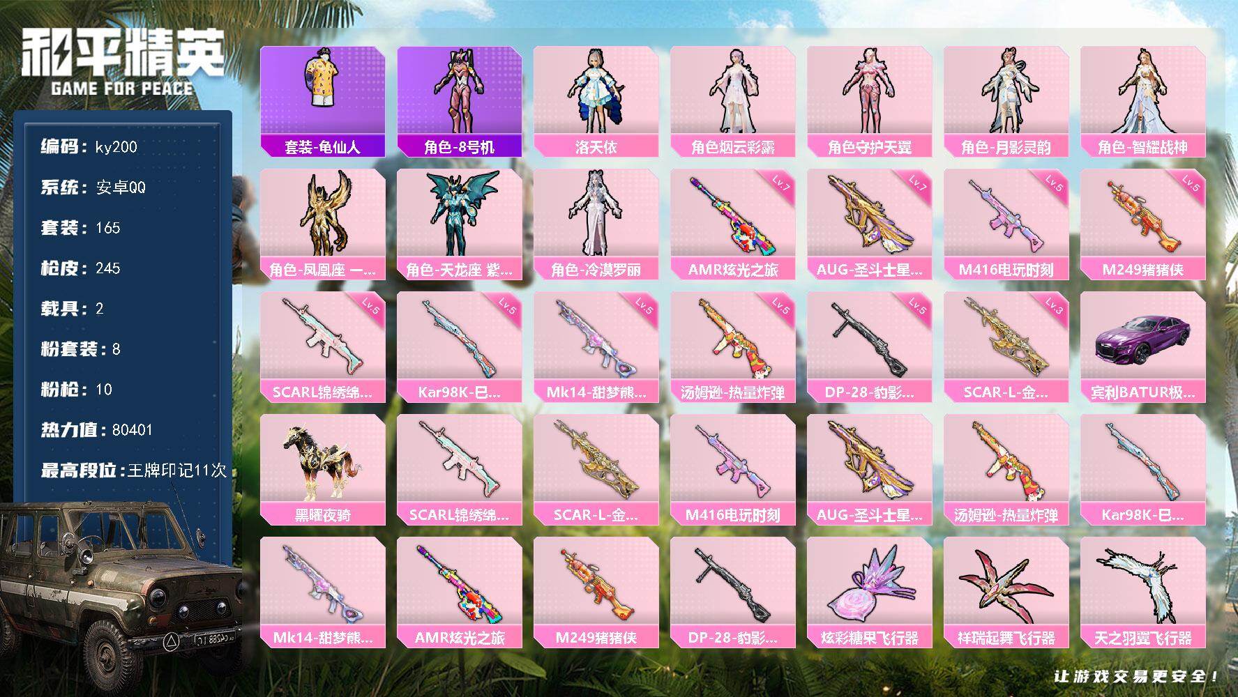 [16882735]安卓 手Q-8粉装-10特效枪-2载具-10粉色飞行器-80401热力值-11王牌印记-165套装-245枪皮