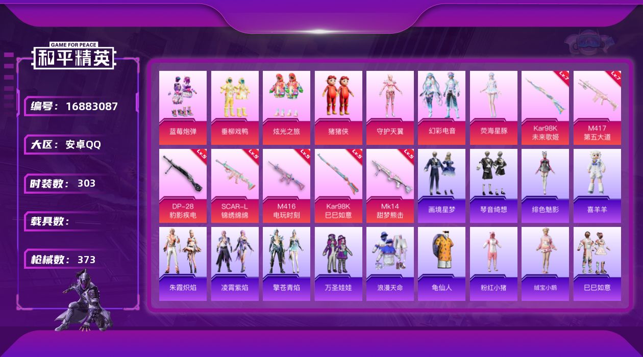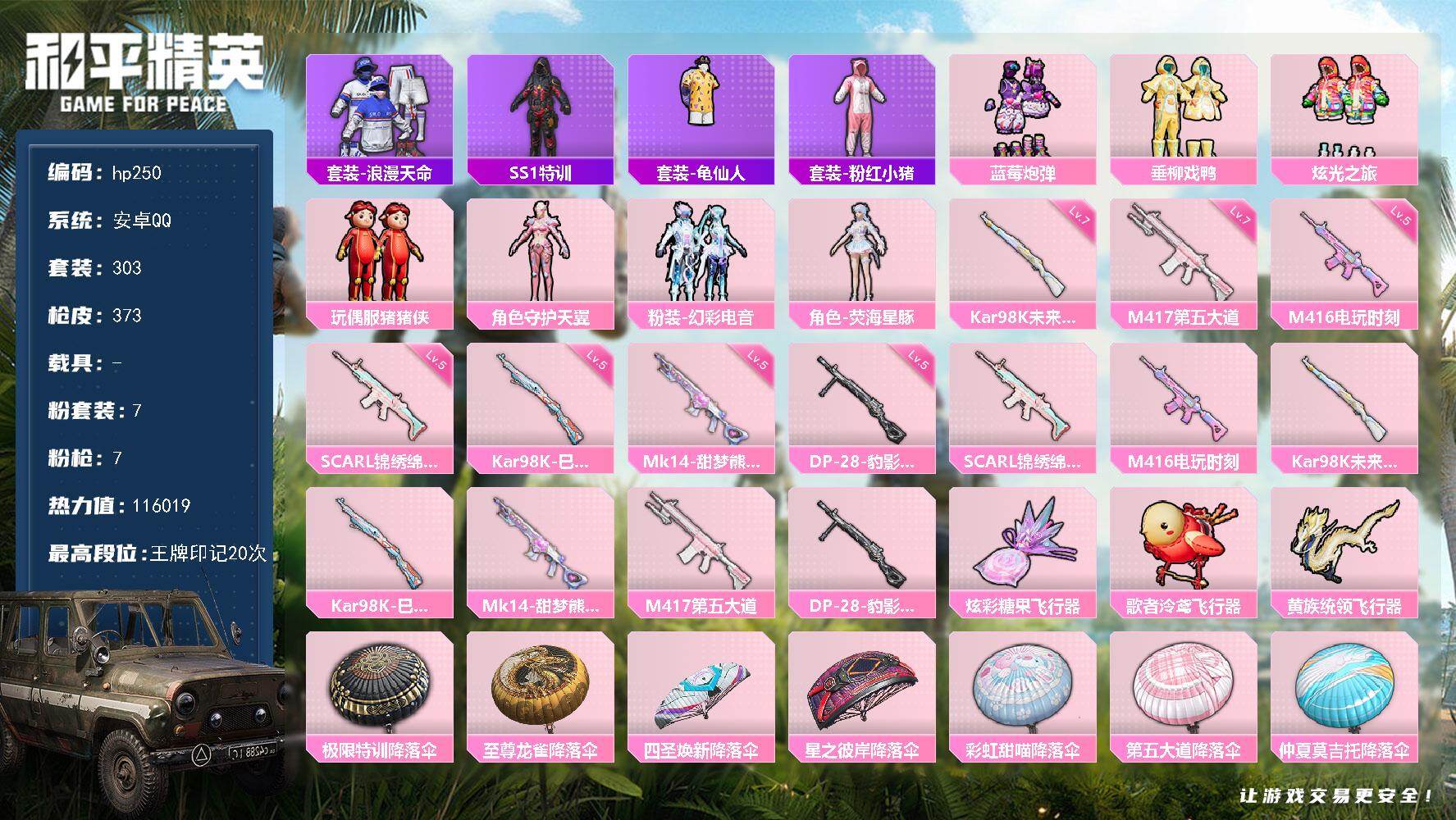 [16883087]安卓 手Q-7粉装-7特效枪-0载具-3粉色飞行器-116019热力值-20王牌印记-303套装-373枪皮 【热门品类】:套装-浪漫天命,套装-SS1特训,套装-龟仙人,套装-粉红小猪 【粉色套装】:粉装-蓝莓炮弹,粉装-垂柳戏鸭,粉装-炫光之旅,玩偶服-猪猪侠,角色-守护天翼,粉装-幻彩电音,角色-荧海星豚 【粉色枪皮等级】:SCAR-L-锦绣绵绵(五级),M416-电玩时刻(五级),Kar98K-未来歌姬(七级),Kar98K-巳巳如意(五级),Mk14-甜梦熊击(五级),M417-第五大道(七级),DP-28-豹影疾电(五级) 【粉色枪皮】:SCAR-L-锦绣绵绵,M416-电玩时刻,Kar98K-未来歌姬,Kar98K-巳巳如意,Mk14-甜梦熊击,M417-第五大道,DP-28-豹影疾电 【粉色飞行器】:炫彩糖果飞行器,歌者泠鸢飞行器,黄族统领飞行器 【粉色降落伞】:极限特训降落伞,至尊龙雀降落伞,四圣焕新降落伞,星之彼岸降落伞,彩虹甜喵降落伞,第五大道降落伞,仲夏莫吉托降落伞,圣堂之誓降落伞,猪猪侠降落伞,江南烟雨降落伞,精灵梦叶罗丽降落伞,创世·救赎降落伞,初号机 觉醒Ver.降落伞,金丰海韵降落伞,忍者神龟降落伞,樱桃泡泡降落伞,星穹咏叹调降落伞,幻彩电音降落伞,时光之誓降落伞,双重狂想降落伞,冷漠罗丽降落伞,荧海星豚降落伞,绯穹魔姬降落伞,喜羊羊与灰太狼降落伞,炫彩糖果降落伞 【稀有套装】:套装-龟仙人,套装-绒宝小鹅,套装-巳巳如意,套装-圣穹绘梦,套装-暖暖向日葵,套装-荒原牛仔,套装-雏菊兔兔,套装-萝兰蝴蝶,套装-小熊娃娃,角色-狂花道·雅典娜,套装-糖糖葫芦,套装-青团波波,角色-怀庆长公主,套装-旋风灵鼠,套装-焰舞炽心,套装-紫幽梦,套装-蓝冰羽,套装-极速光影,套装-彩虹兔,套装-云朵鹅,套装-雪绒豹,套装-诡诞巡游,角色-乐音,角色-玫纹锢梦,角色-黯羽织刑,套装-蓝海鲸歌,角色-绛羽幽主,角色-夜瞳黯灵,套装-朱霞炽焰,套装-凌霄紫焰,套装-擎苍青焰,玩偶服-喜羊羊,角色-绯色魅影,套装-画境星梦,套装-琴音绮想,角色-馥郁金蕊 【稀有枪皮】:AKM-夜灯,AKM-奇异狩猎者,AKM-彩虹符号,AKM-生命誓言,AKM-破晓战魂,AKM-萌趣颜团子,AKM-虎虎生威,AKM-锦绣火鲤,AKM-霓虹街区,AKM-龙的传人,M1