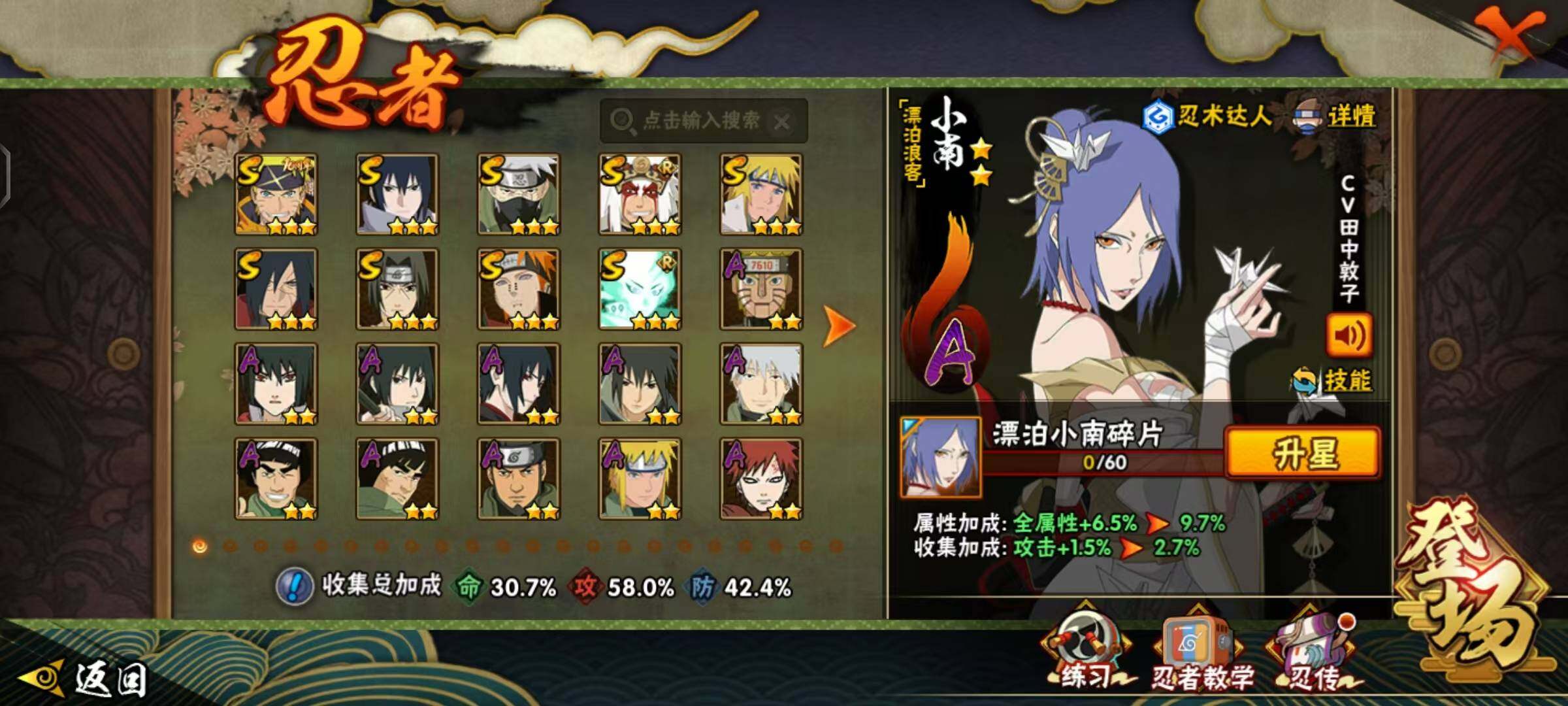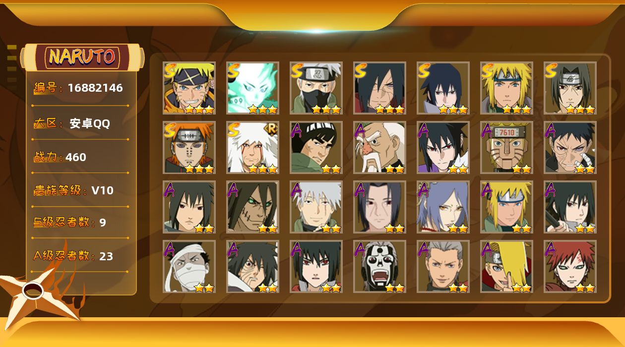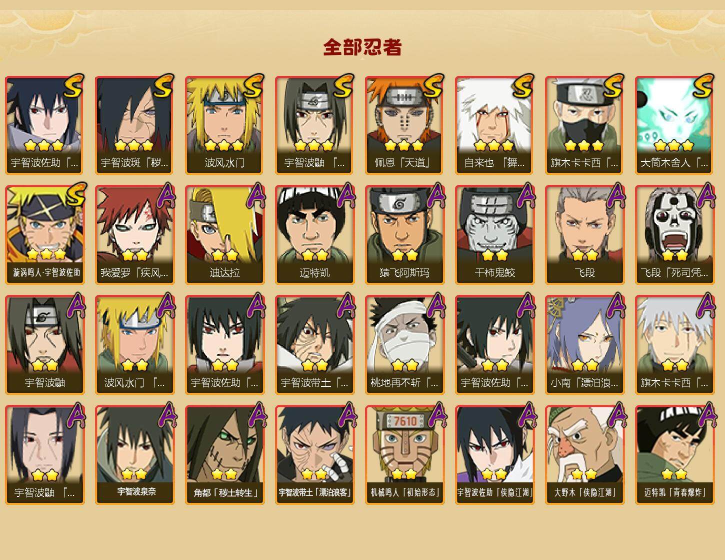 【S级忍者】:宇智波斑「秽土转生·解」(3星),宇智波鼬「须佐能乎」(3星),旗木卡卡西「须佐能乎」(3星),自来也「舞之豪杰」(3星),波风水门(3星),佩恩「天道」(3星),宇智波佐助「永恒万花筒」(3星),大筒木舍人「最终章」(3星),漩涡鸣人·宇智波佐助(3星)